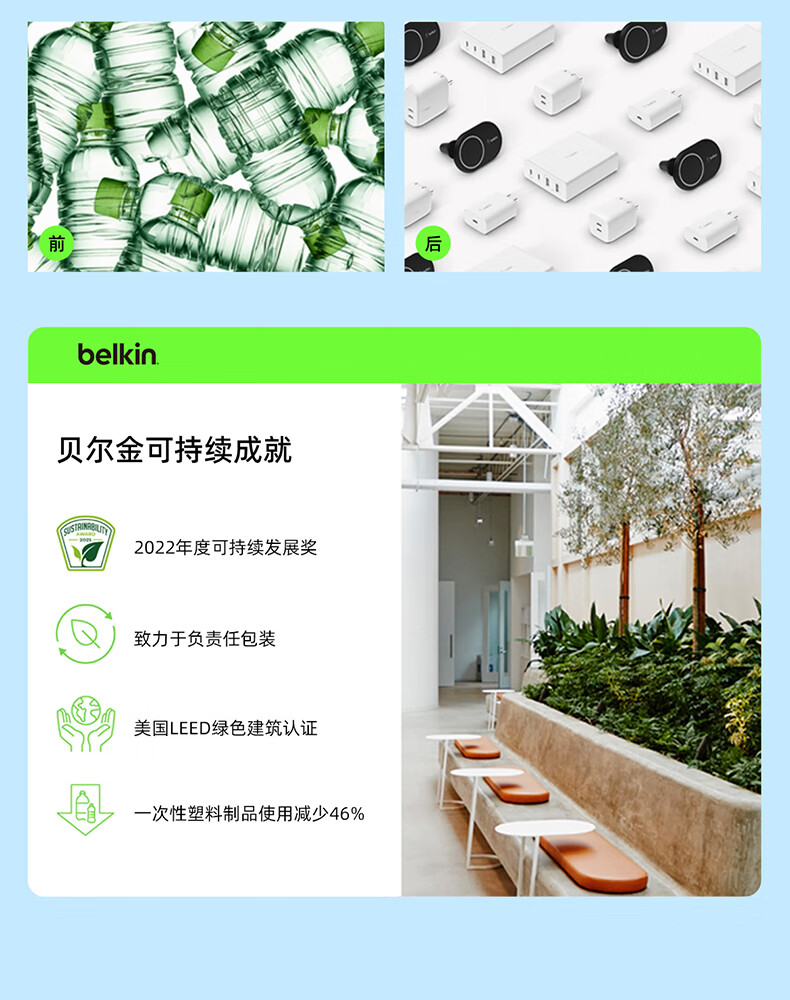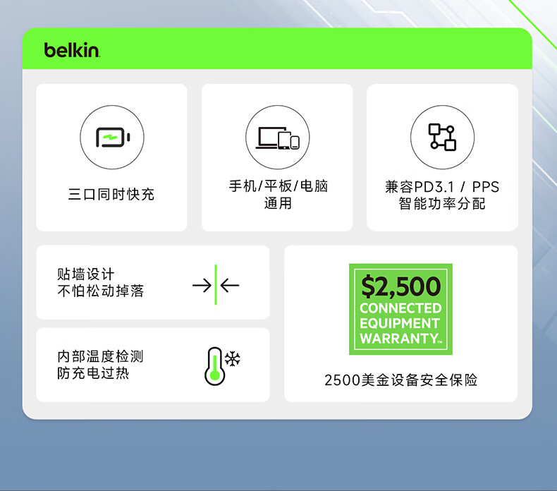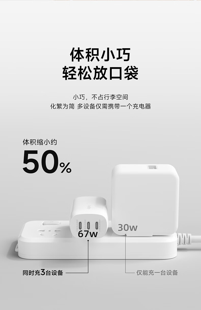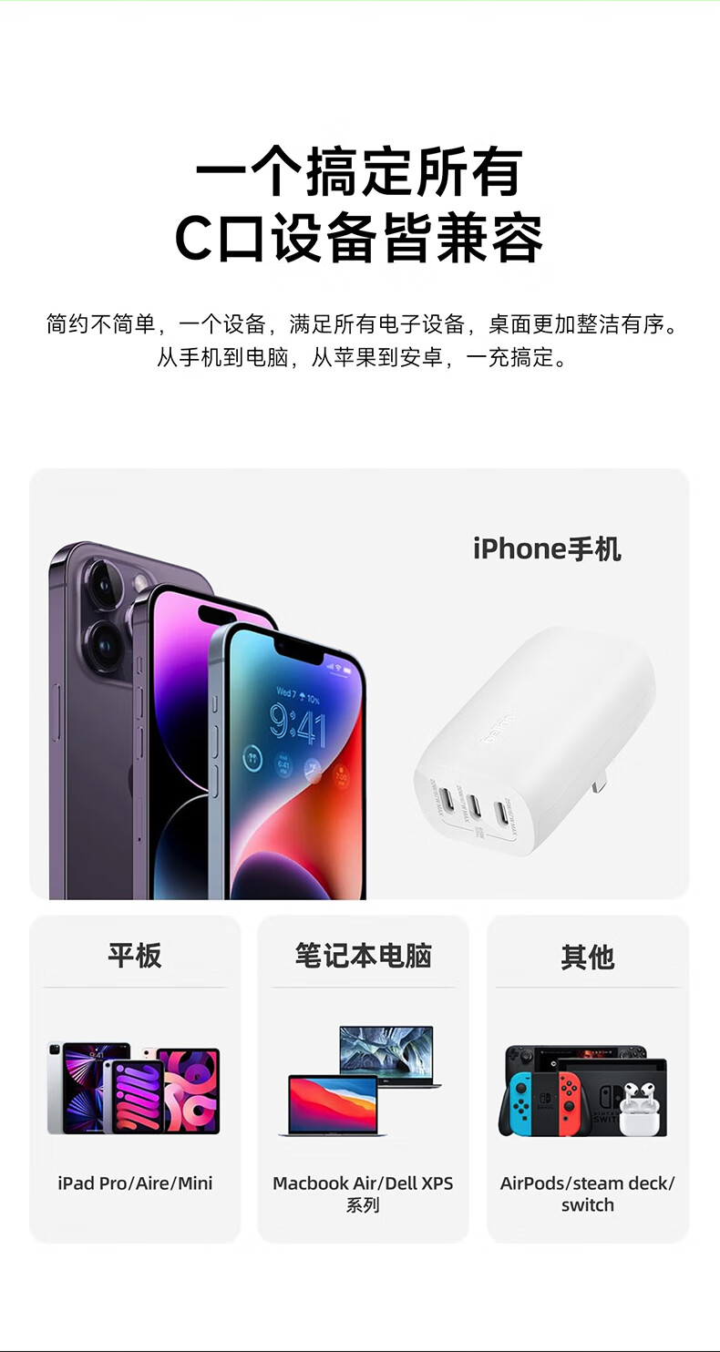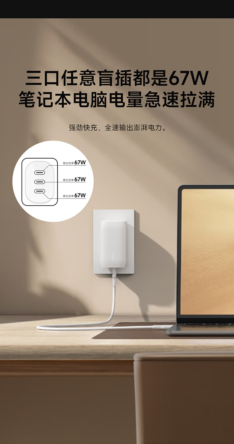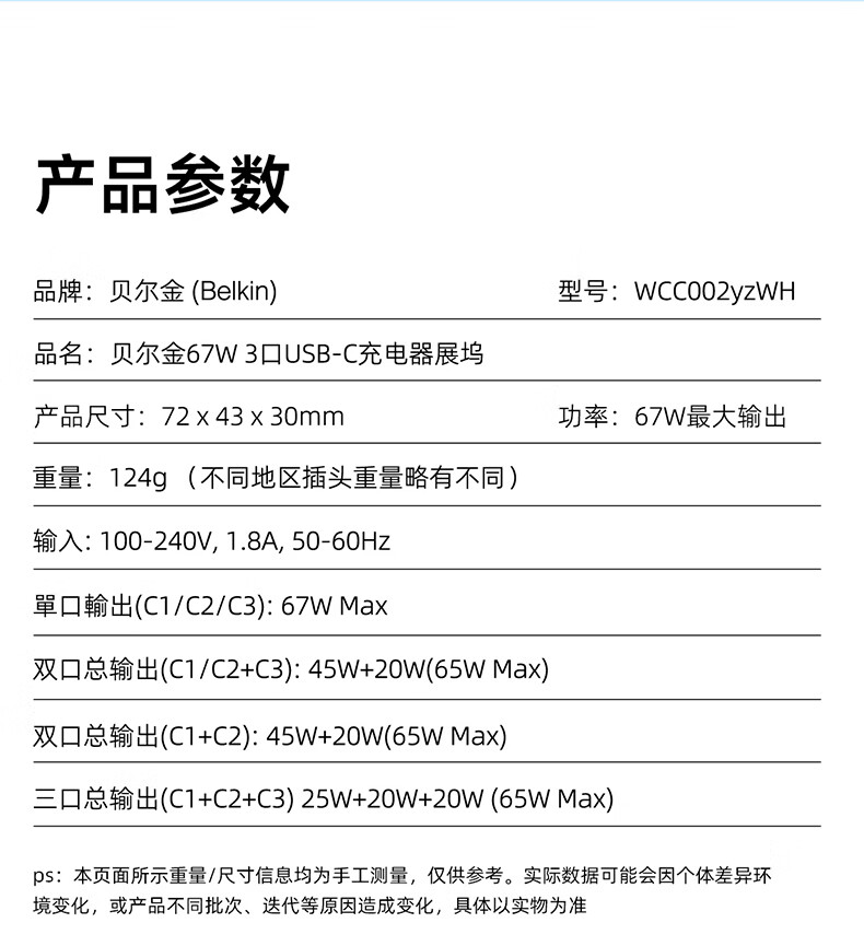 贝尔金(BELKIN)苹果充电器 67W快充头盲插三口全快充Type-C充电头 PD协议苹果iPhone17三星充电 折叠超小 WCC002