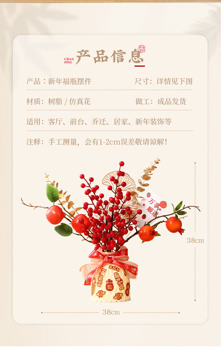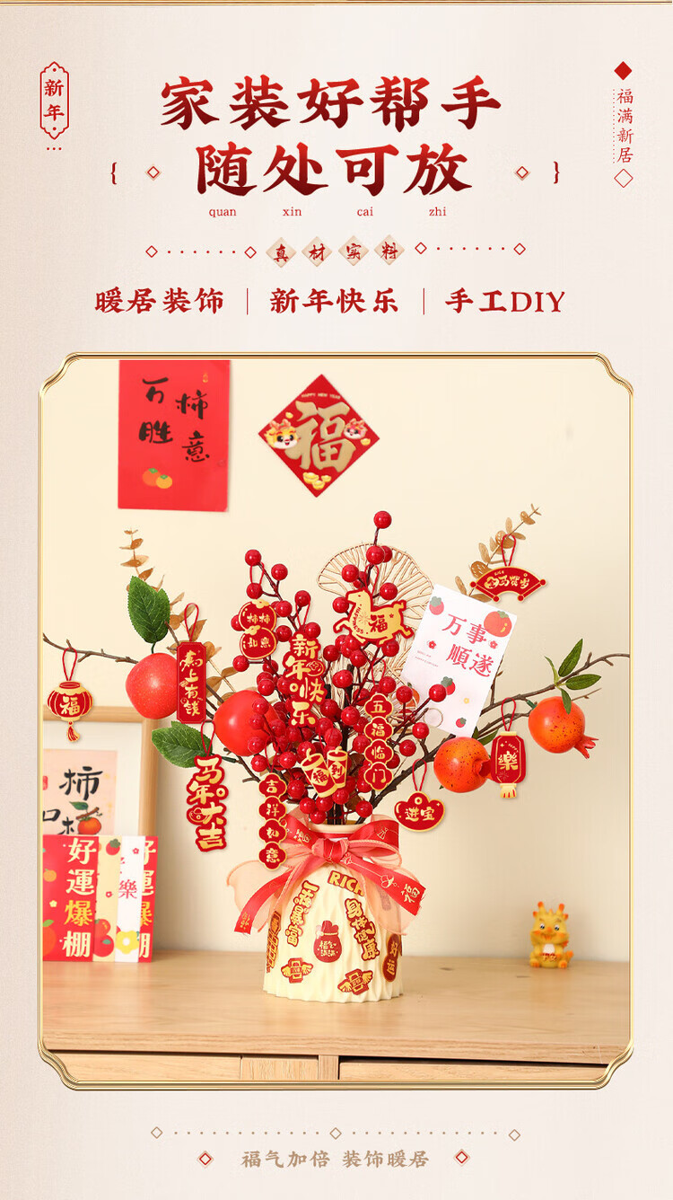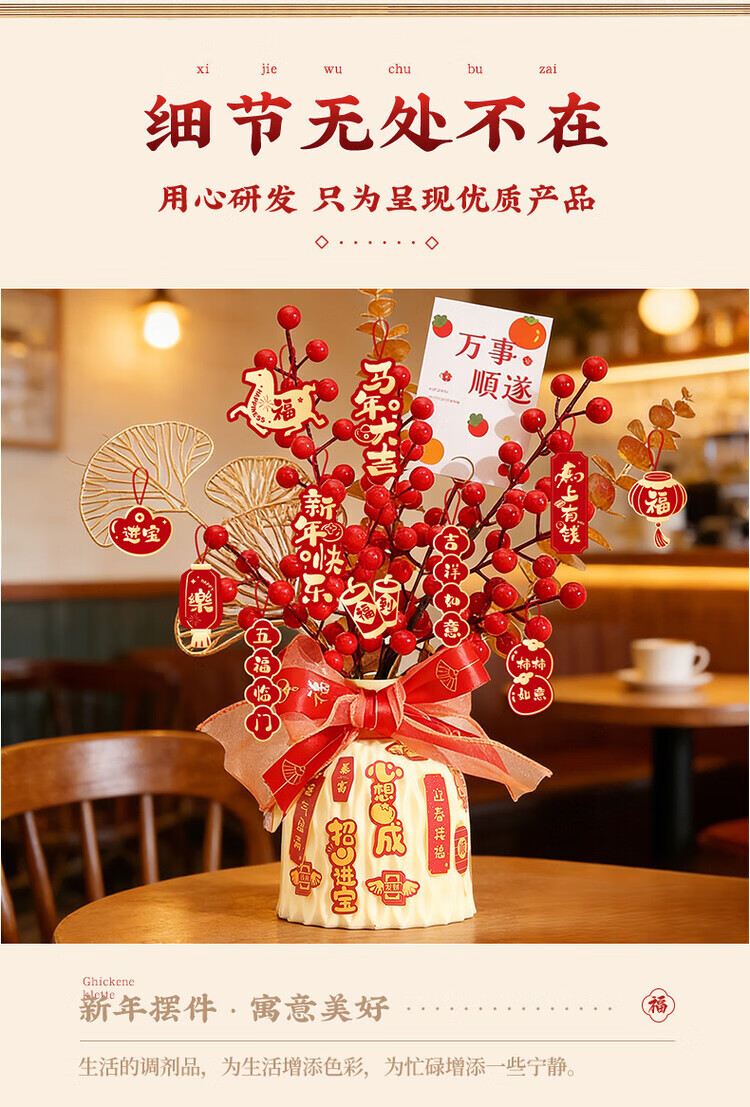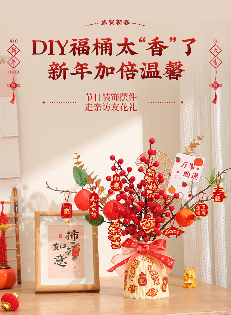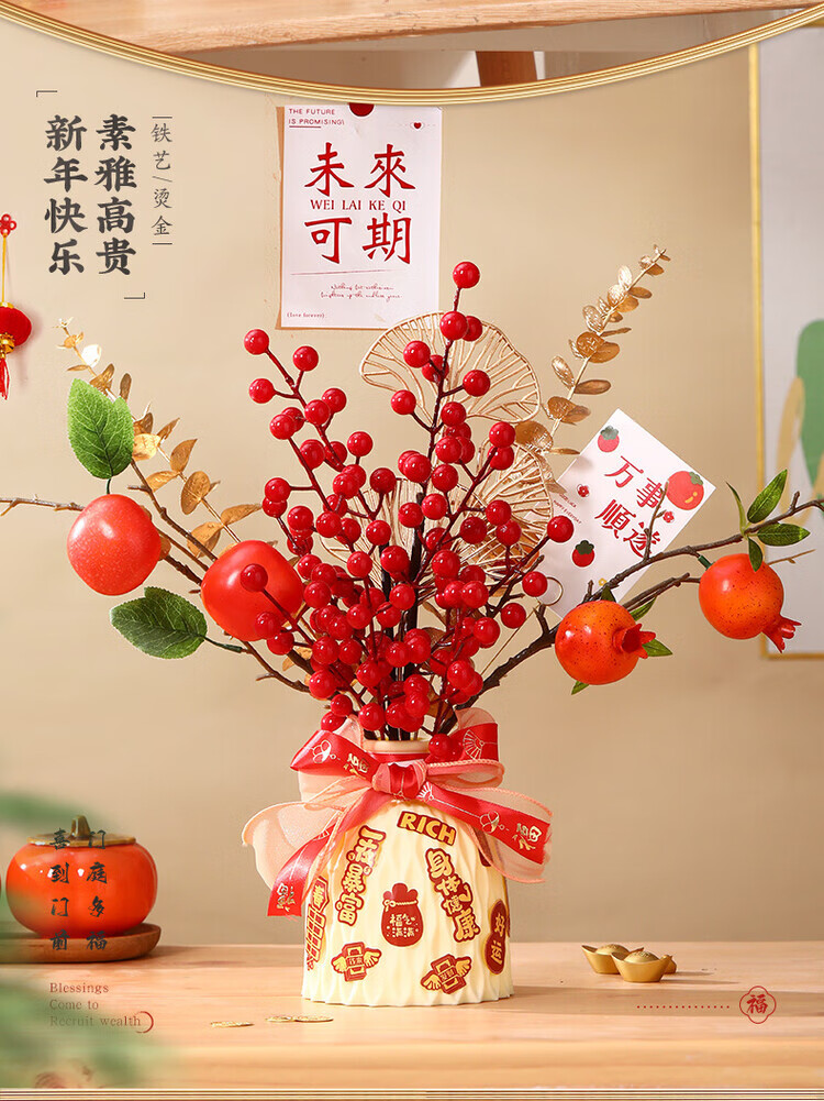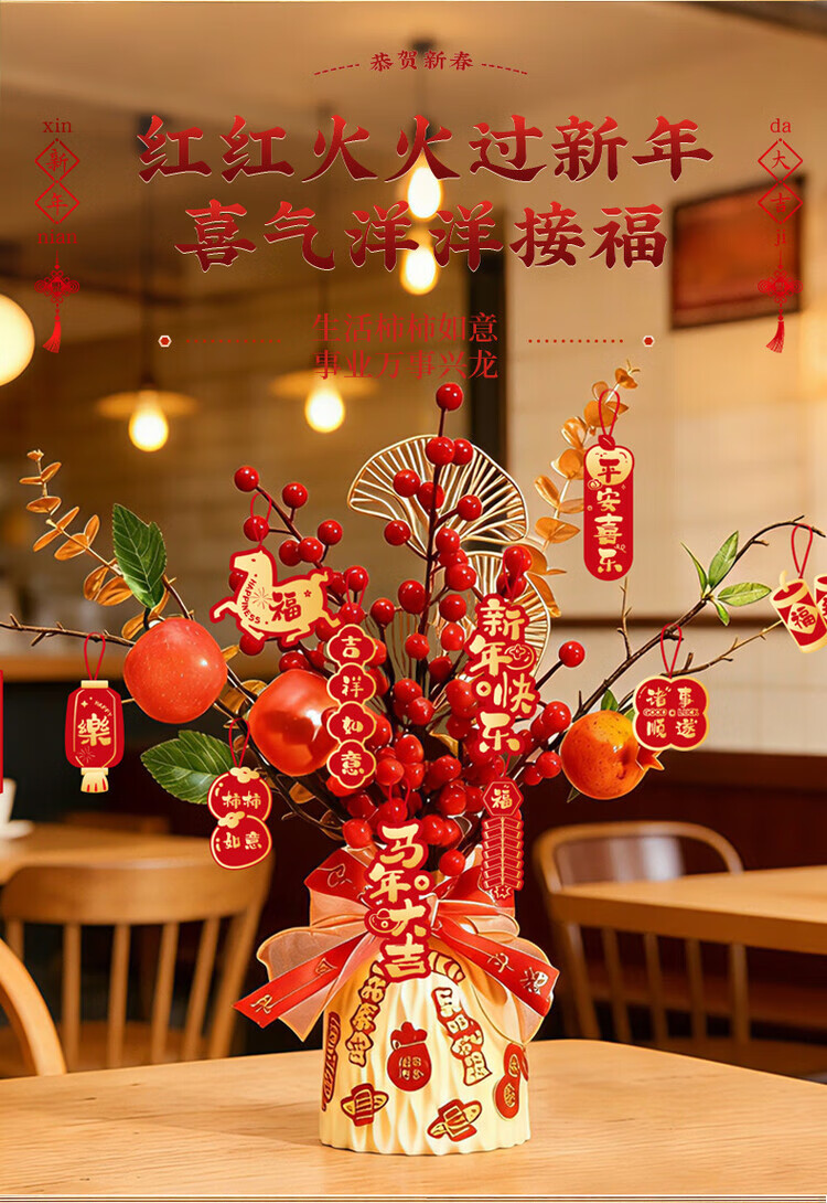 OYKTN新年摆件福瓶2026马年新款过年装饰春节仿真花束礼品新春装饰用品 【柿柿如意】吉祥瓶+【马年大吉】吊卡
