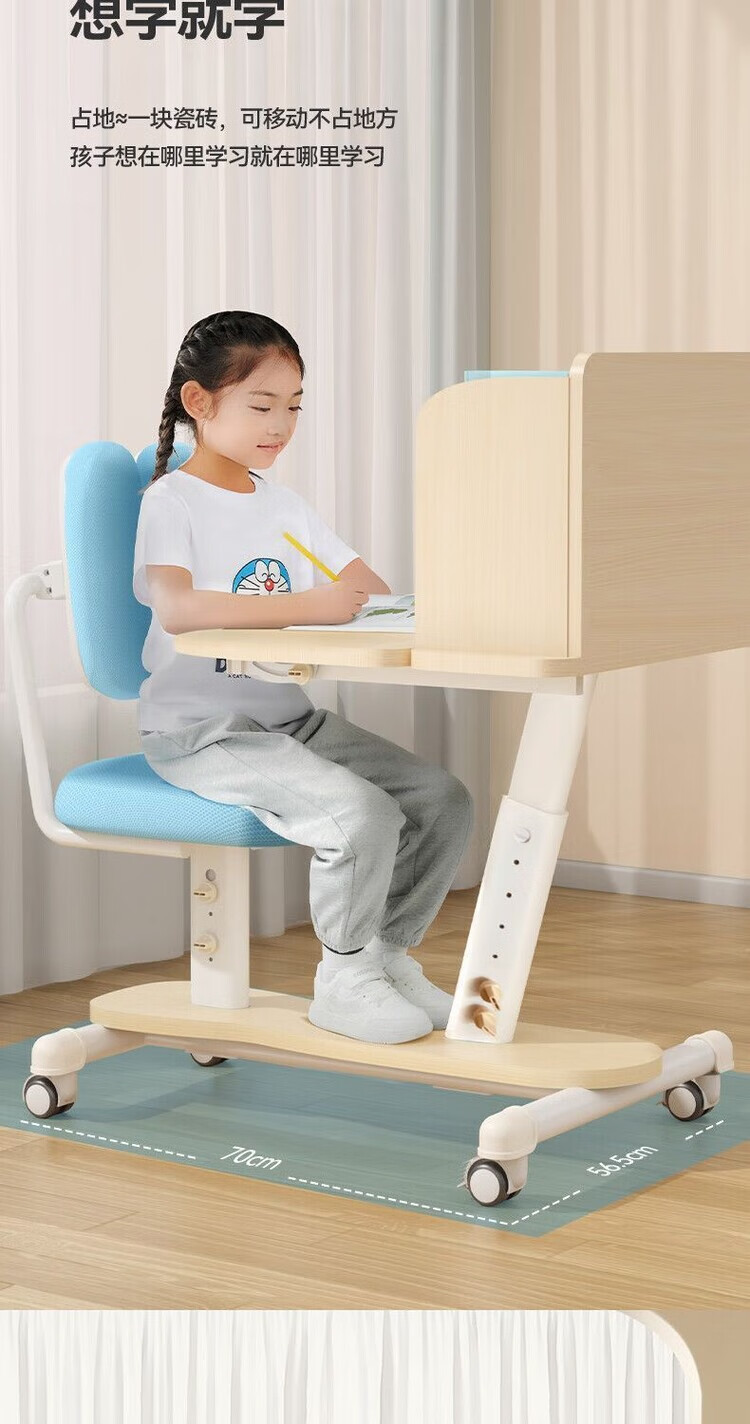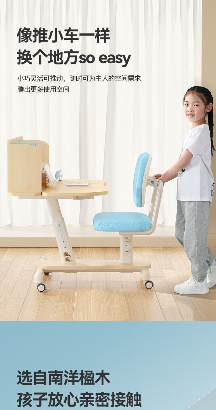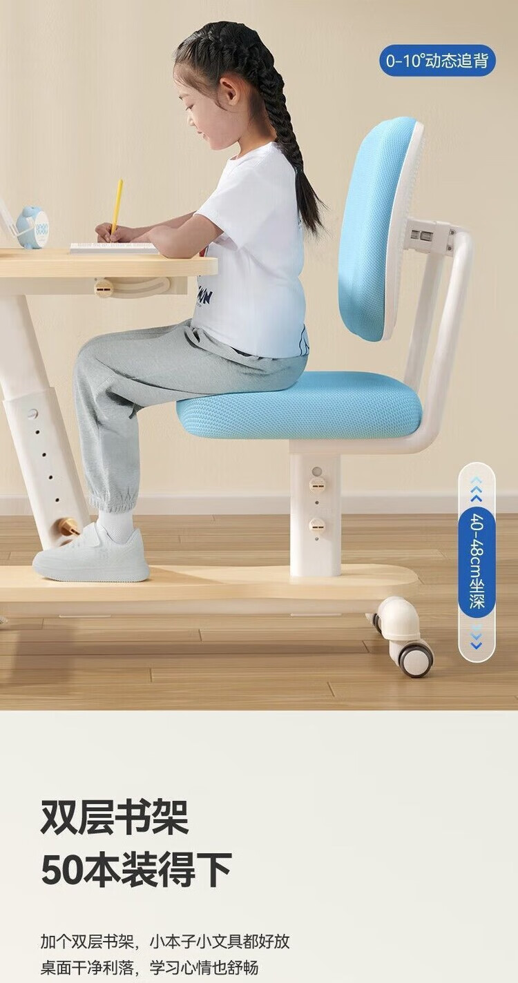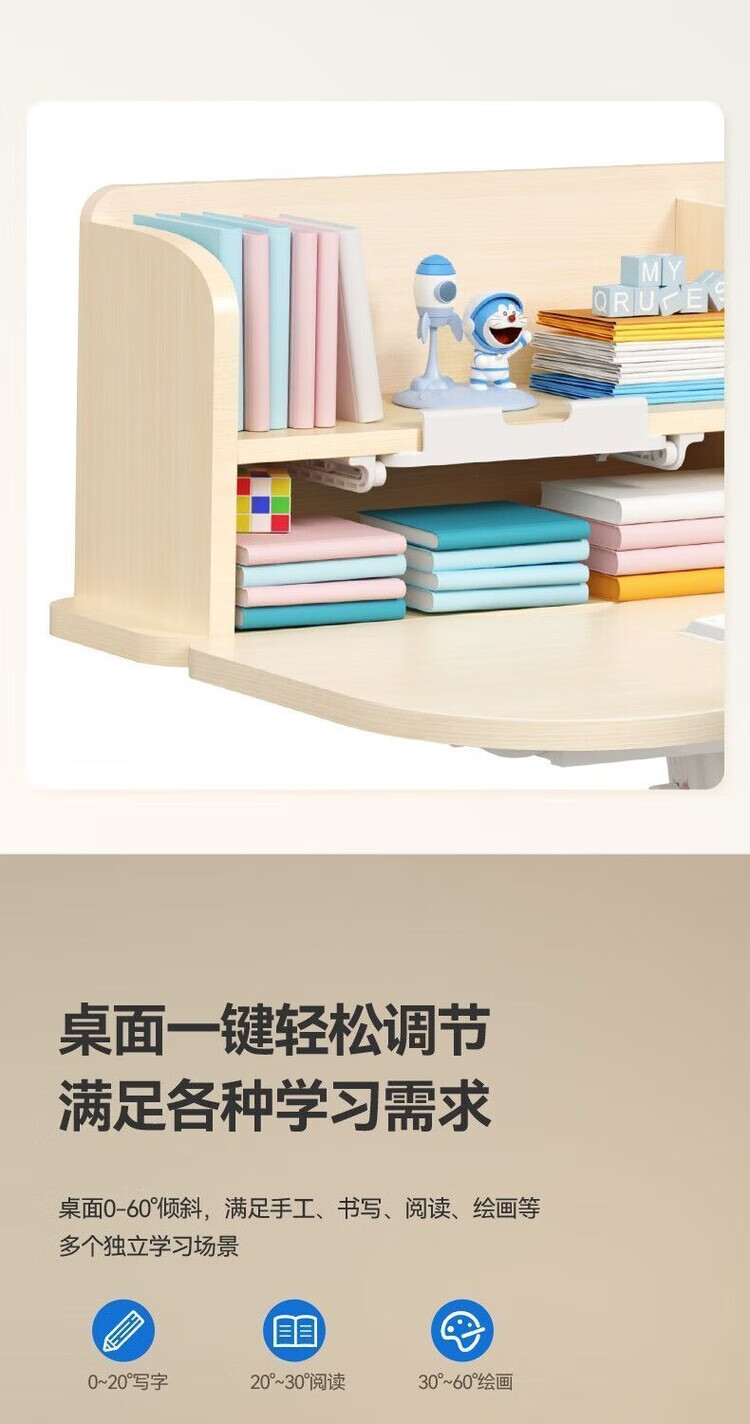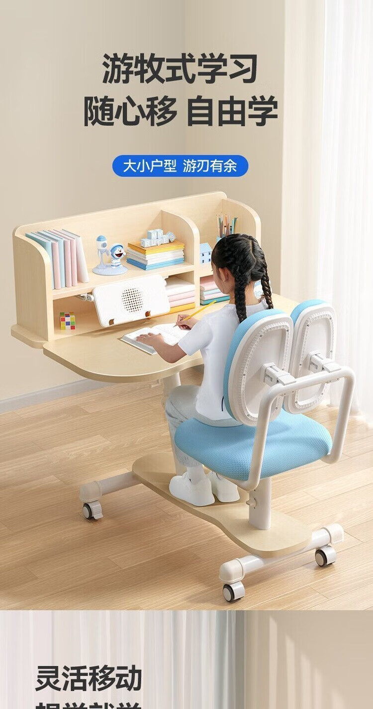 弘星隆儿童学习桌一体式小学生可升降书桌带轮可移动家用简约套装 可移动一体桌+双层书架+追背椅-粉