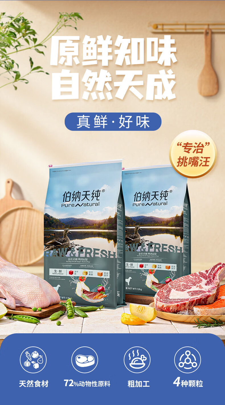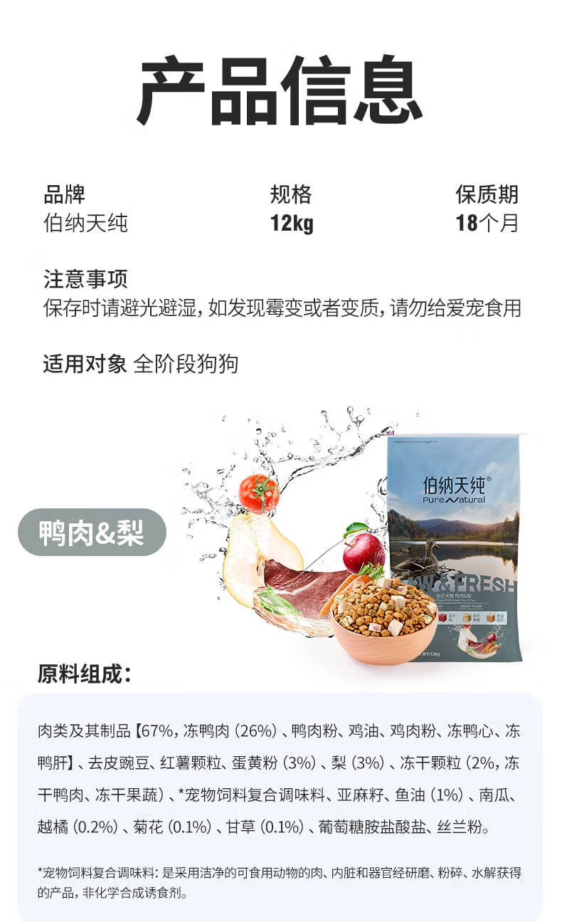伯纳天纯生鲜1.0鸭肉梨狗粮小型犬中大型犬幼犬成犬全价通用犬粮24斤/12kg