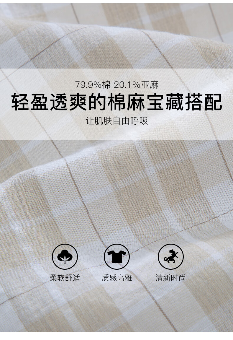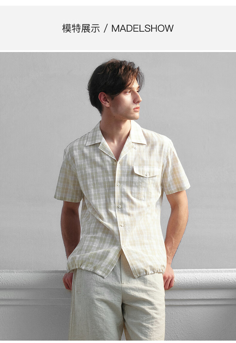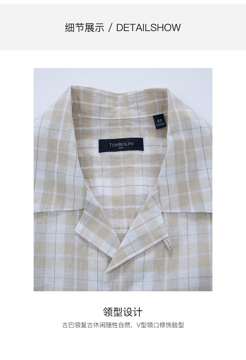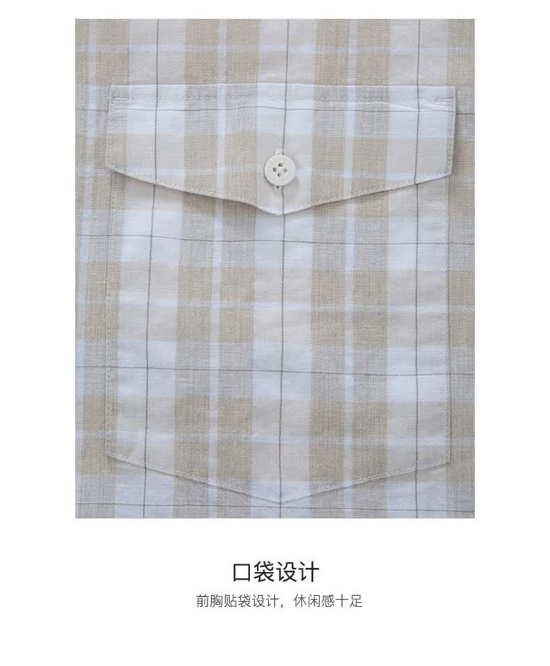 东博利尼春夏新款男士亚麻格子短袖衬衫日系复古衬衣潮 米黄色 40
