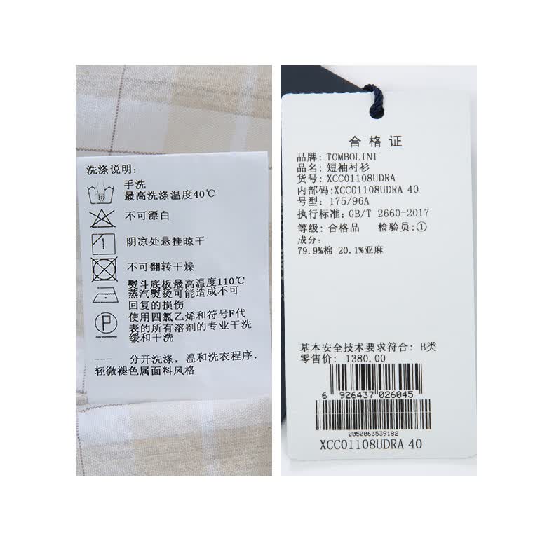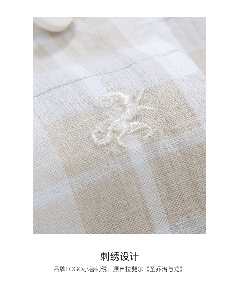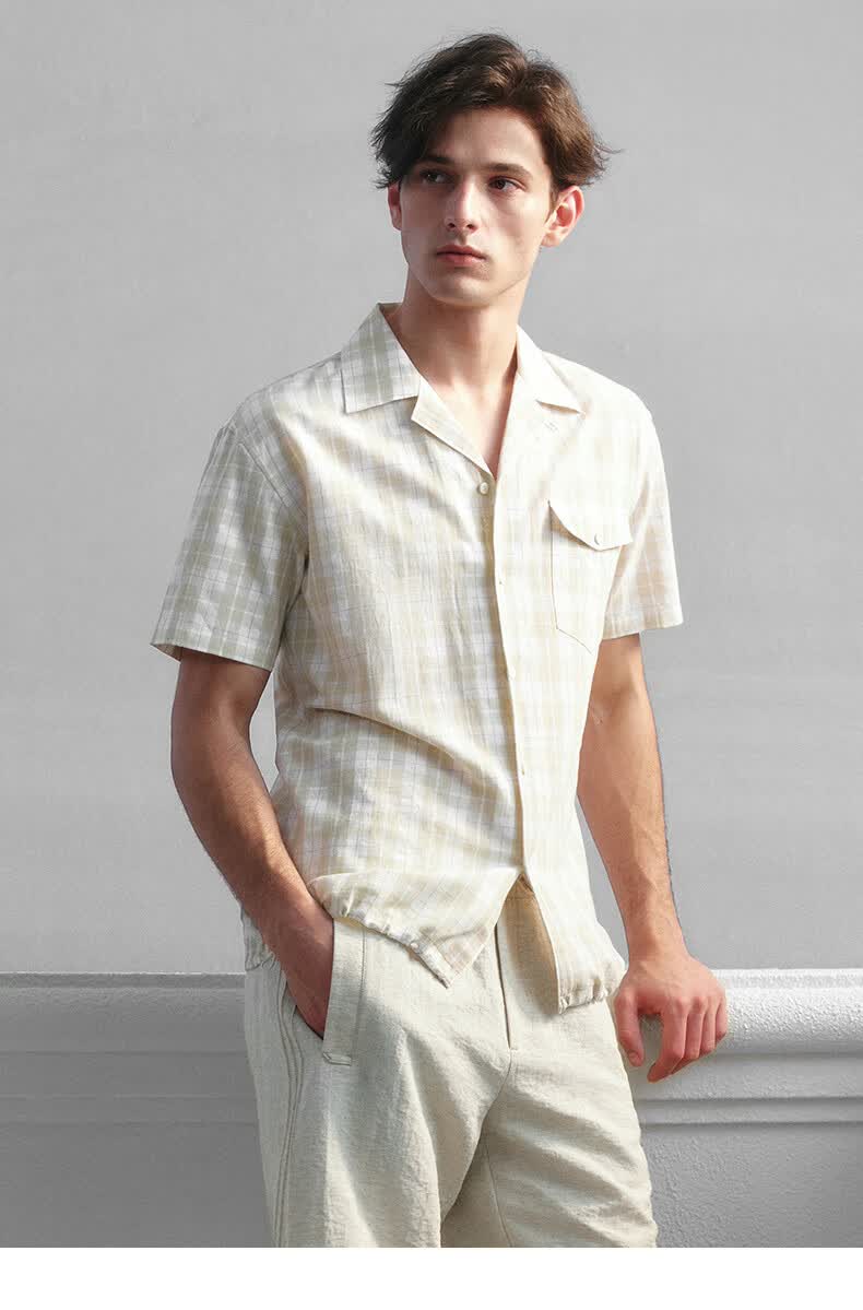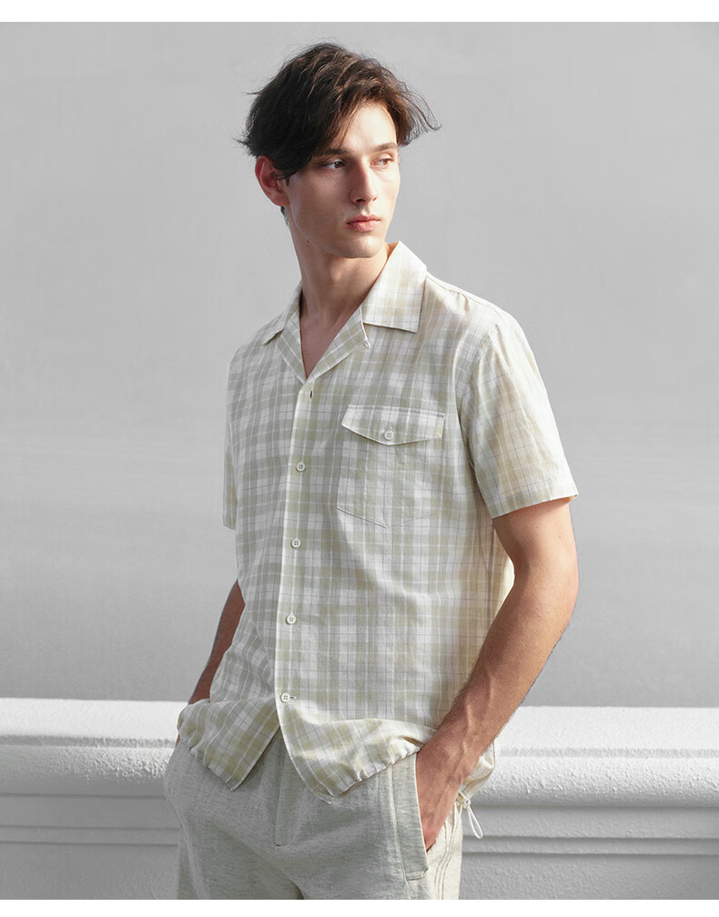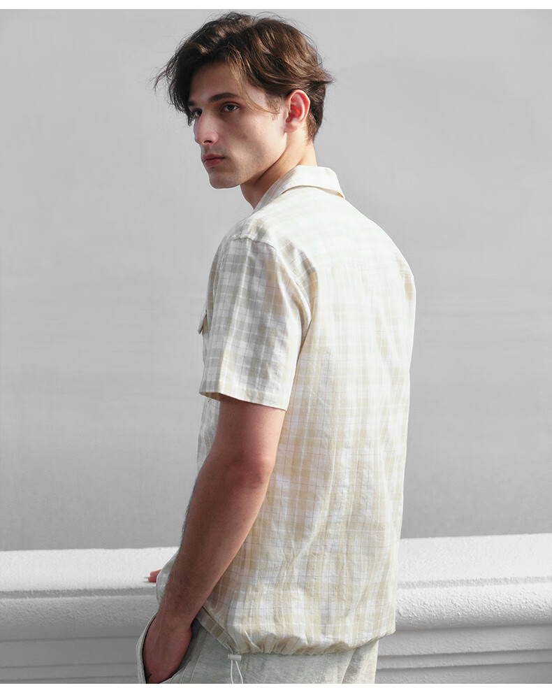 东博利尼春夏新款男士亚麻格子短袖衬衫日系复古衬衣潮 米黄色 40