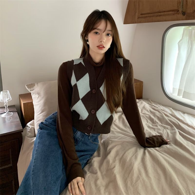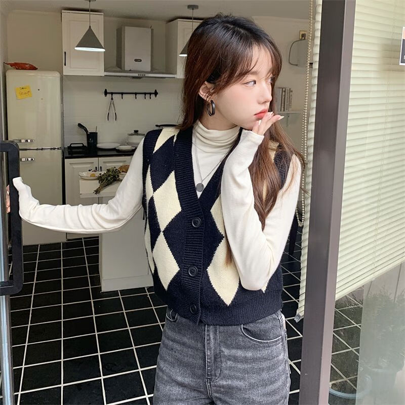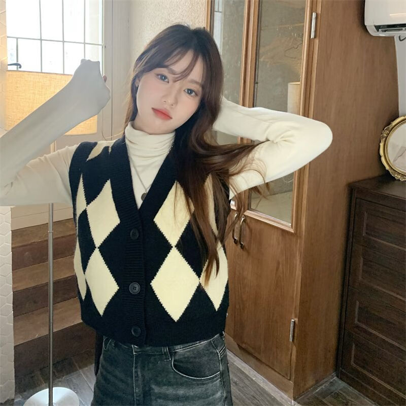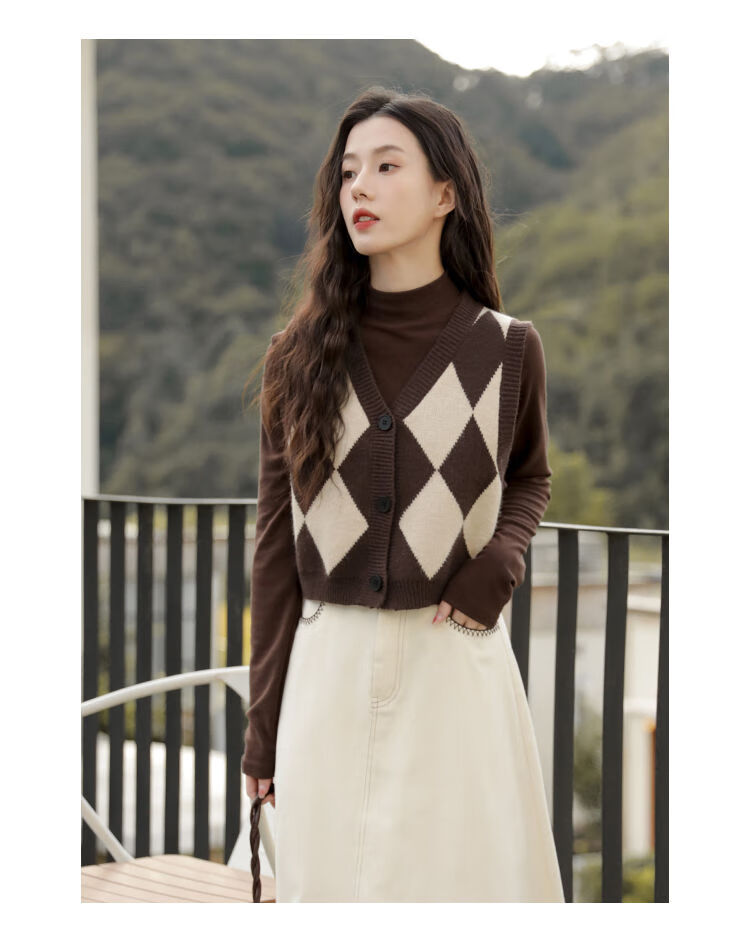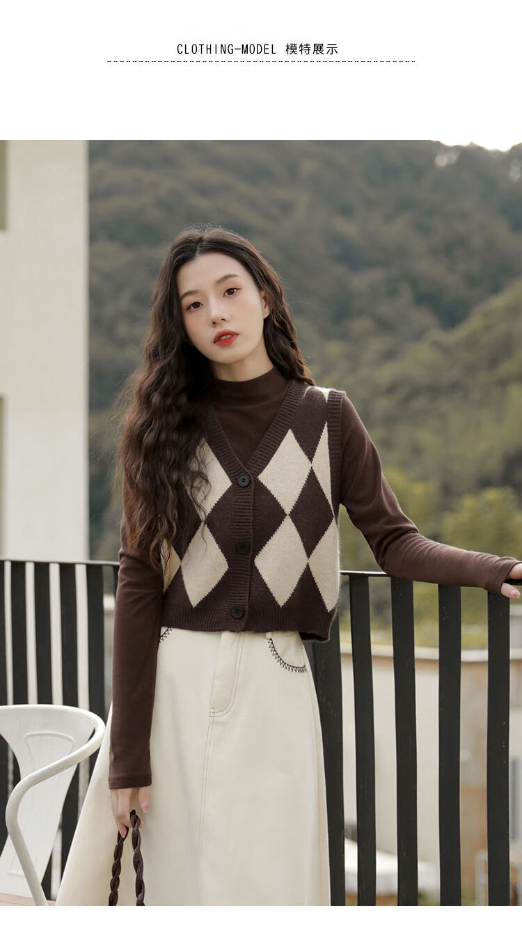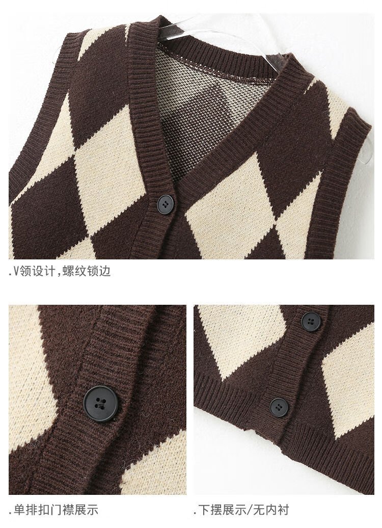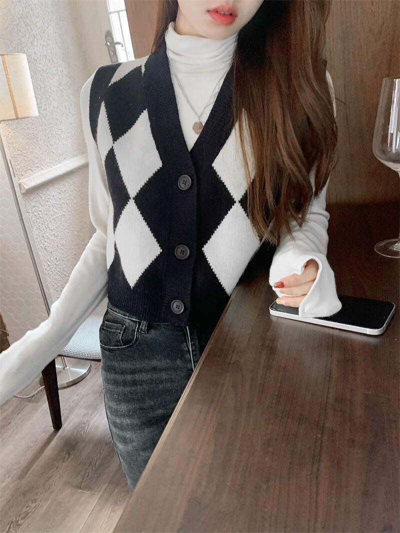 皮尔卡丹2025年春秋开衫上衣复古叠穿毛衣马夹菱格针织短款背心马甲女 黑+杏 马甲单件 M 90-105斤