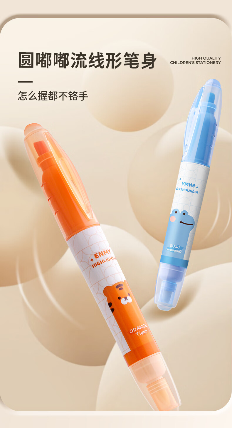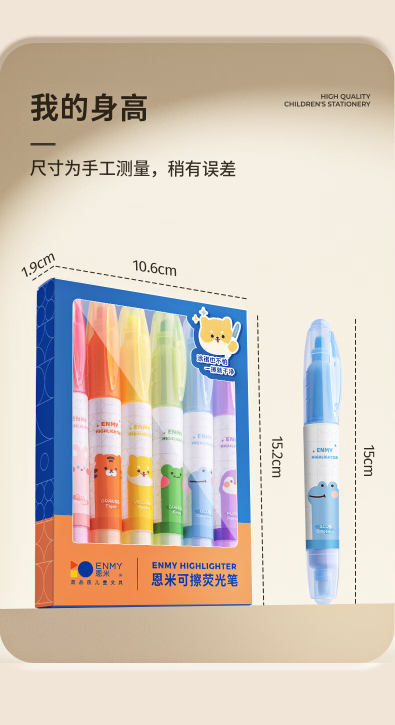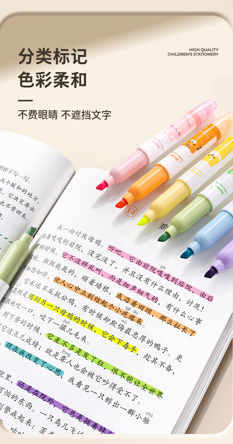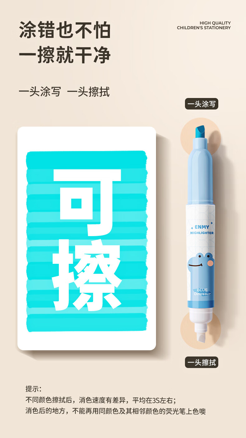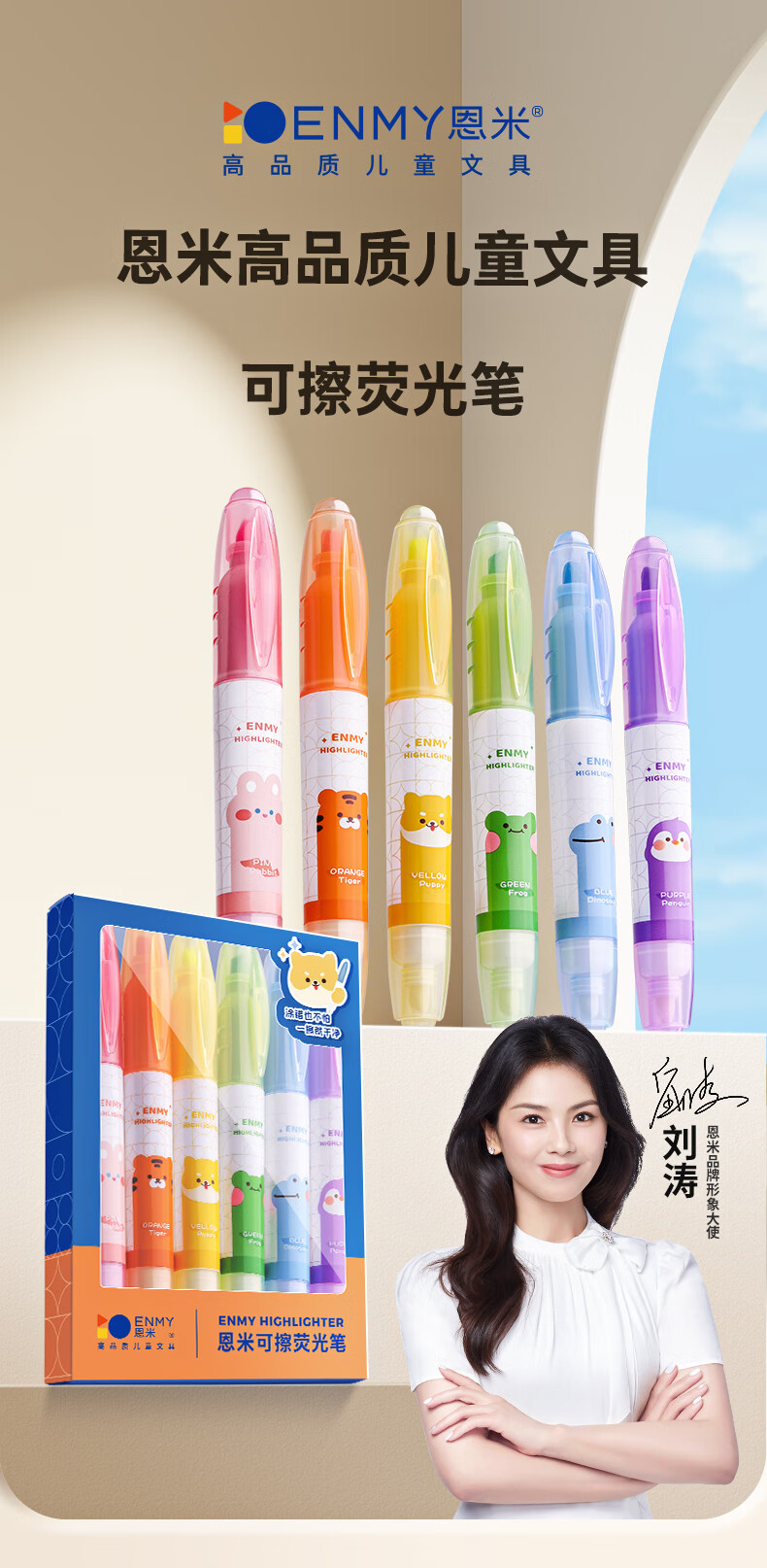 恩米enmy双头可擦荧光笔荧光色6支/盒学生复习醒目标记笔水性记号笔划重点多色笔开学礼物必备用品
