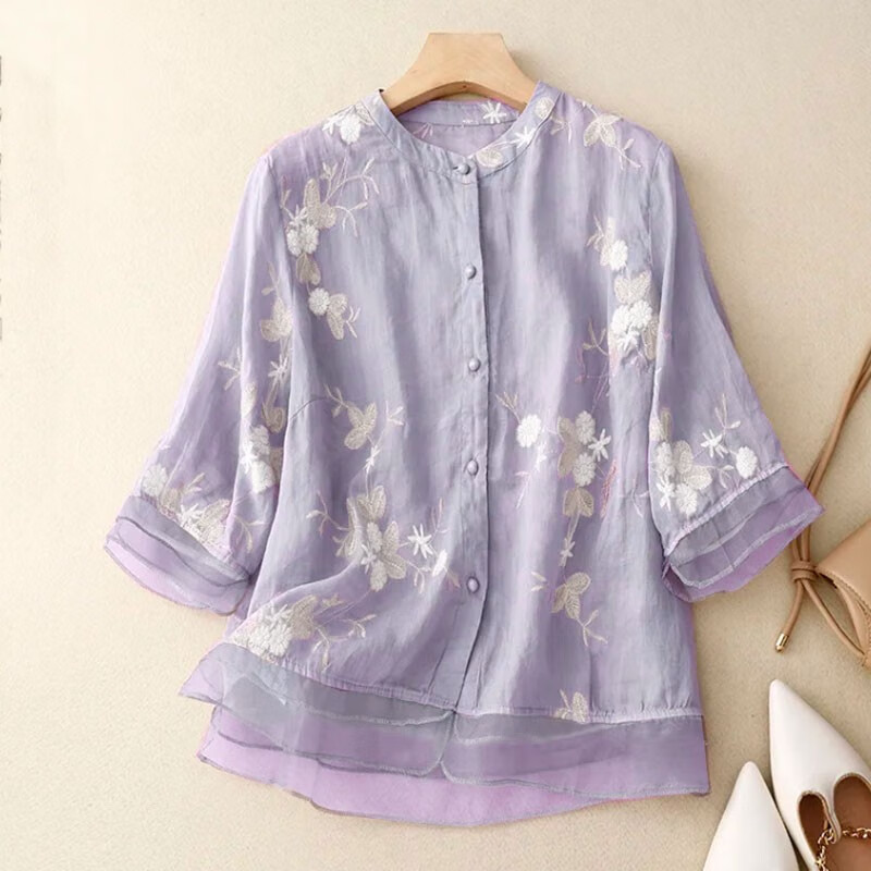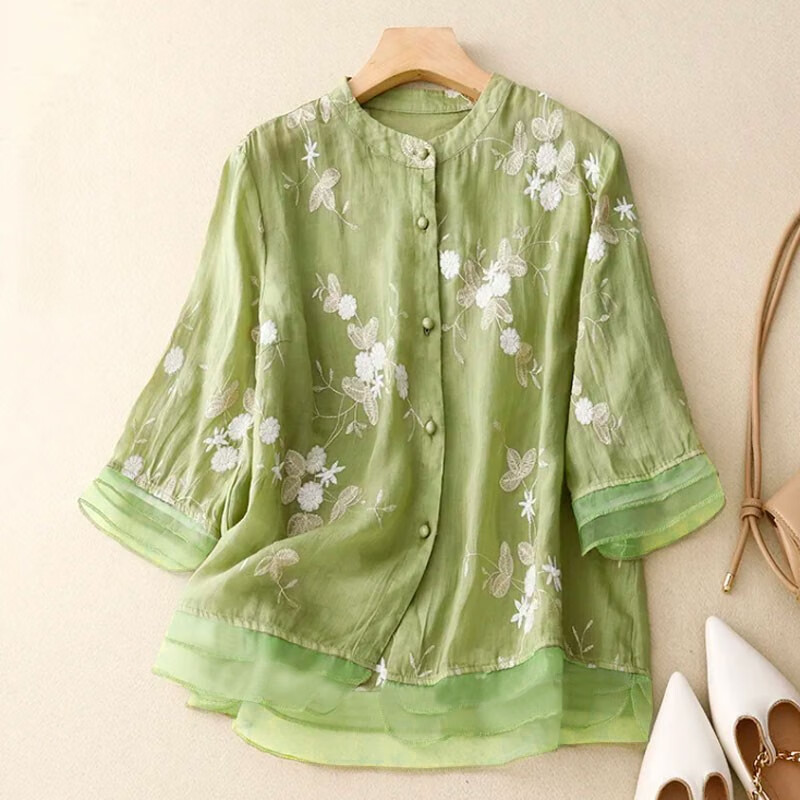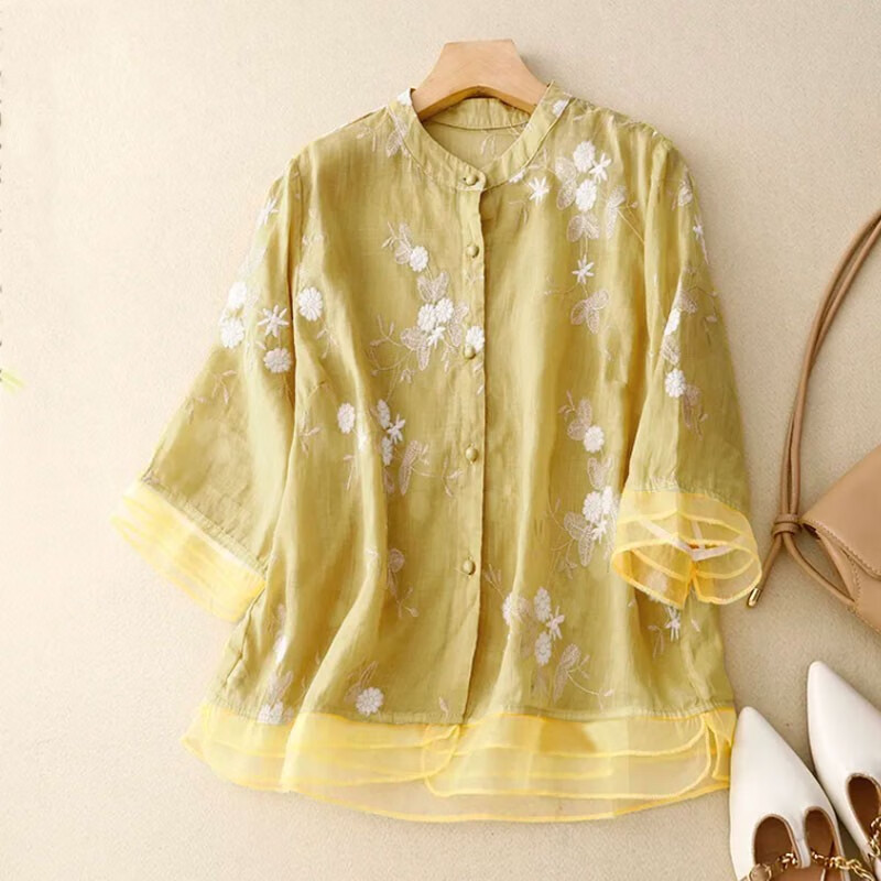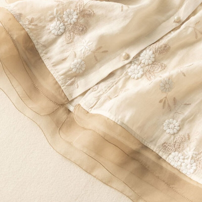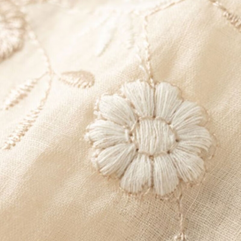 子牧棉麻夏装 女文艺复古重工刺绣衬衫上衣七分袖宽松拼接小衫2785 杏色 L (建议115-125斤)
