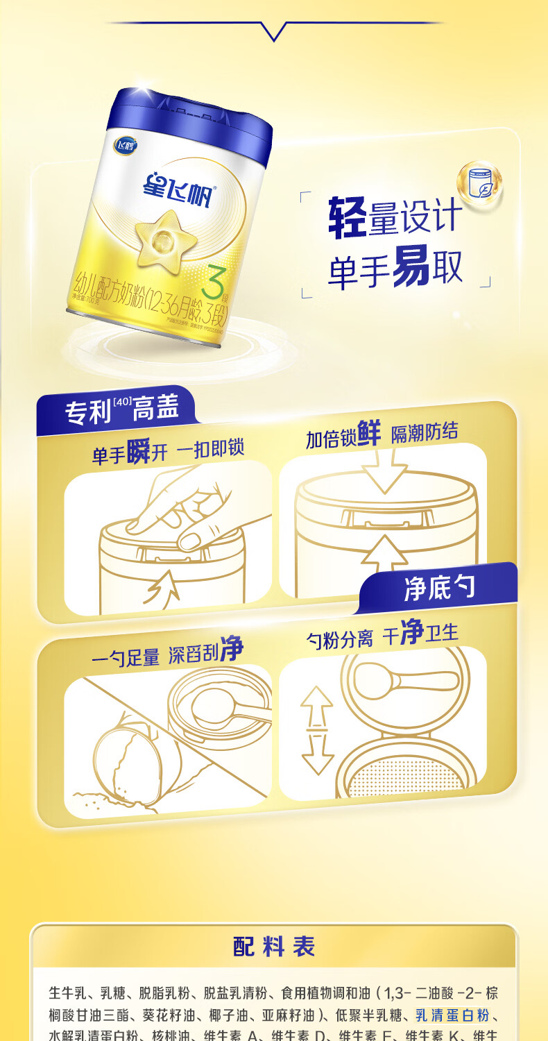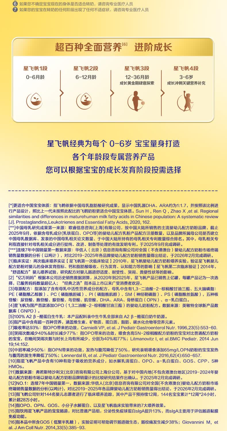 飞鹤星飞帆【5HMOs】幼儿配方奶粉3段(12-36个月适用)900克g 专利OPO 3段 900g 6罐 【咨询更便宜】