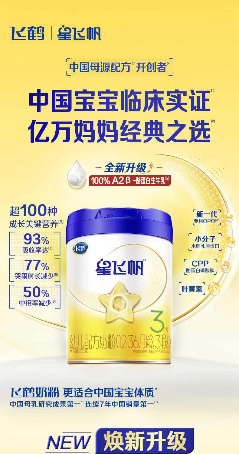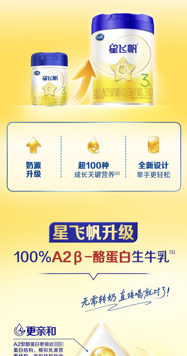 飞鹤(FIRMUS)星飞帆3段 A2-β酪蛋白奶源 幼儿配方奶粉 三段700g克 12-36个月 3段700g*6罐【咨询更优惠】
