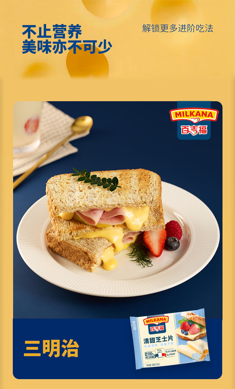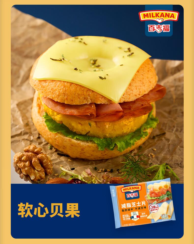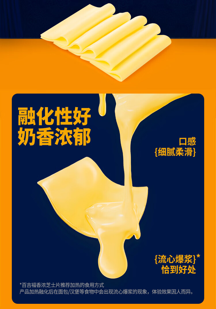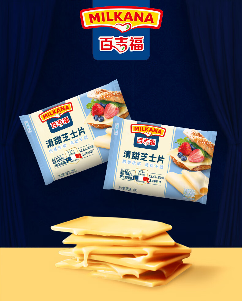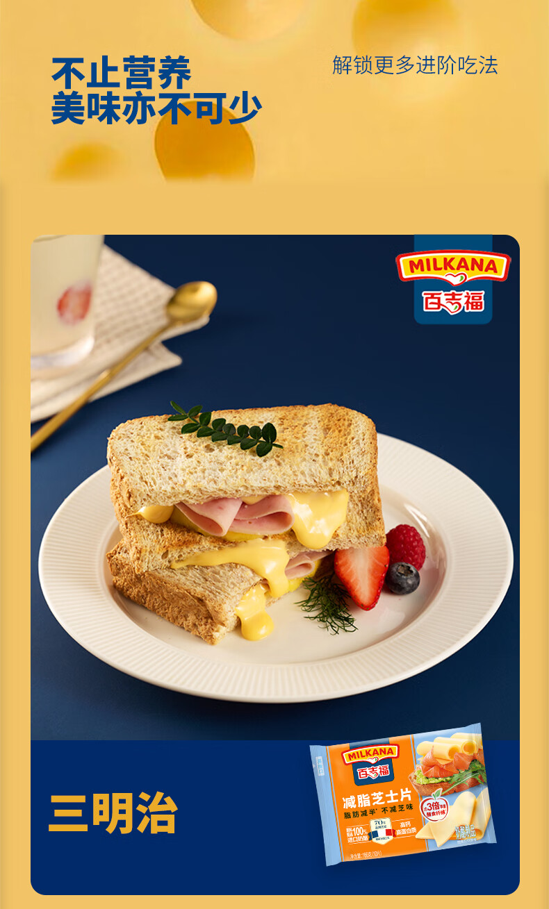 百吉福芝士片 ≥51%奶酪含量 早餐三明治汉堡烘焙原料 奶酪烘焙冷藏 166g减脂芝士片*2袋(共20片)