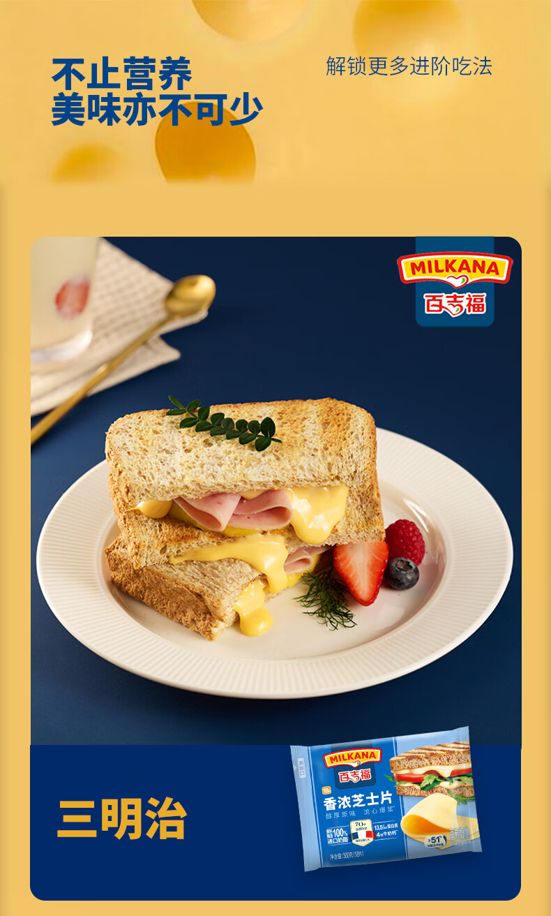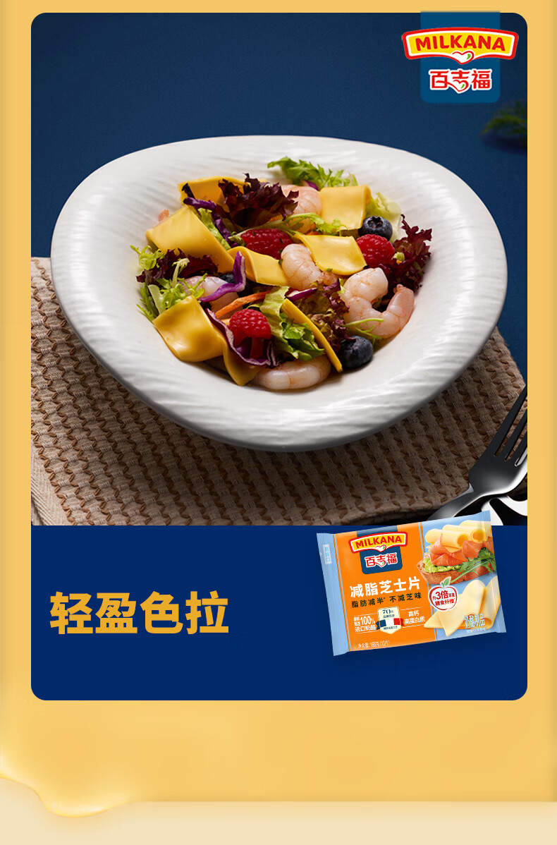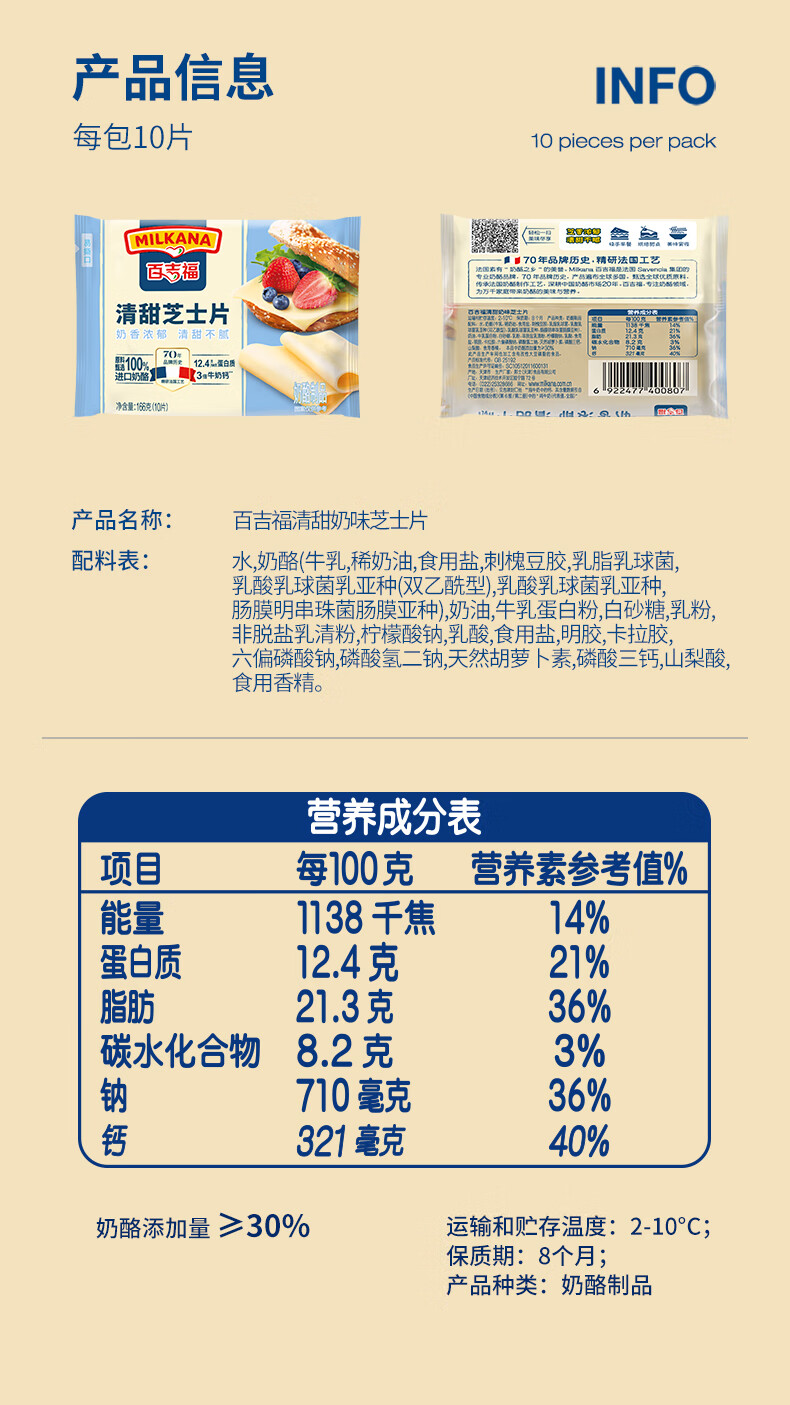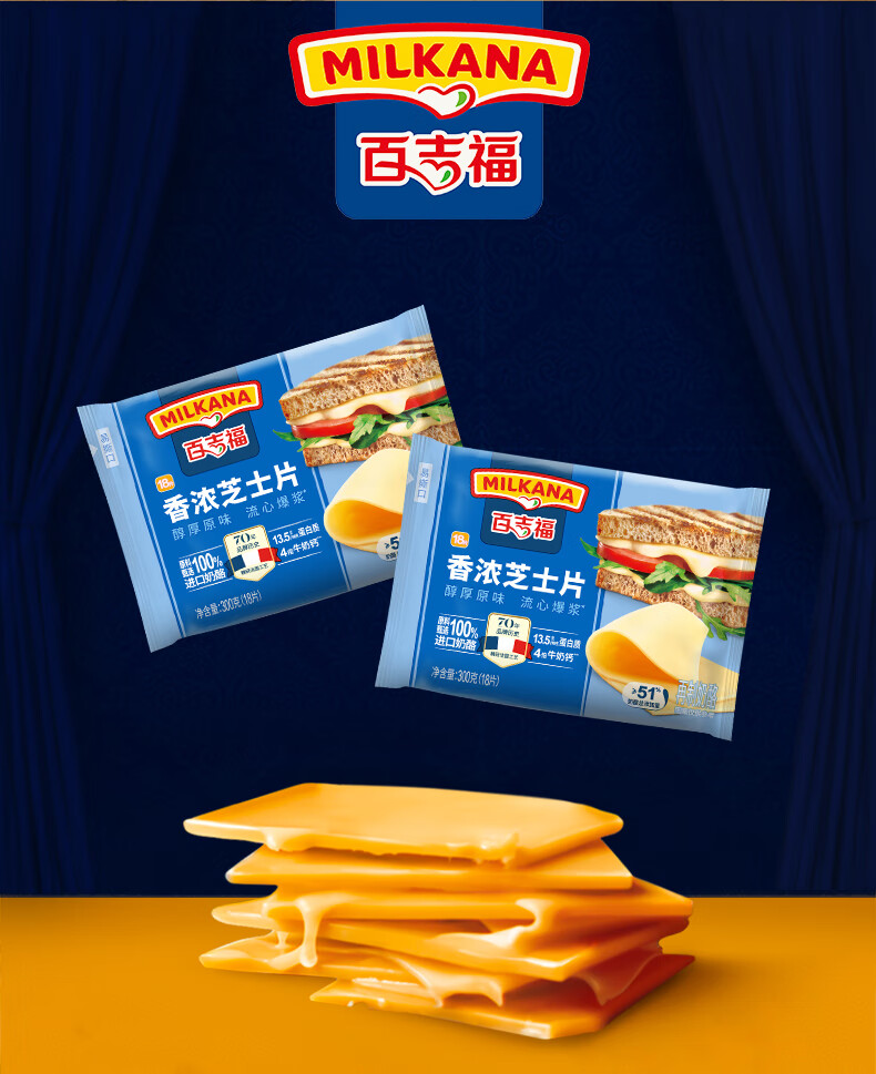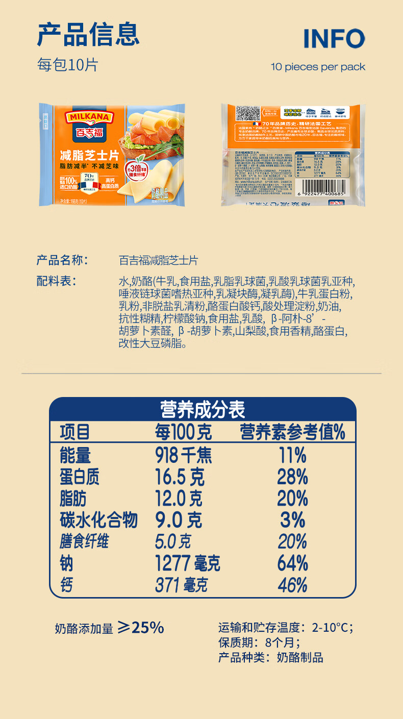 百吉福芝士片 ≥51%奶酪含量 早餐三明治汉堡烘焙原料 奶酪烘焙冷藏 166g减脂芝士片*2袋(共20片)