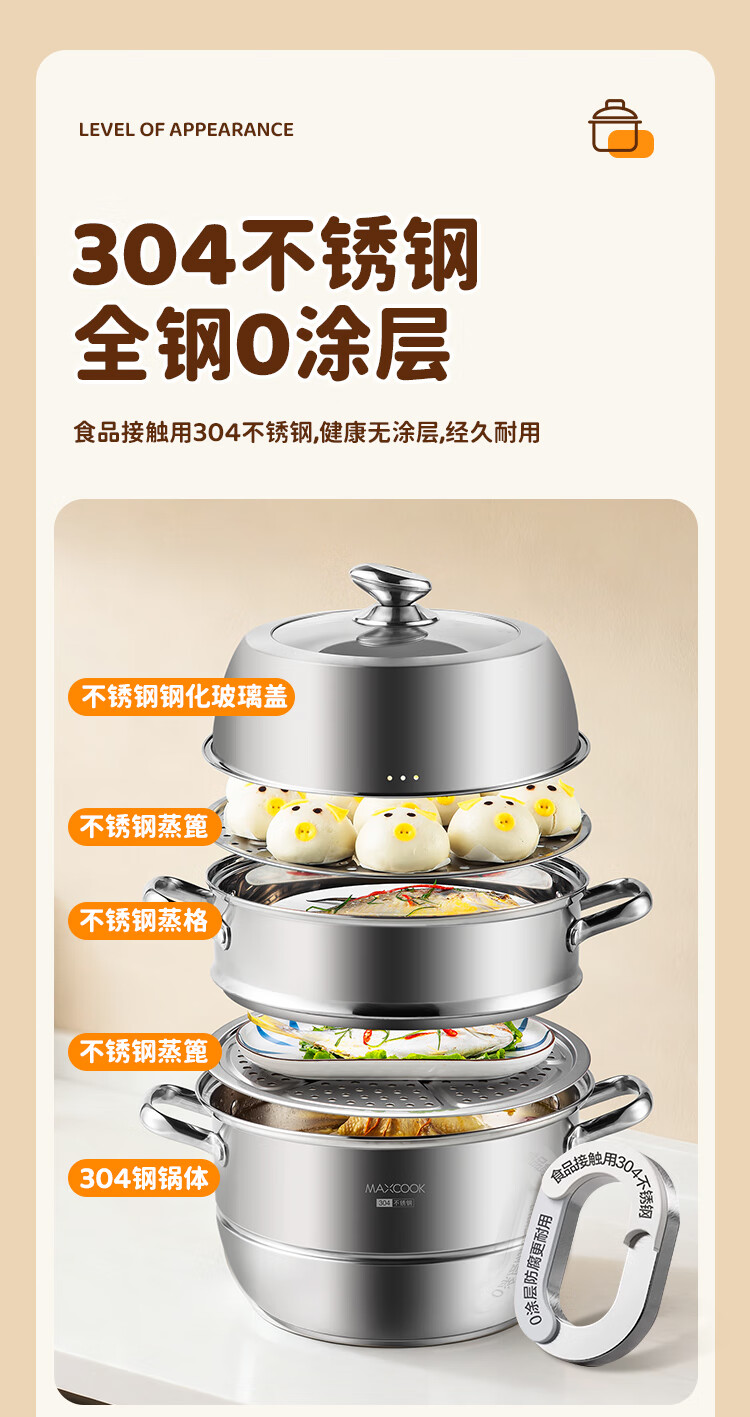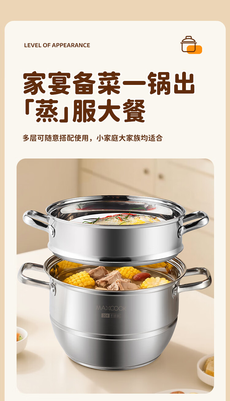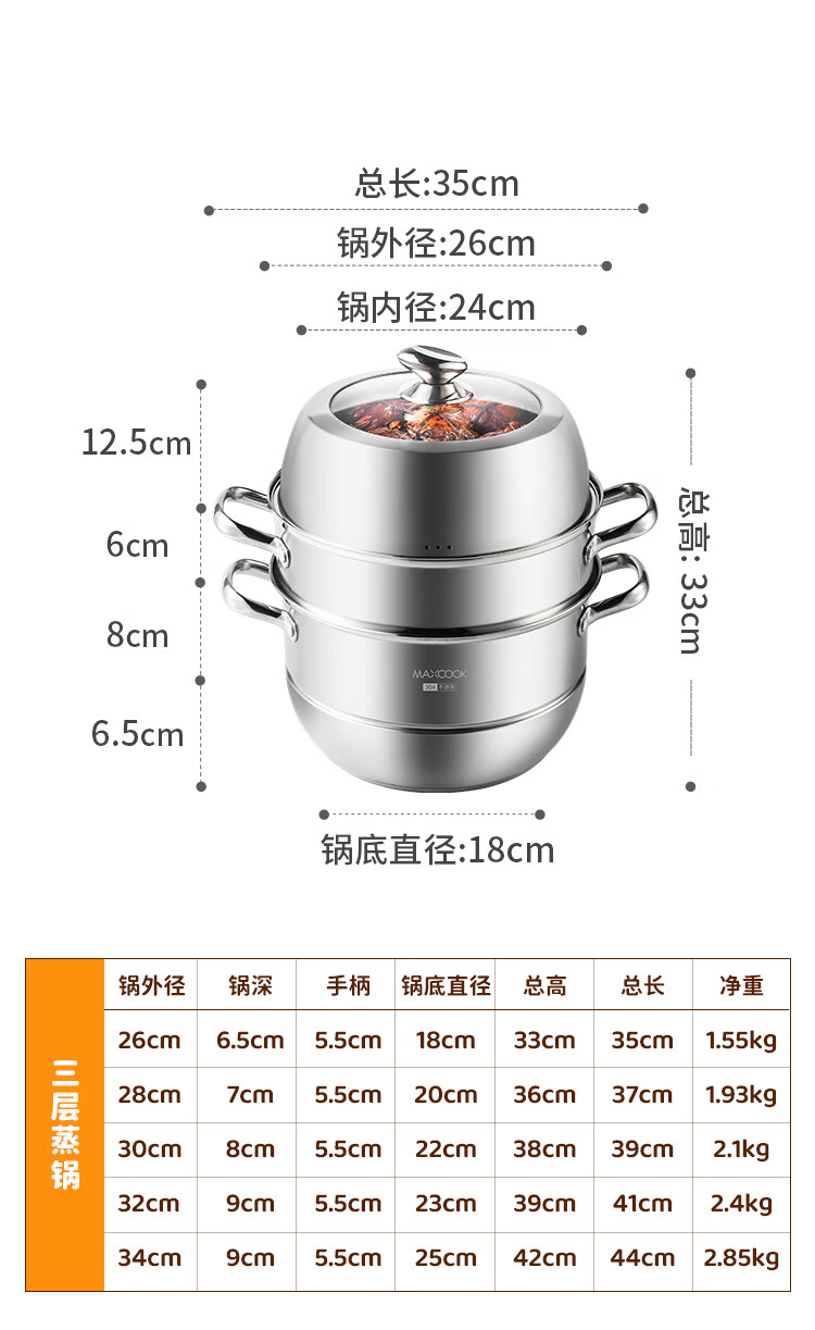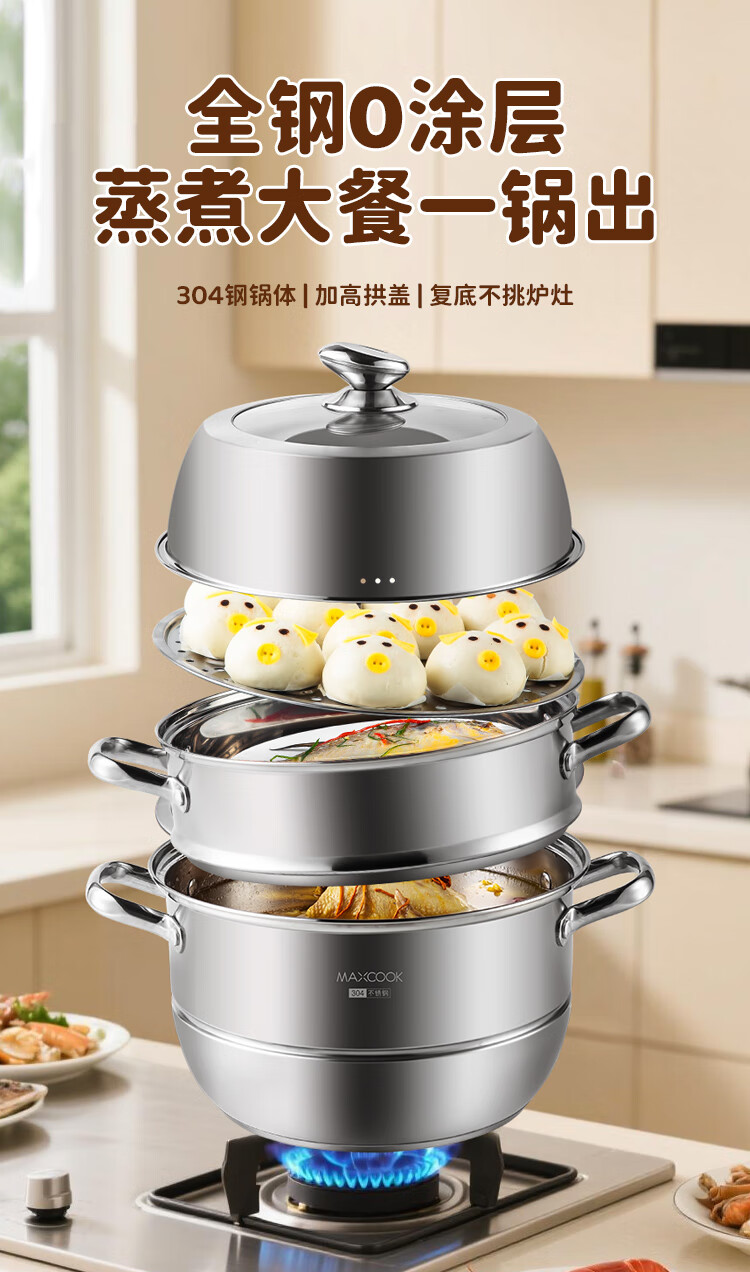 美厨(MAXCOOK)蒸锅 304不锈钢30CM三层蒸锅 加厚复底汤锅 燃气电磁炉通用