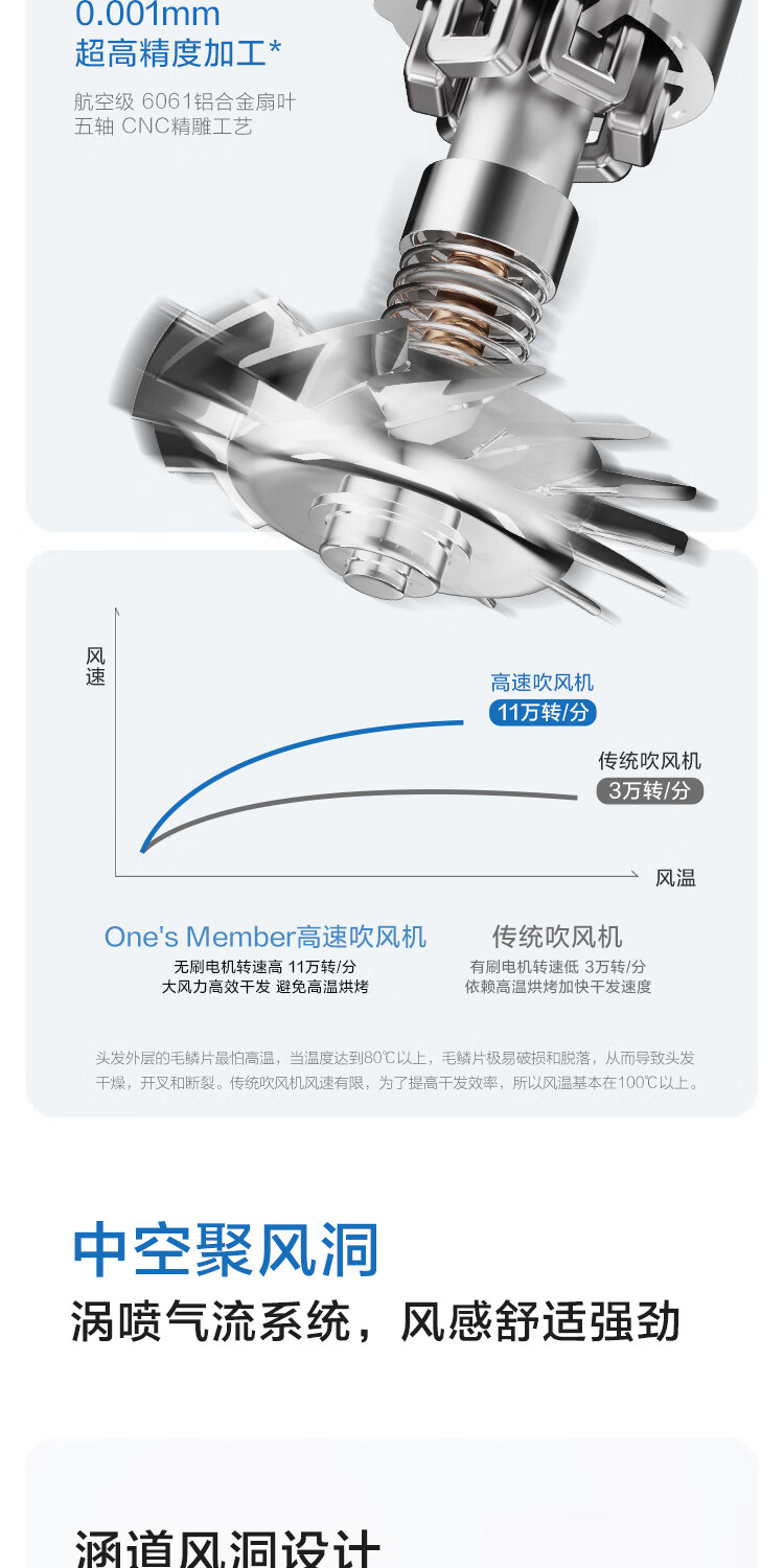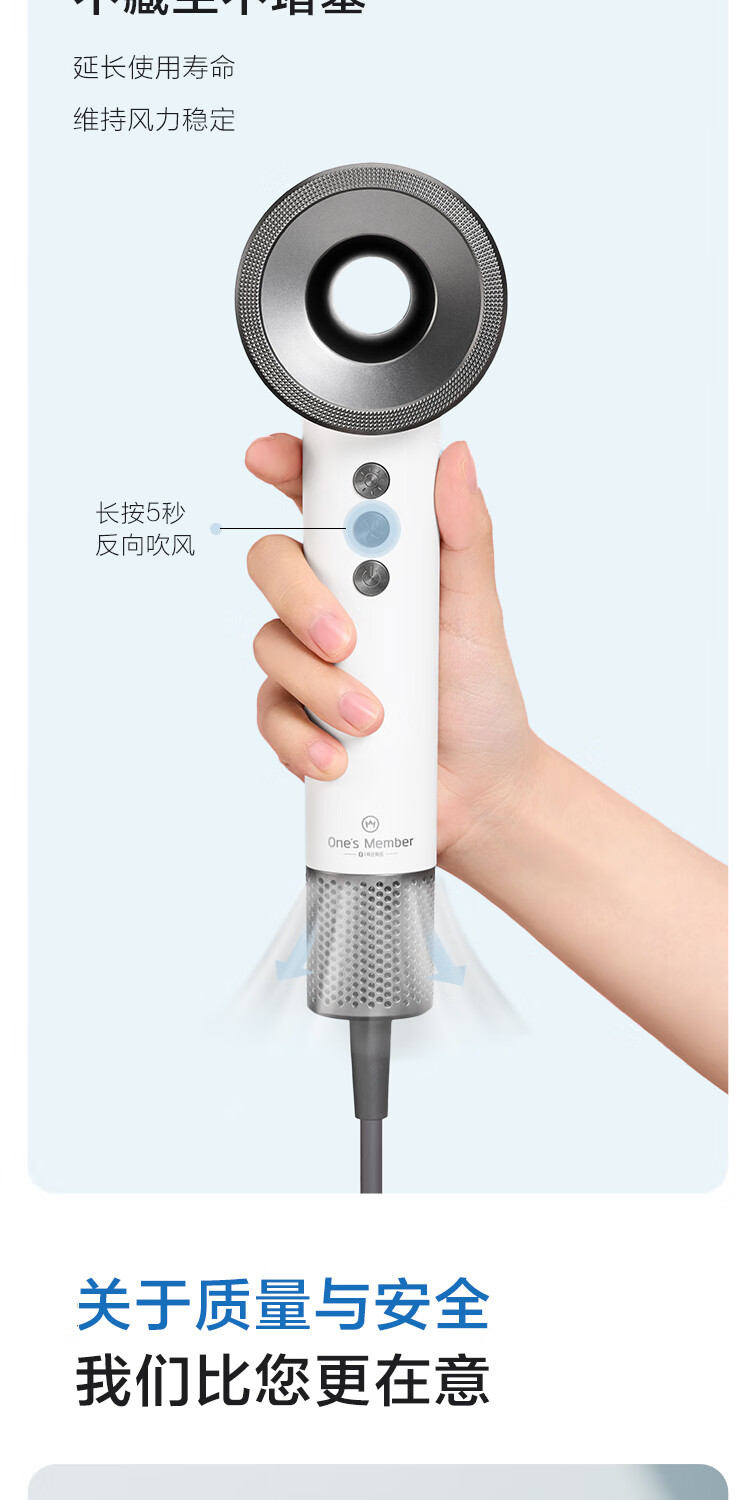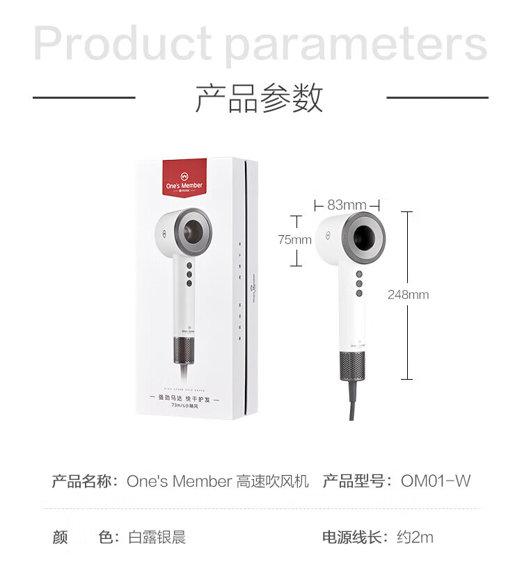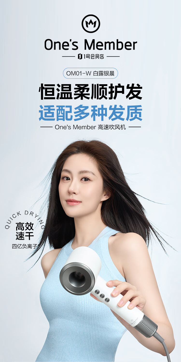 1号会员店(One's Member)高速电吹风 家用负离子护发吹风机速干大功率风筒京东自营礼物推荐 OM01-W 白露银晨