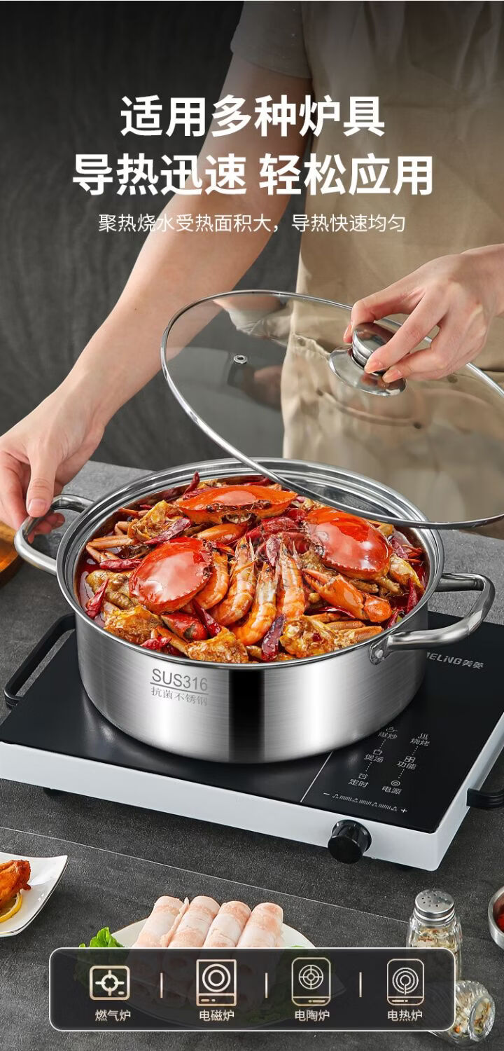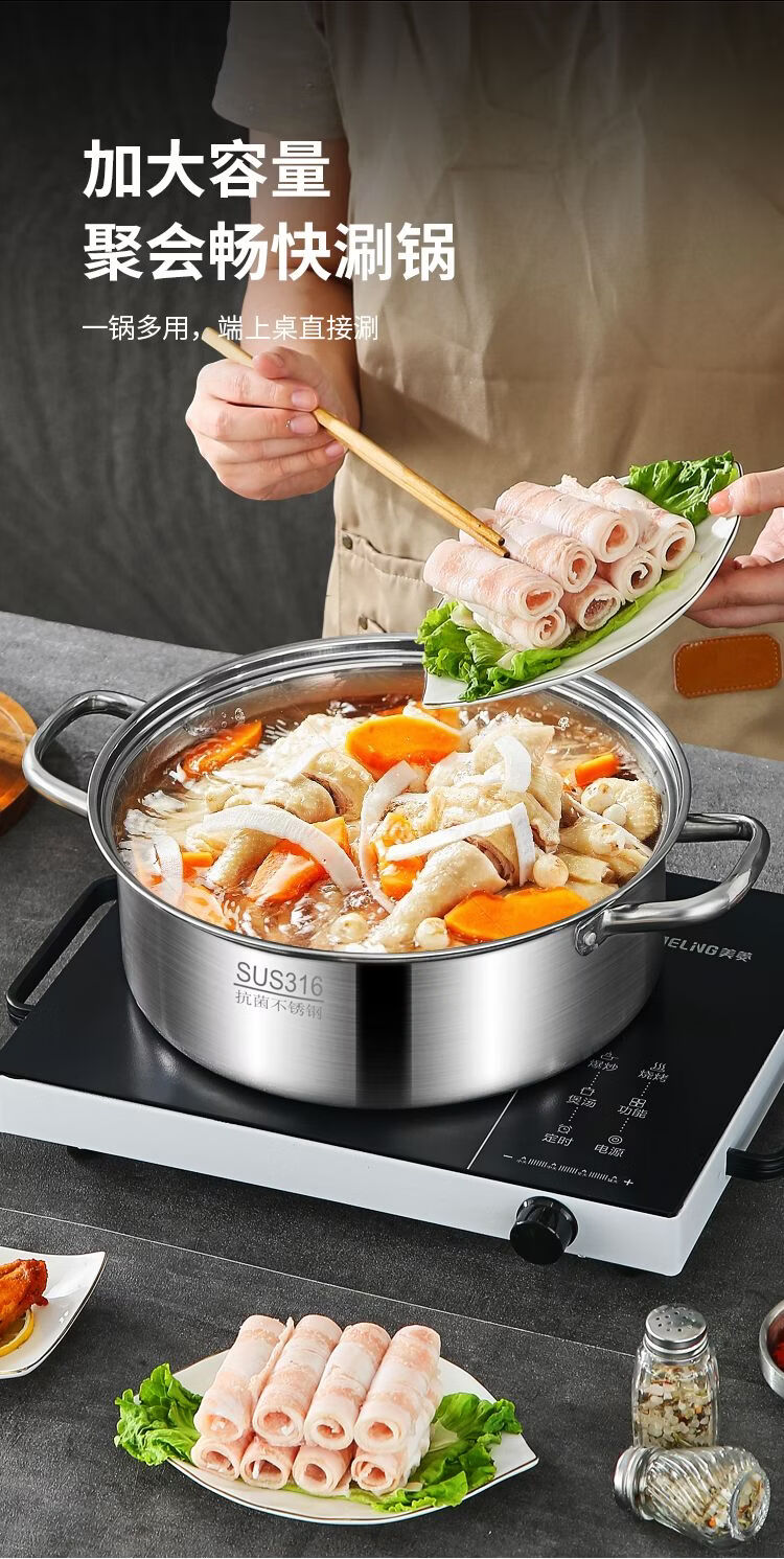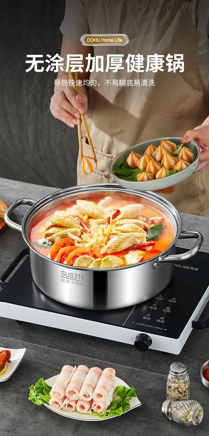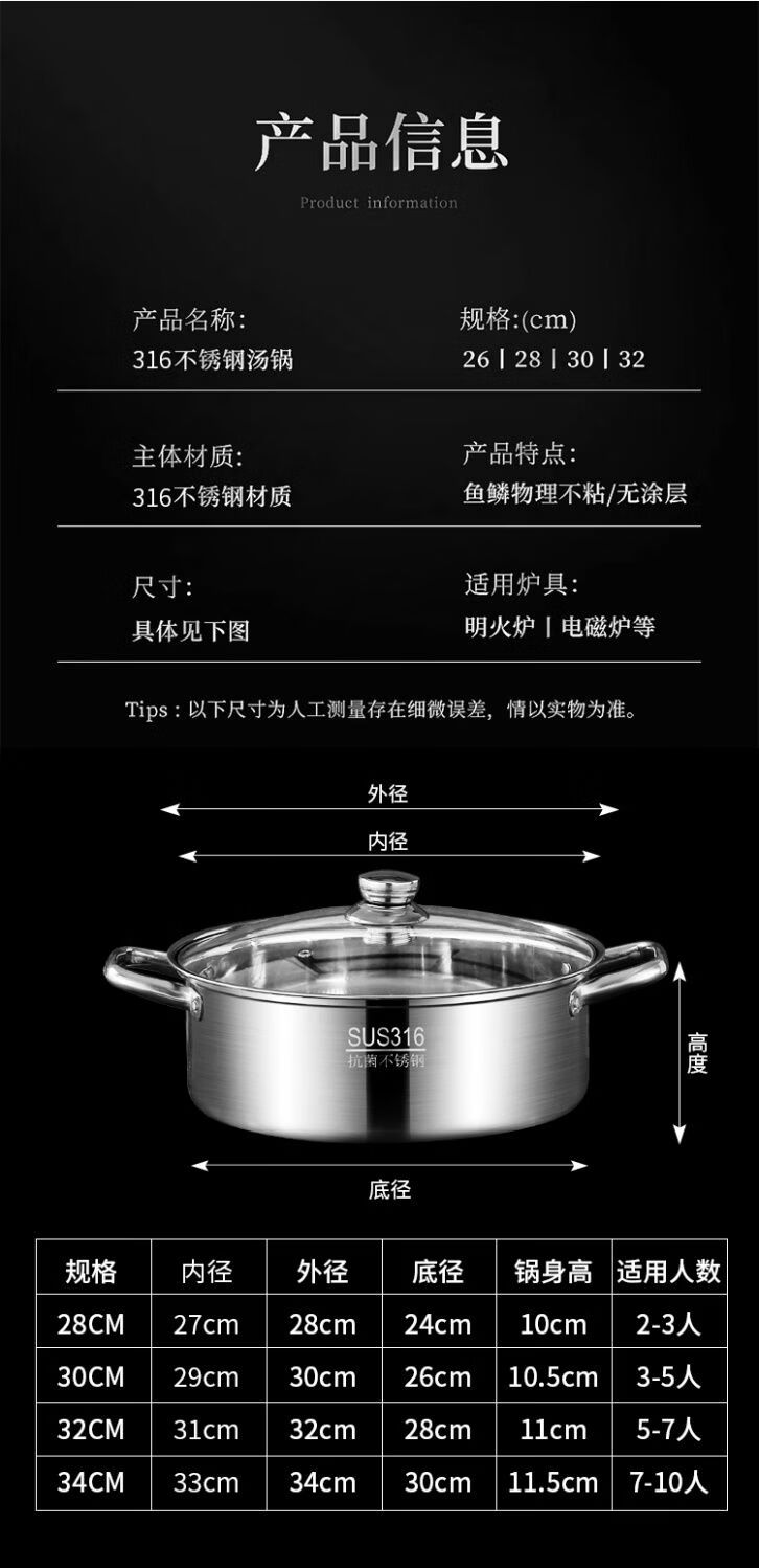 咏夏特厚汤锅316不锈钢电磁炉专用燃煤气灶蒸炖煮加厚双耳火锅家用锅 特厚316L汤锅28CM【适用2-3人】 0寸