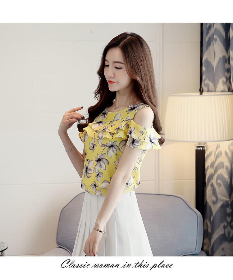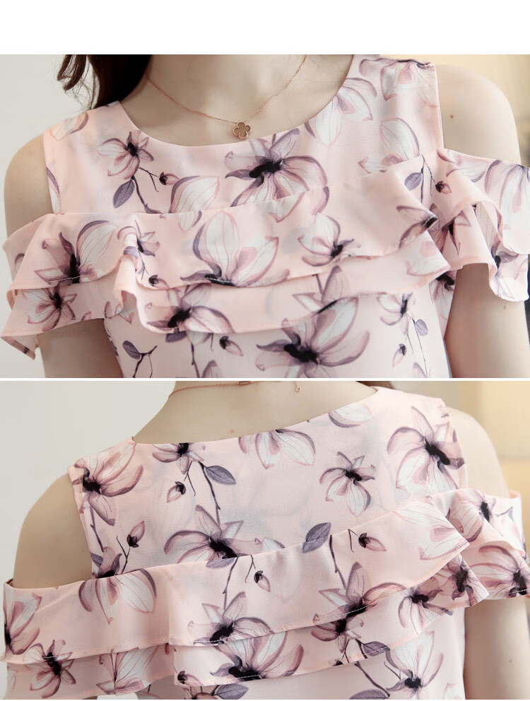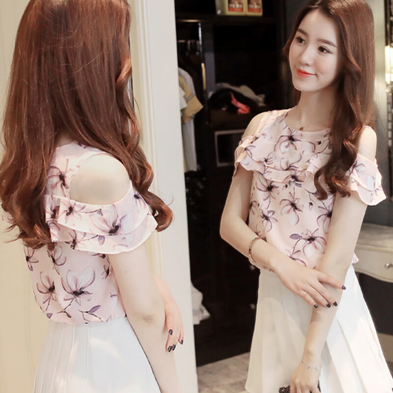 【厂家直供】现货新款女装印花露肩夏季雪纺衫上衣T恤短袖女士雪 粉色 (1件装) S 建议95斤内穿