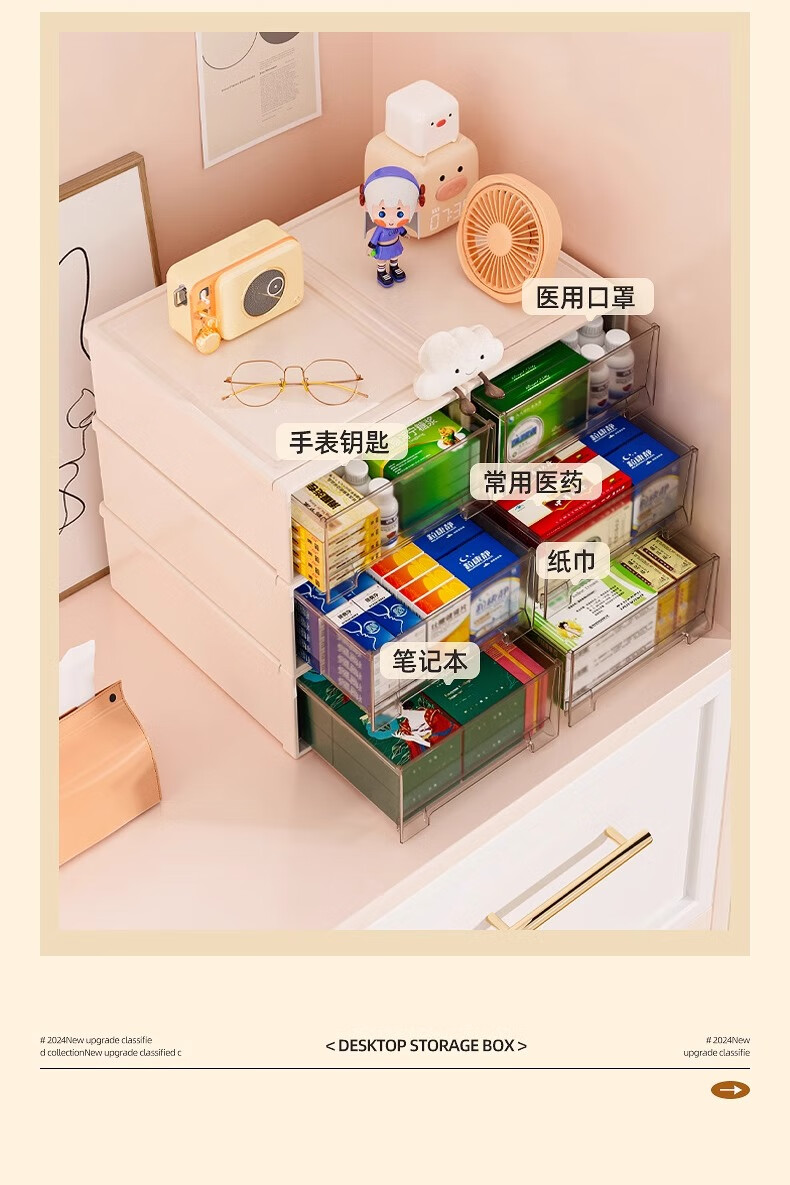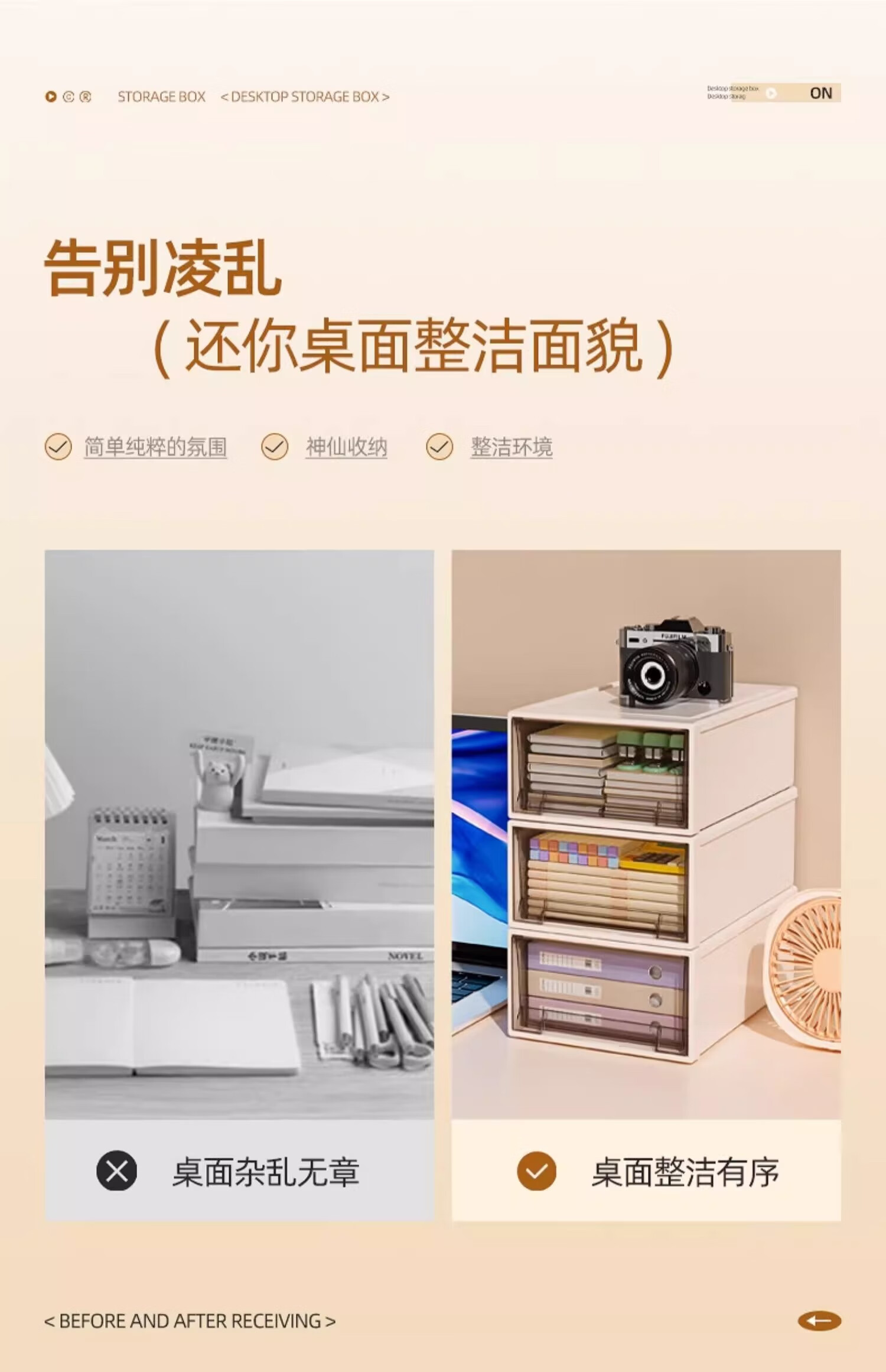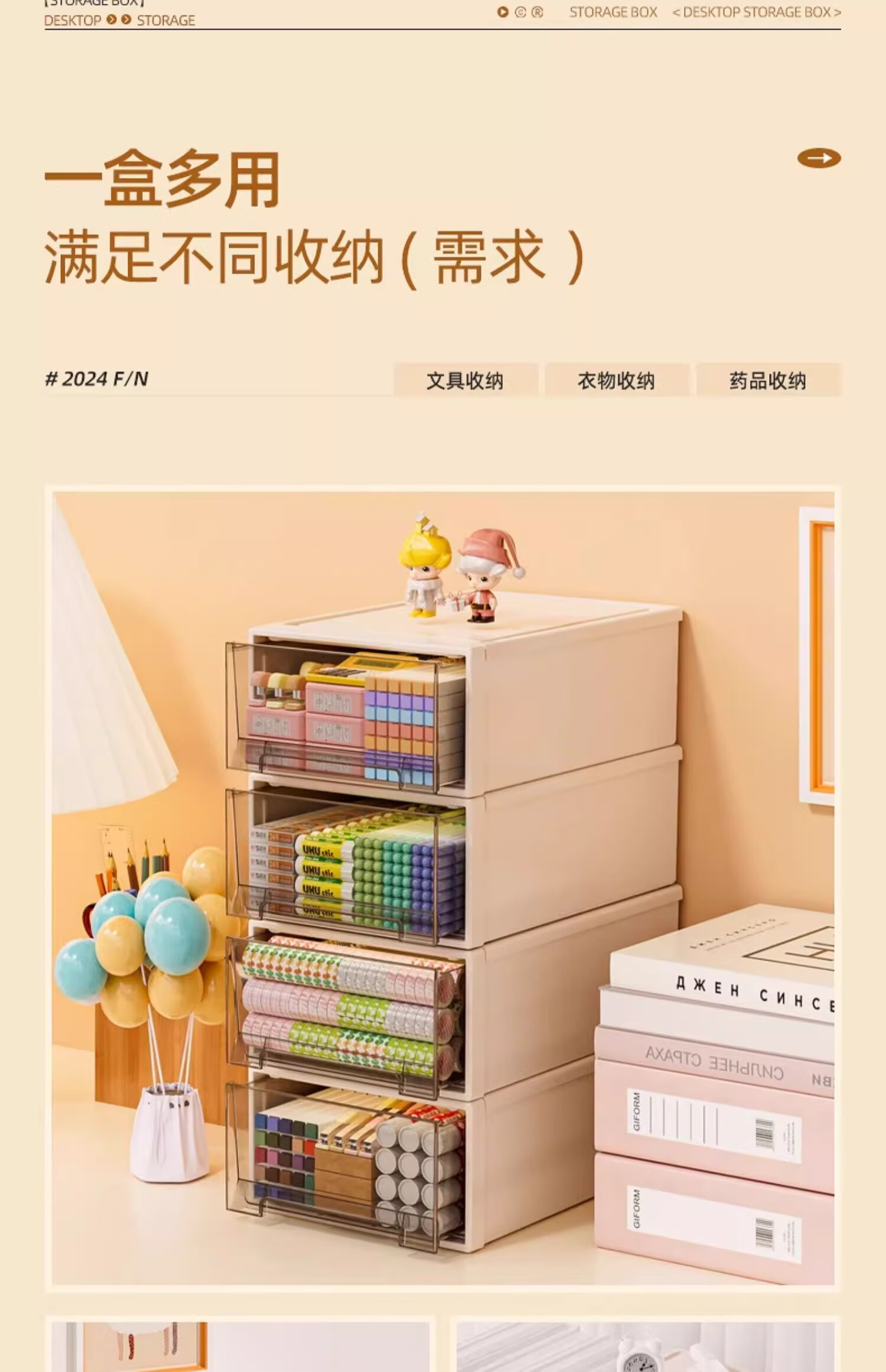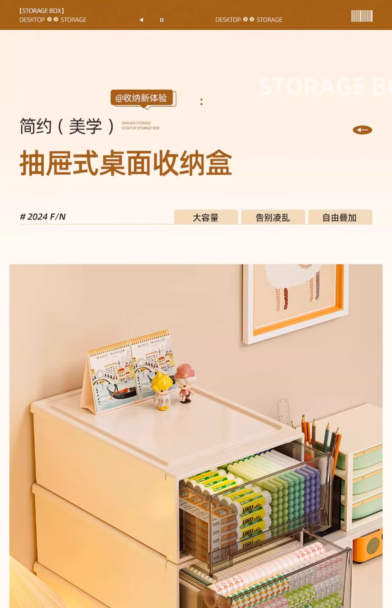 稻草熊桌面收纳盒抽屉式透明化妆品口红整理盒杂物办公室桌上文具置物架 茶色-特大号3个装【自由叠加】