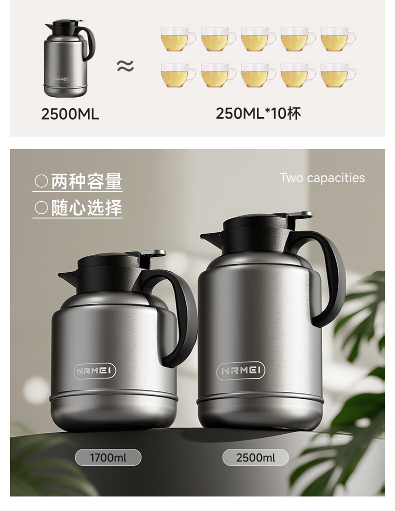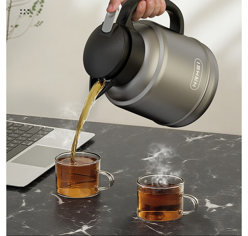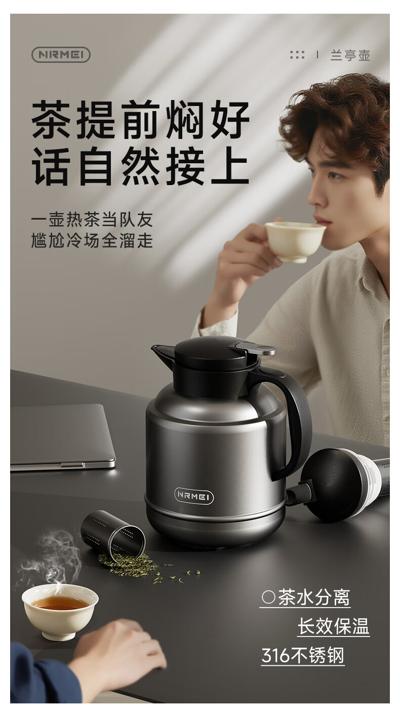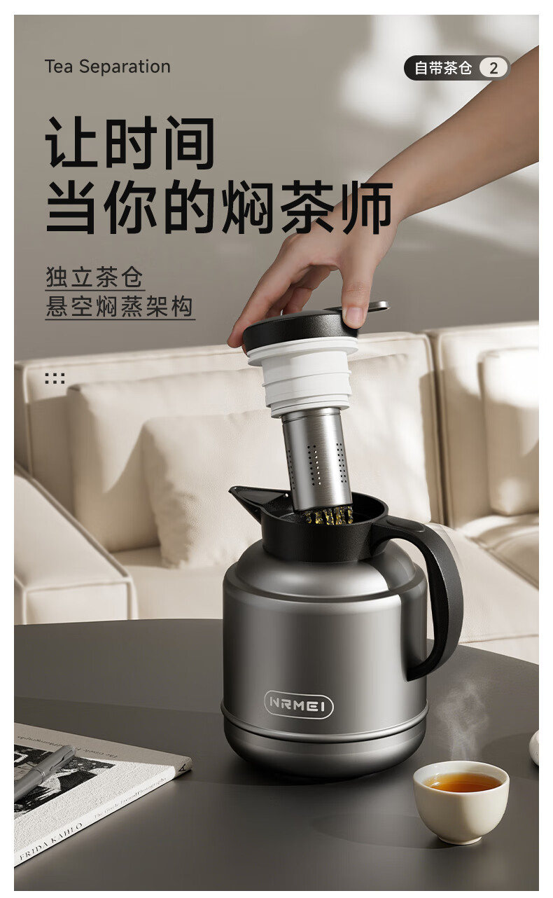 恩尔美(nRMEi)大容量焖茶壶316不锈钢茶水分离办公家用新款保温热水壶 黑色2.5L【48h长效保温+可拆卸茶仓】