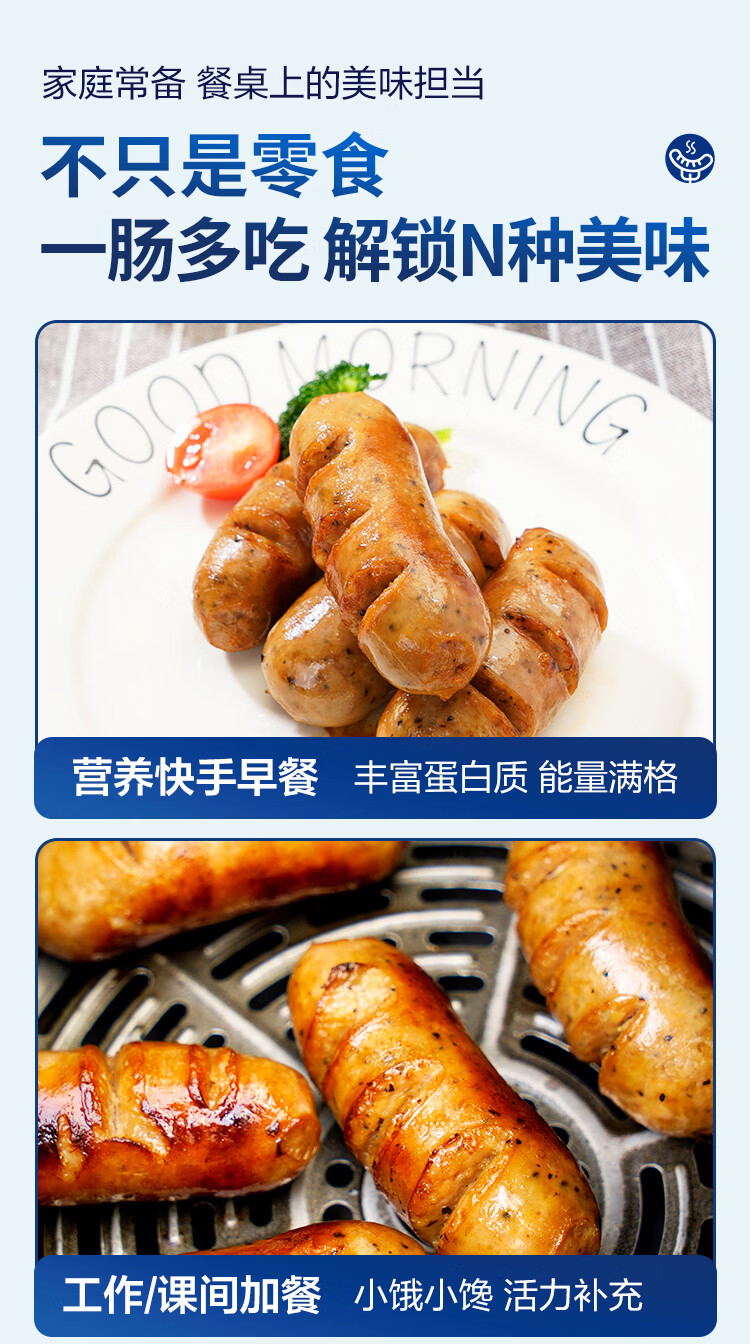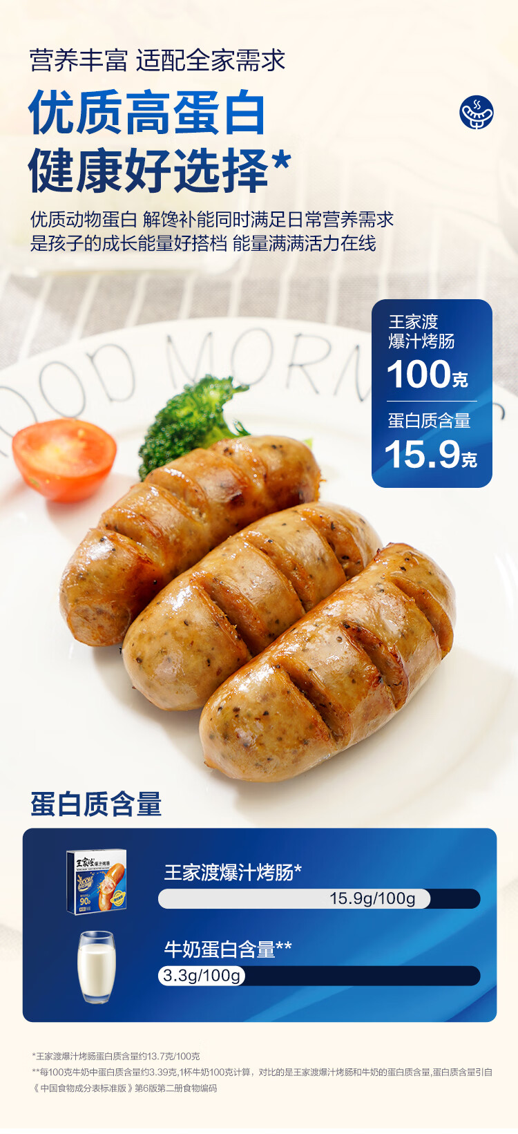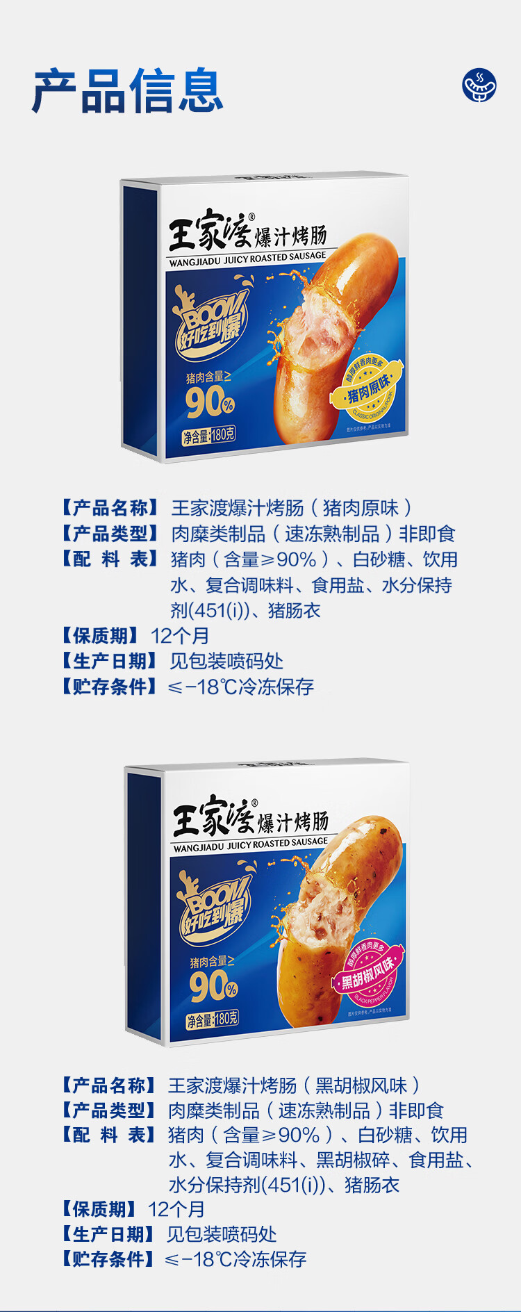 王家渡90%纯肉爆汁烤肠儿童早餐火山石烤肠空气炸锅烧烤食材 180g*5盒【黑椒】