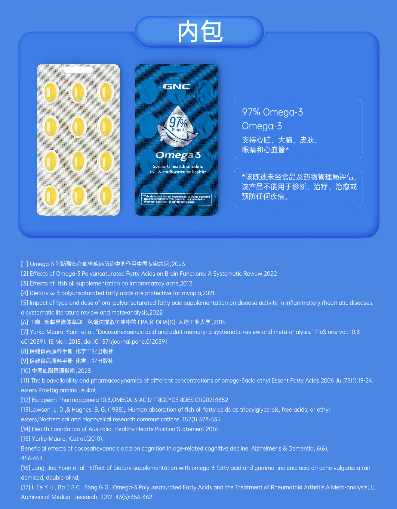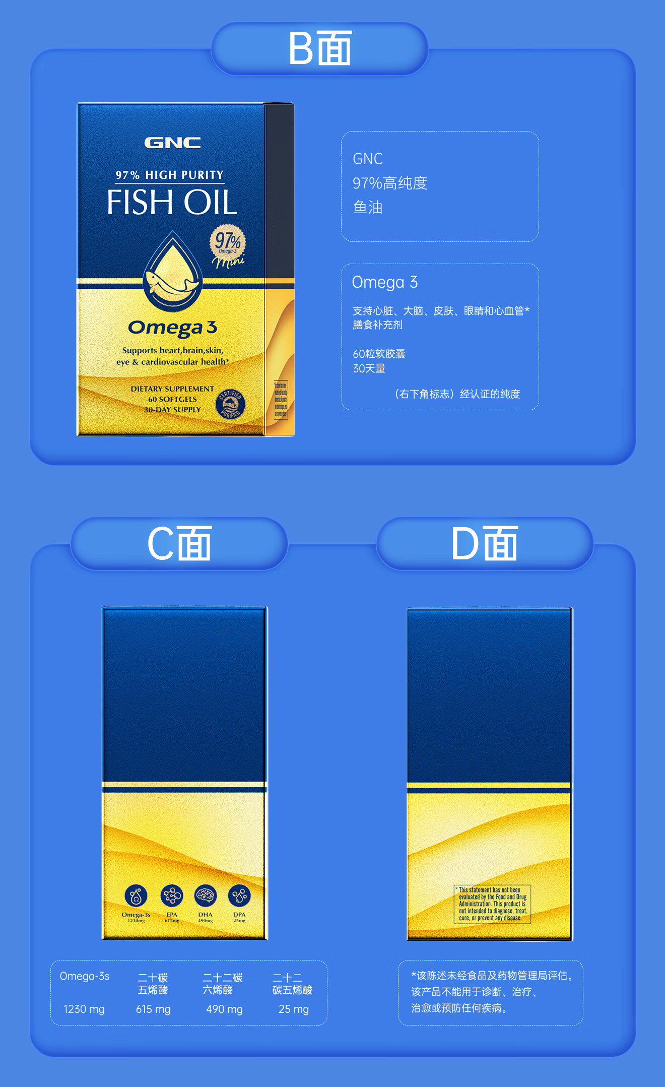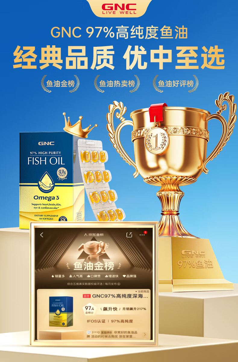 健安喜GNC健安喜97%鱼油深海高纯度高吸收 无腥深海鱼油迷你独立包装 【周期装90天量】 60粒*3盒