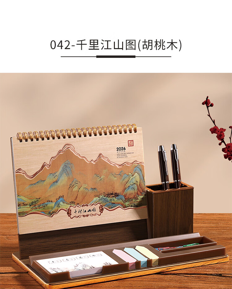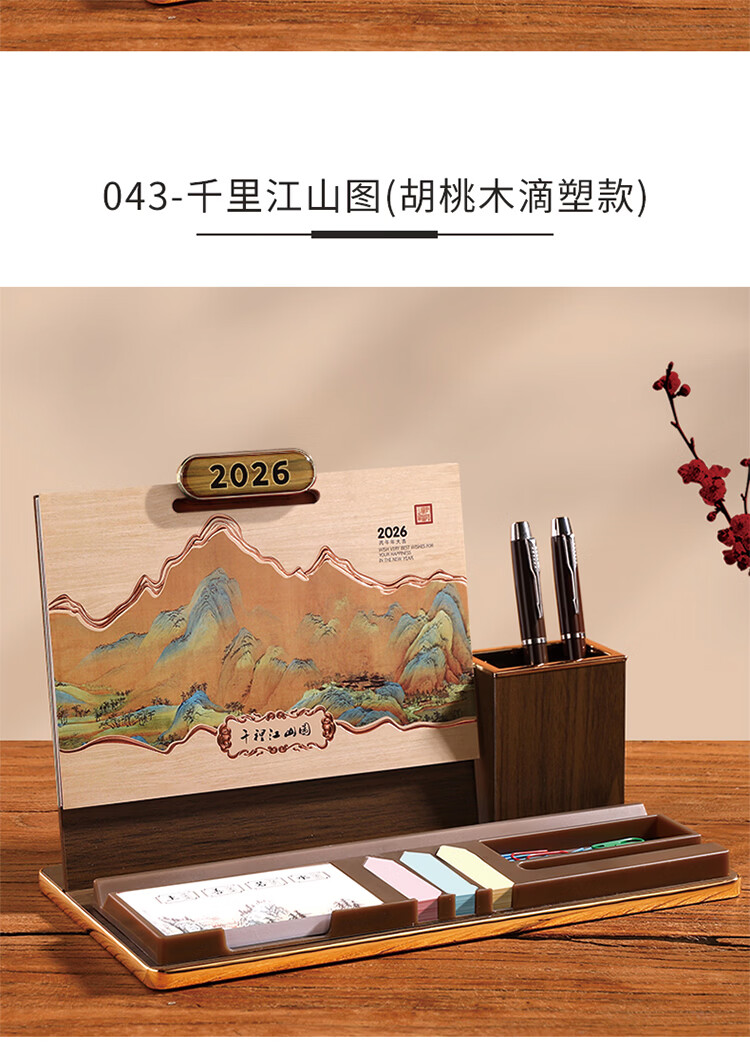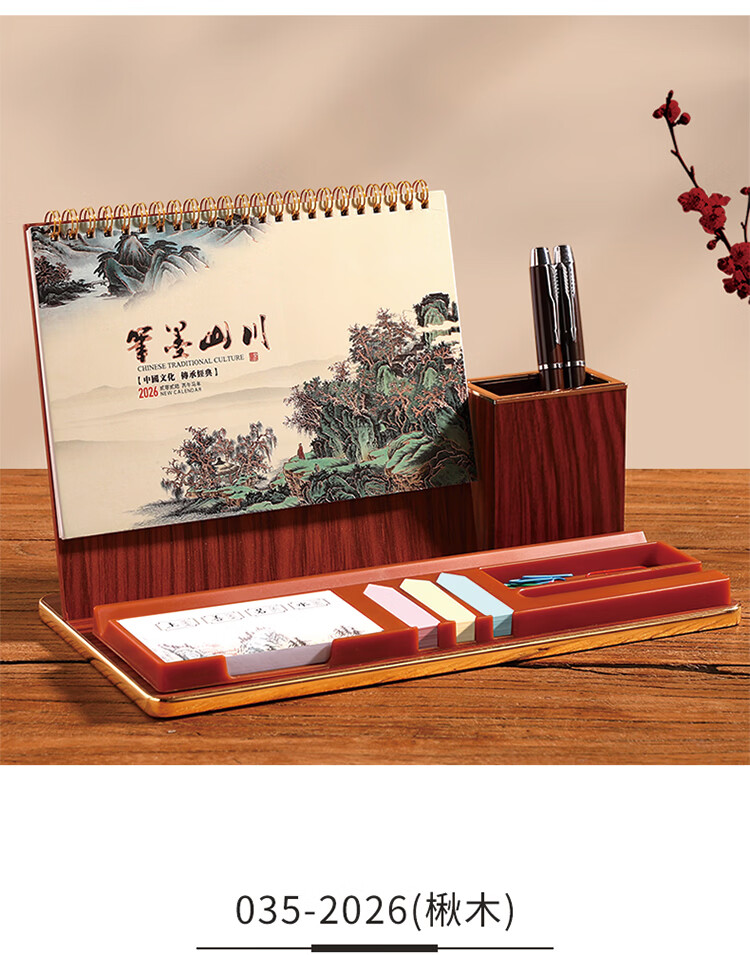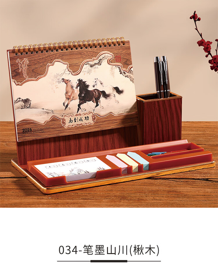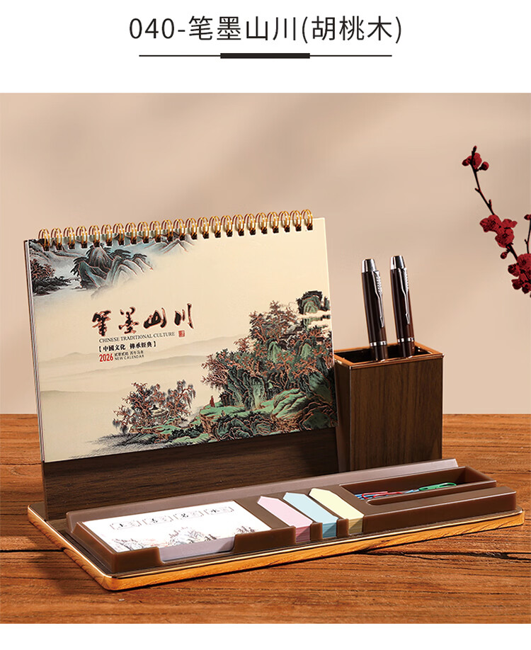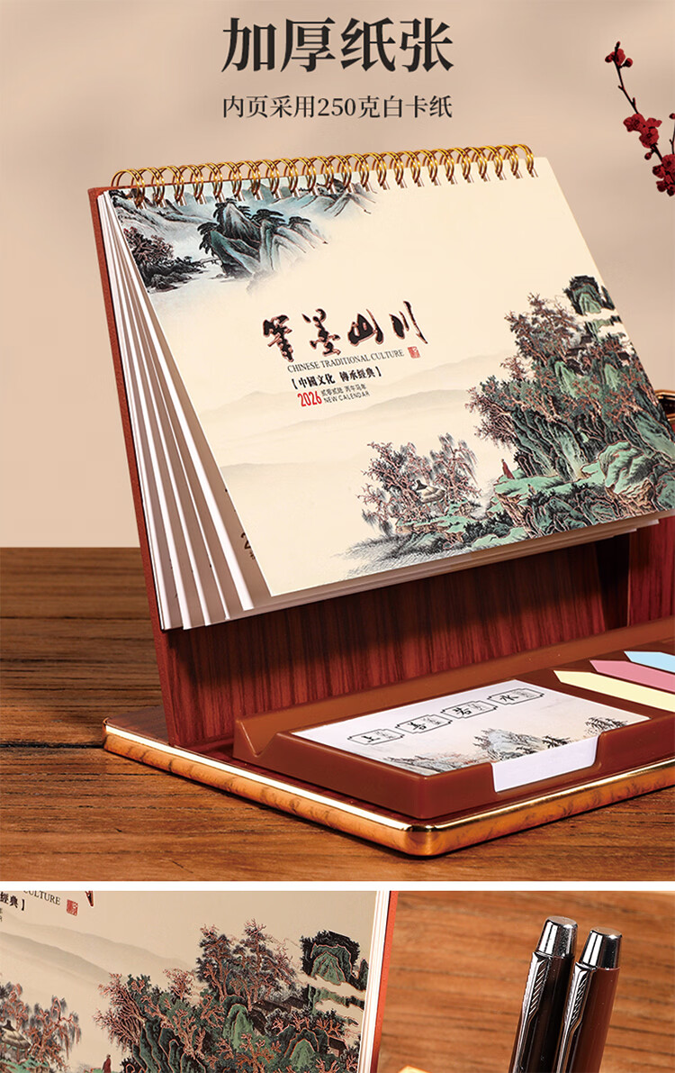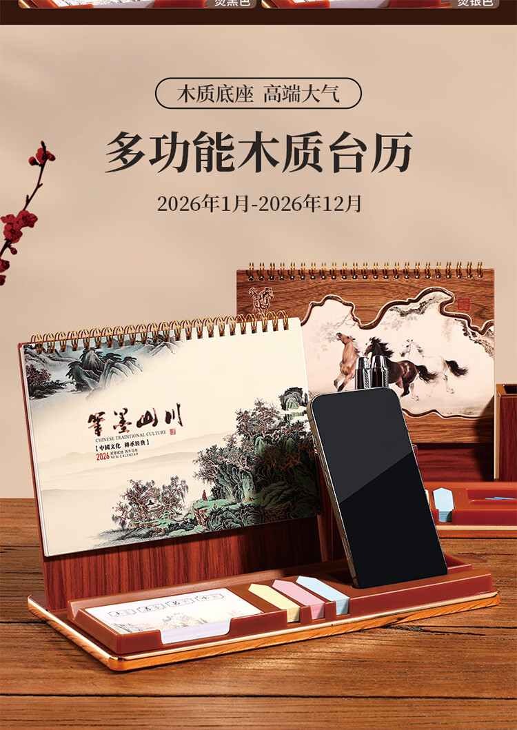 筏芯2026年台历新款定制日历马年中国风多功能木质笔筒创意计划本高档办公订制企业定做logo月历 176-043笔墨山川(胡桃木滴塑款)赠礼盒