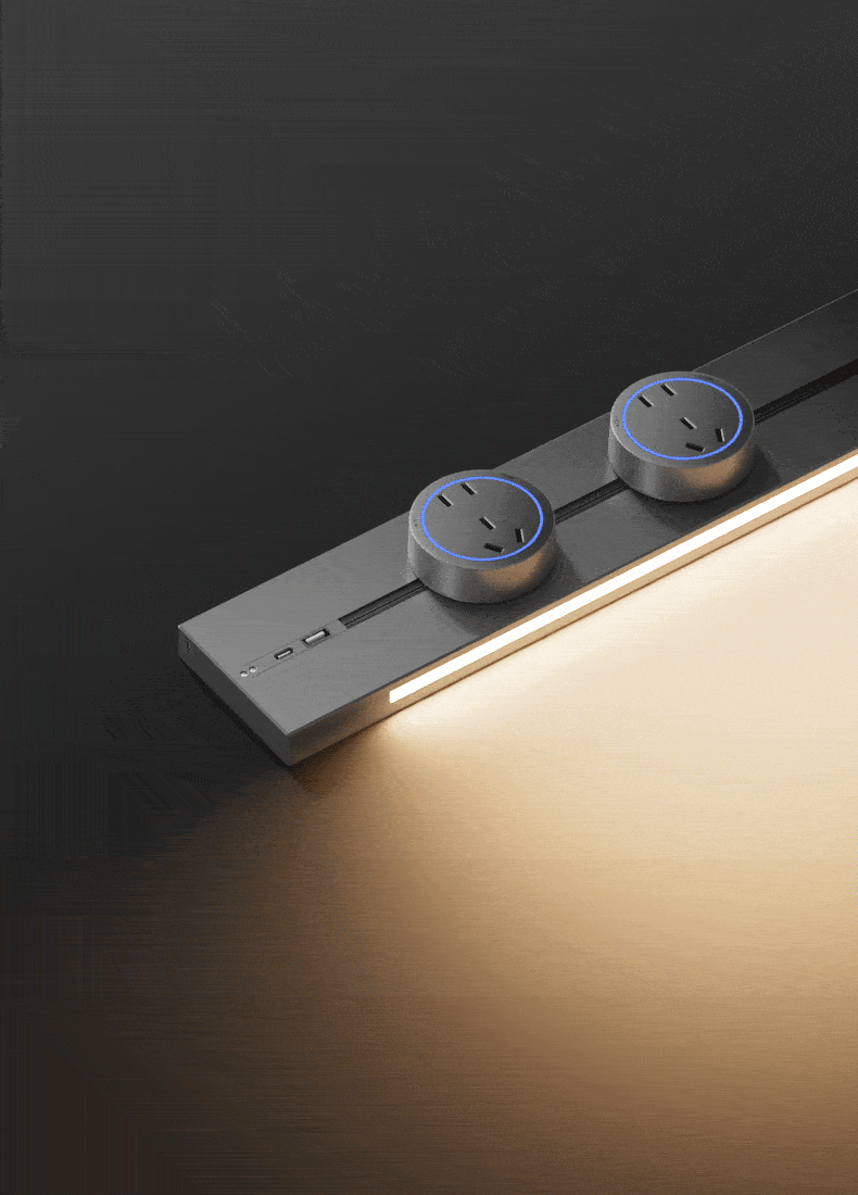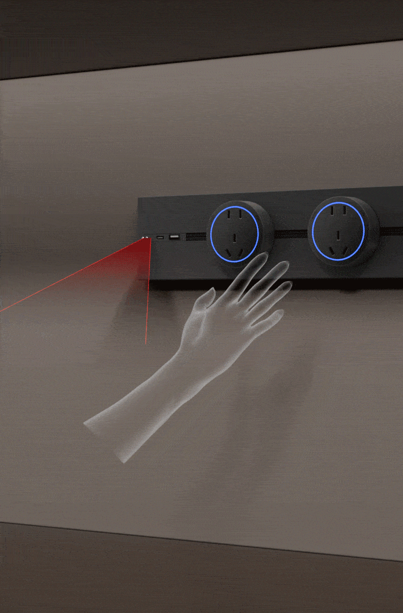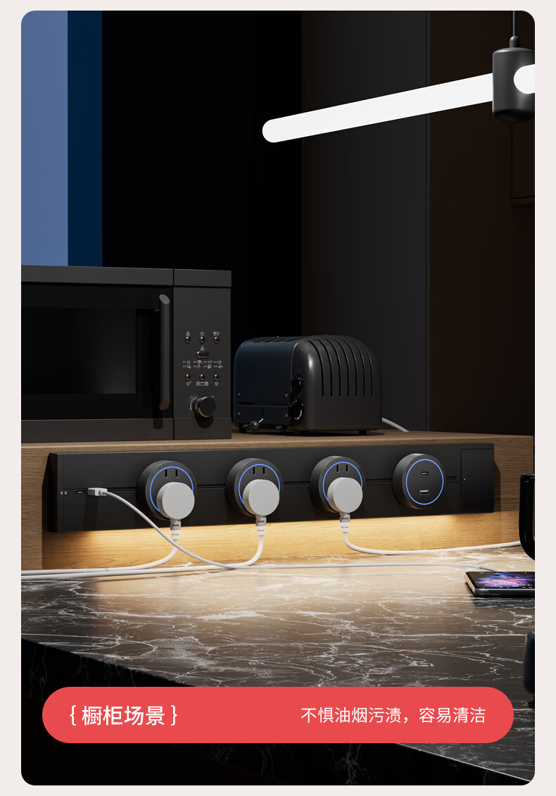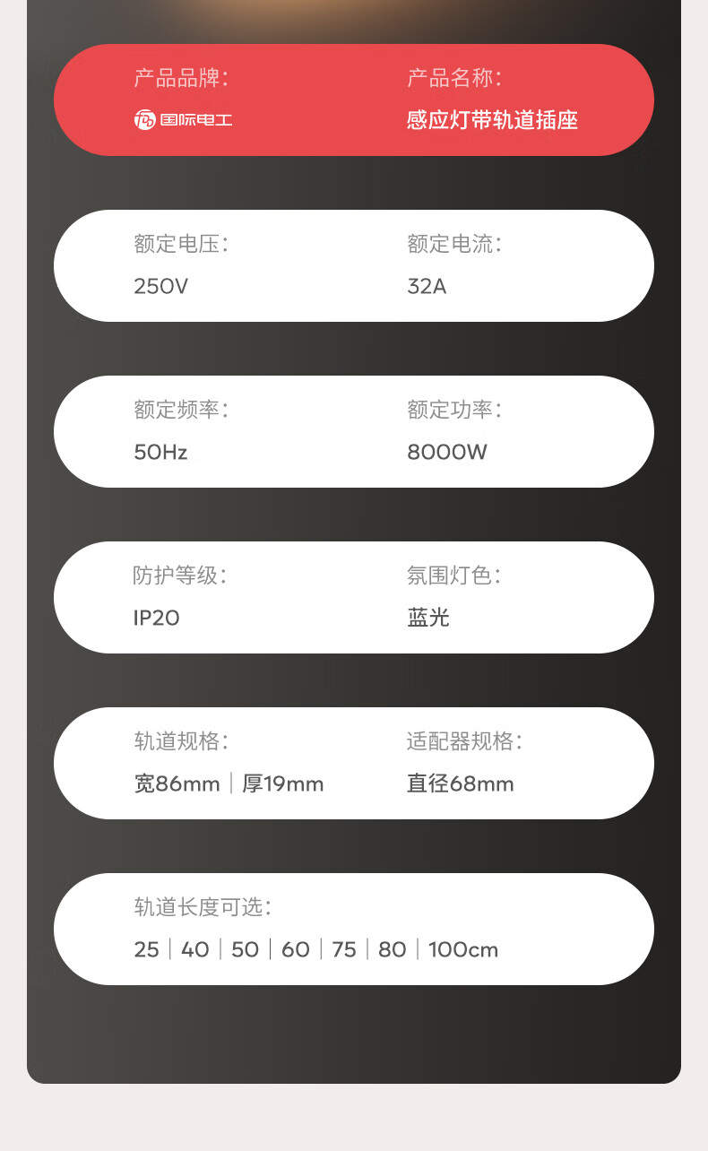 国际电工智能感应灯轨道插座可移动插排壁挂式电力导轨插座UC一体轨道插板 黑色 带开关挥手感应轨道 80cm +4个大五孔(蓝灯)
