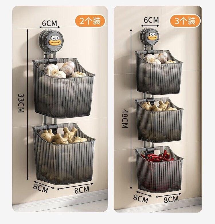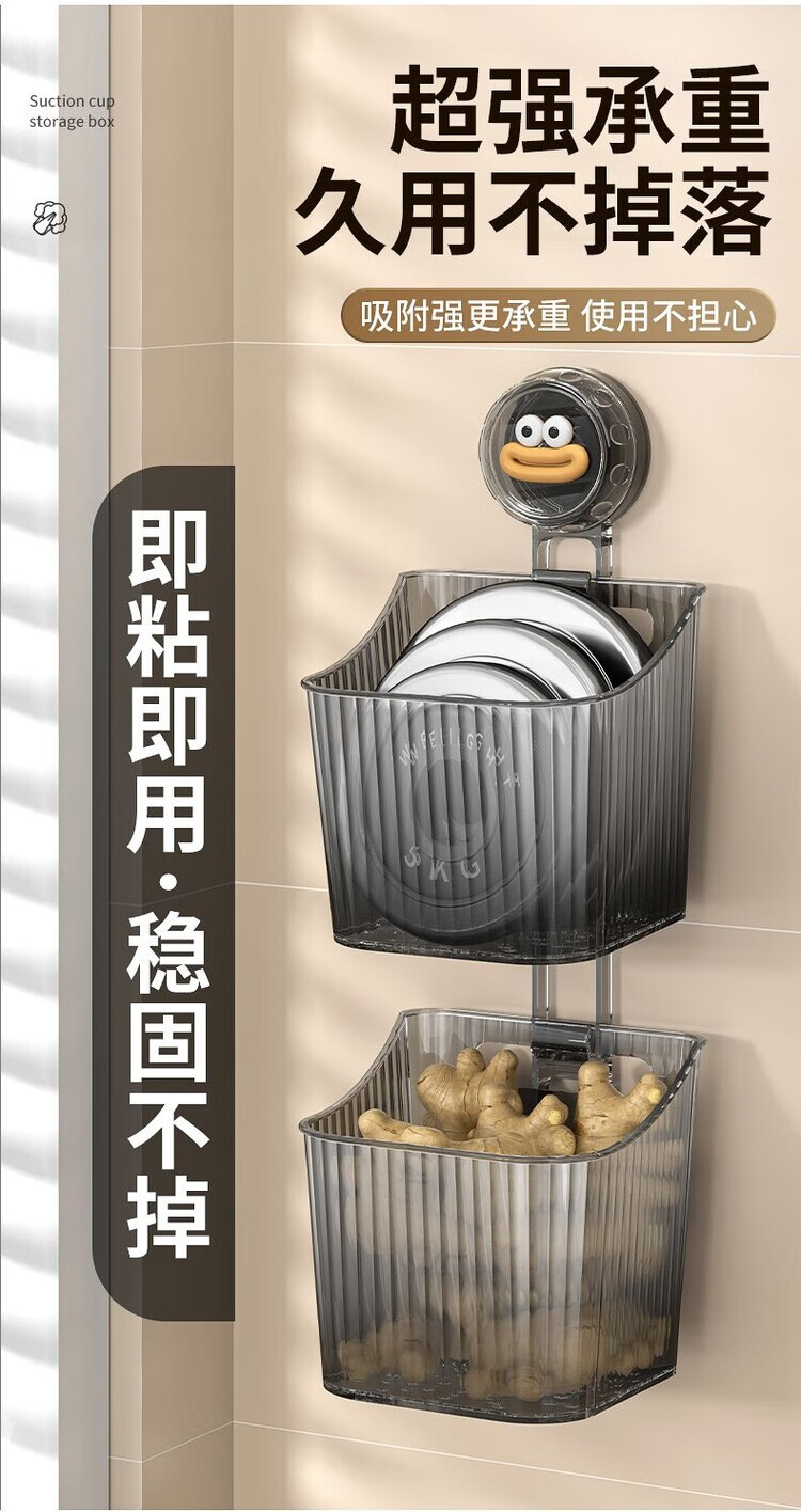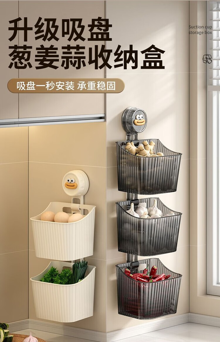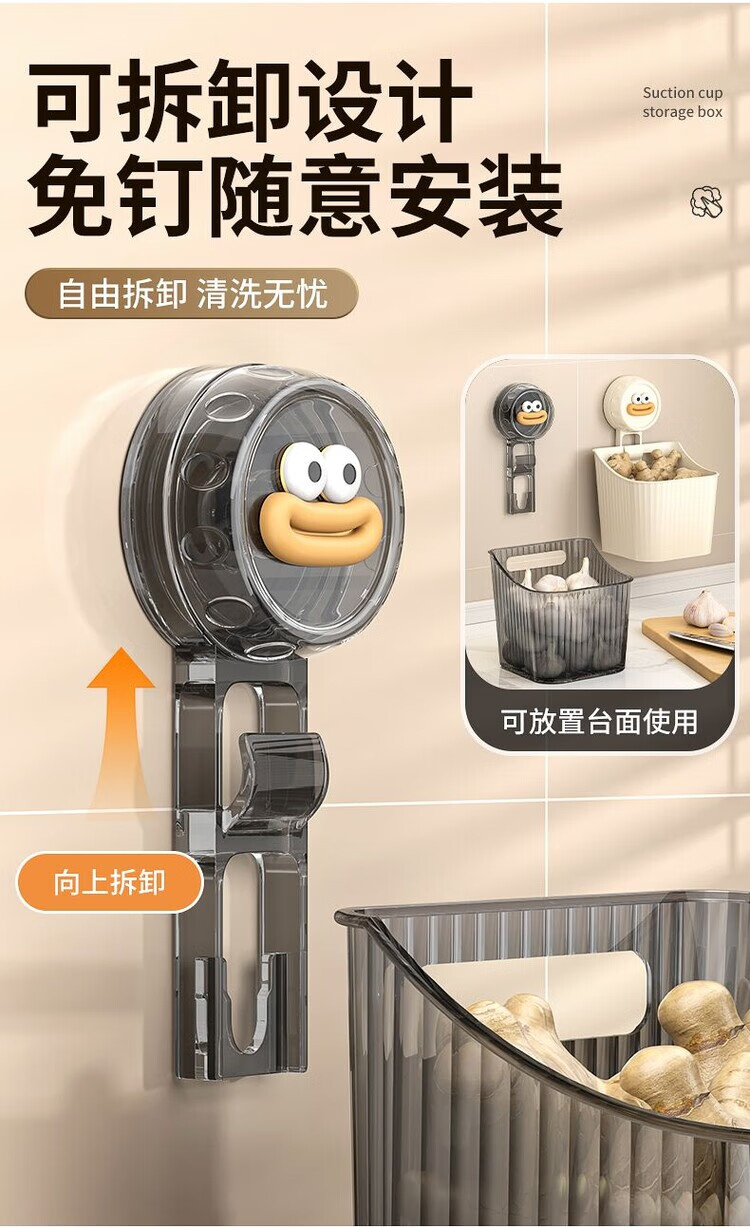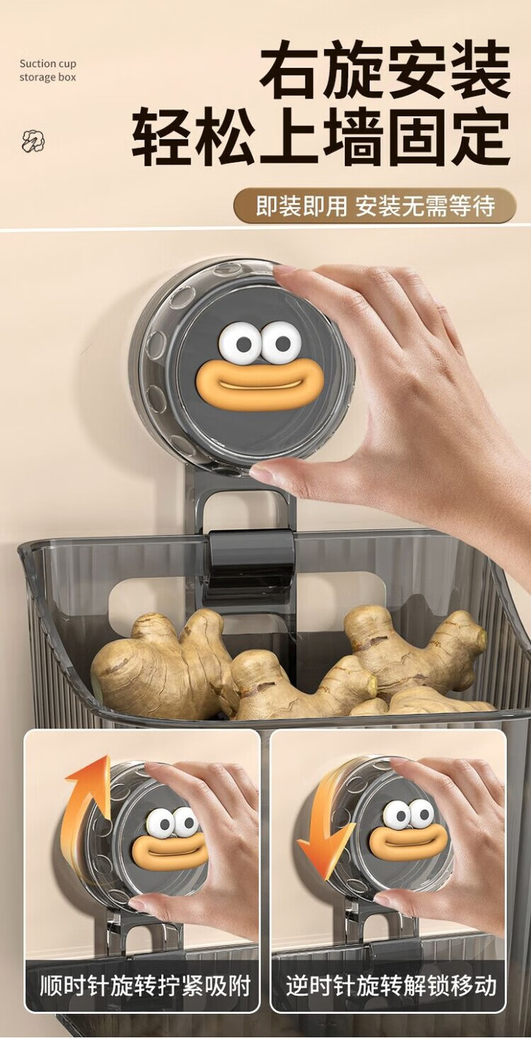 简漾吸盘厨房葱姜蒜收纳盒壁挂式置物架生姜大蒜调料收纳筐免打孔挂篮 壁挂台面两用【通风设计】 透灰色1个装【胶贴款】不可移动换位