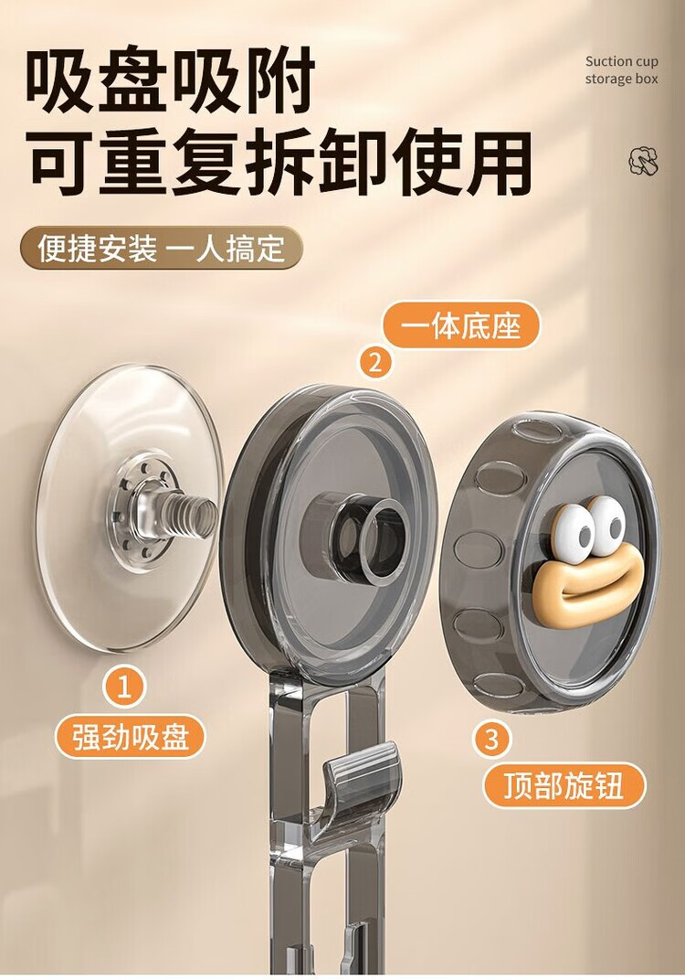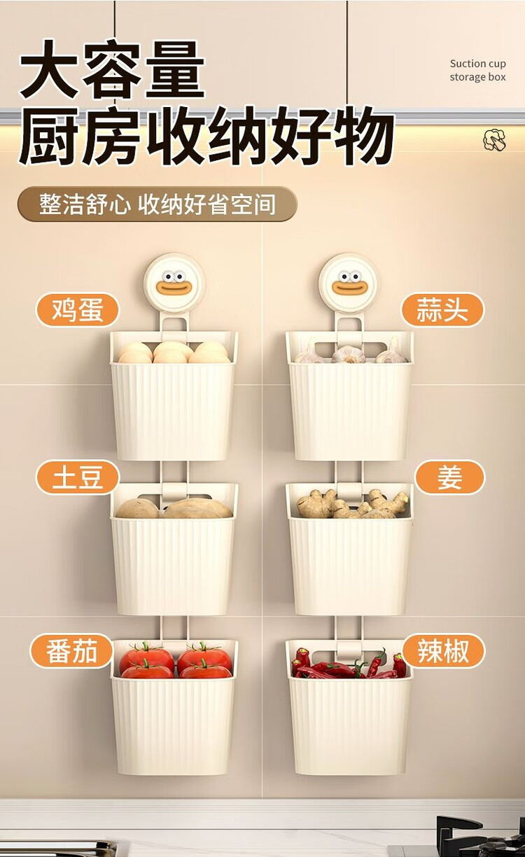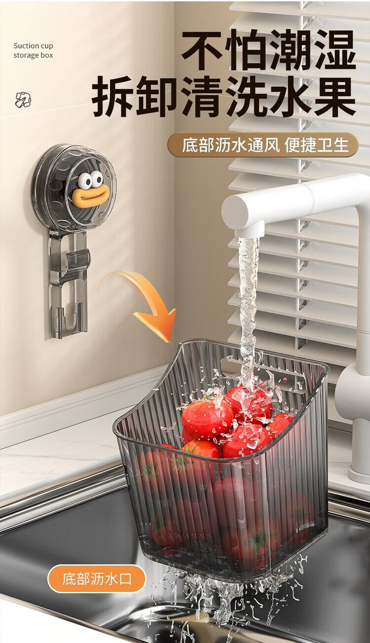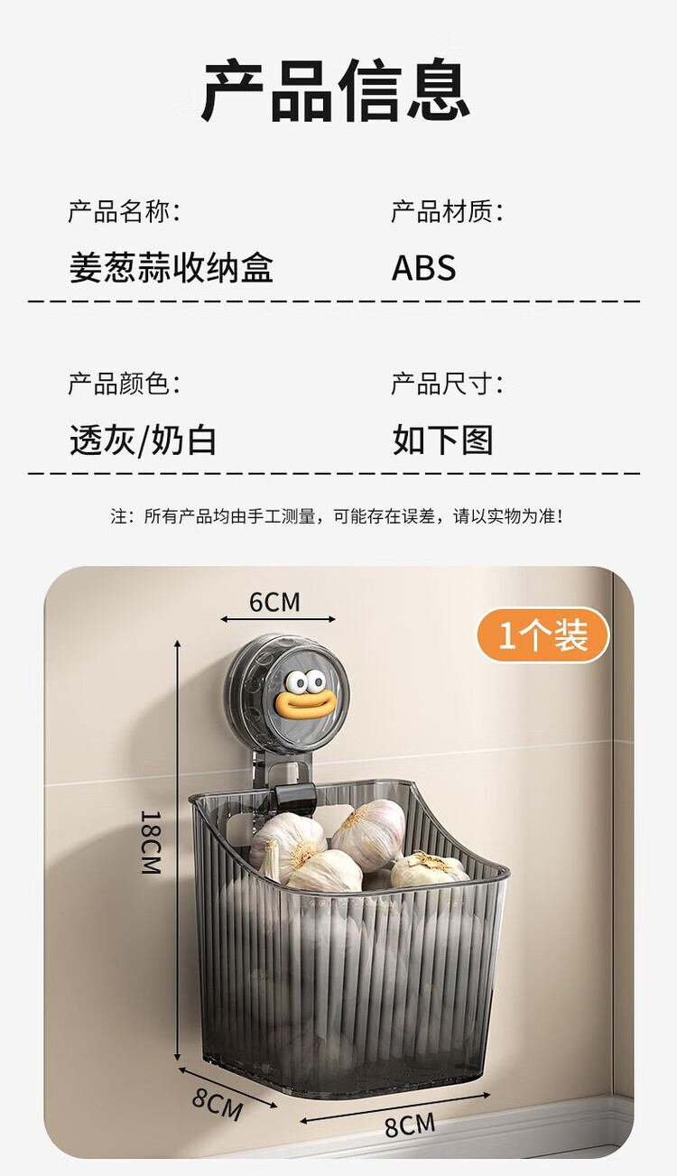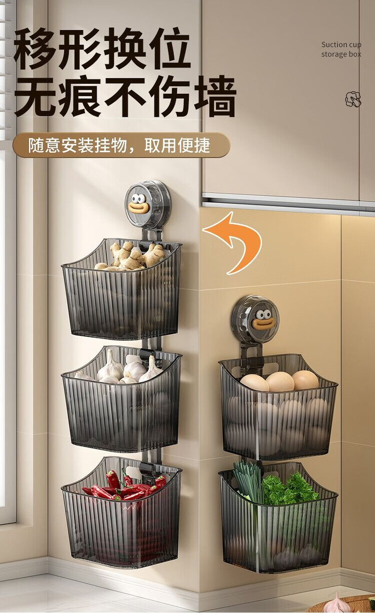 简漾吸盘厨房葱姜蒜收纳盒壁挂式置物架生姜大蒜调料收纳筐免打孔挂篮 壁挂台面两用【通风设计】 透灰色1个装【胶贴款】不可移动换位