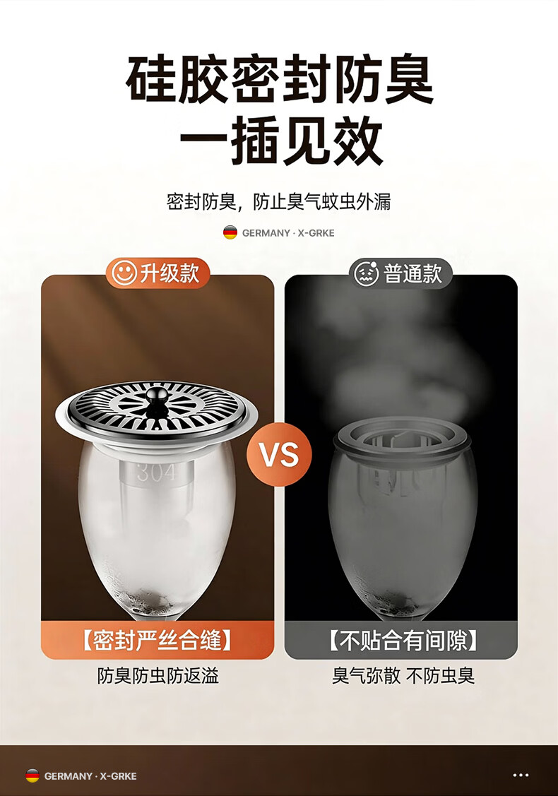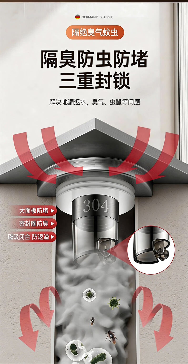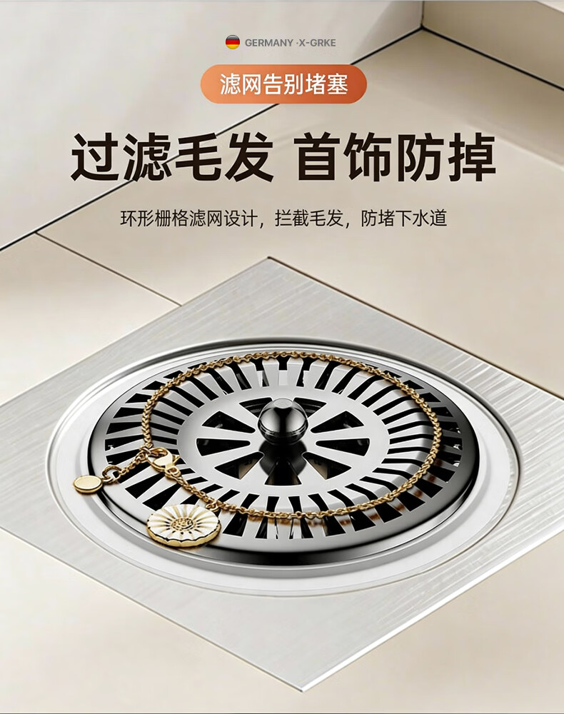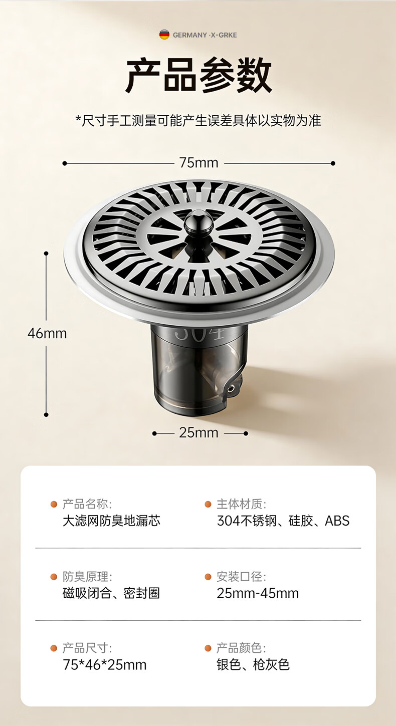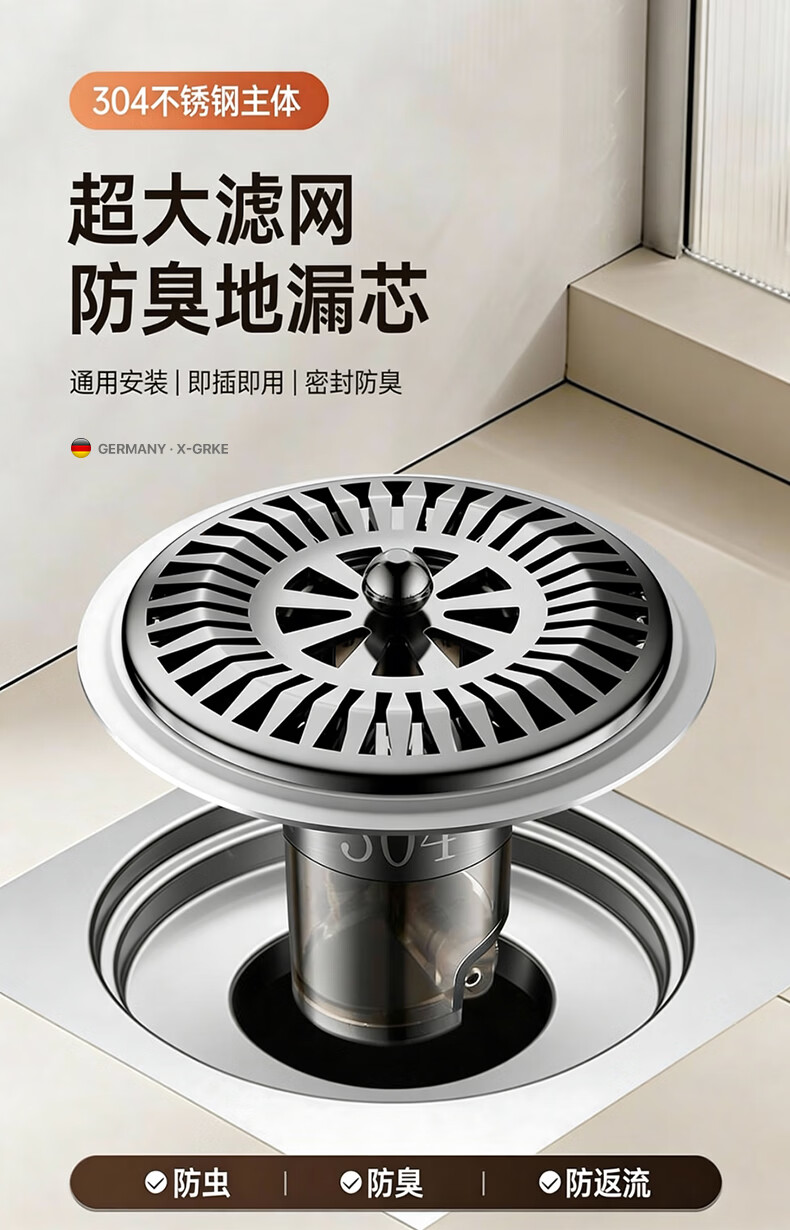 X-GRKE【德国】防臭地漏芯卫生间防虫反味神器304不锈钢下水道地漏通用 大滤网【防臭防虫防返水】磁吸地漏芯-银色 独立提篮丨极速排水丨厨卫阳台通用