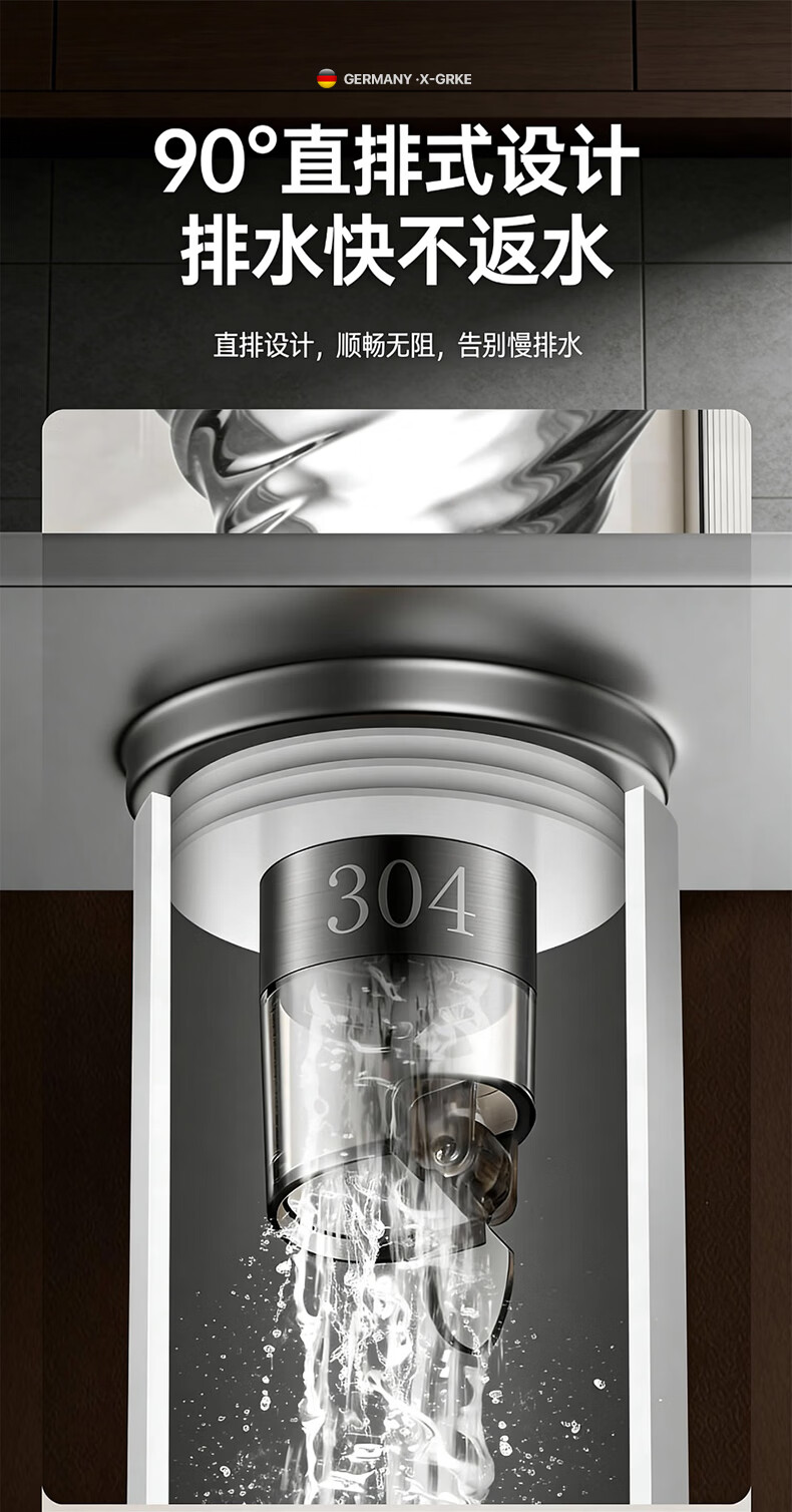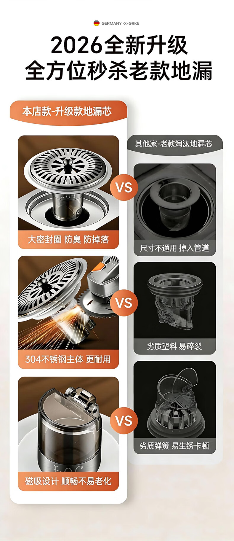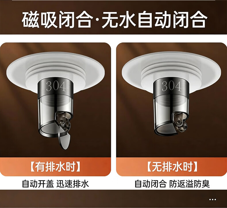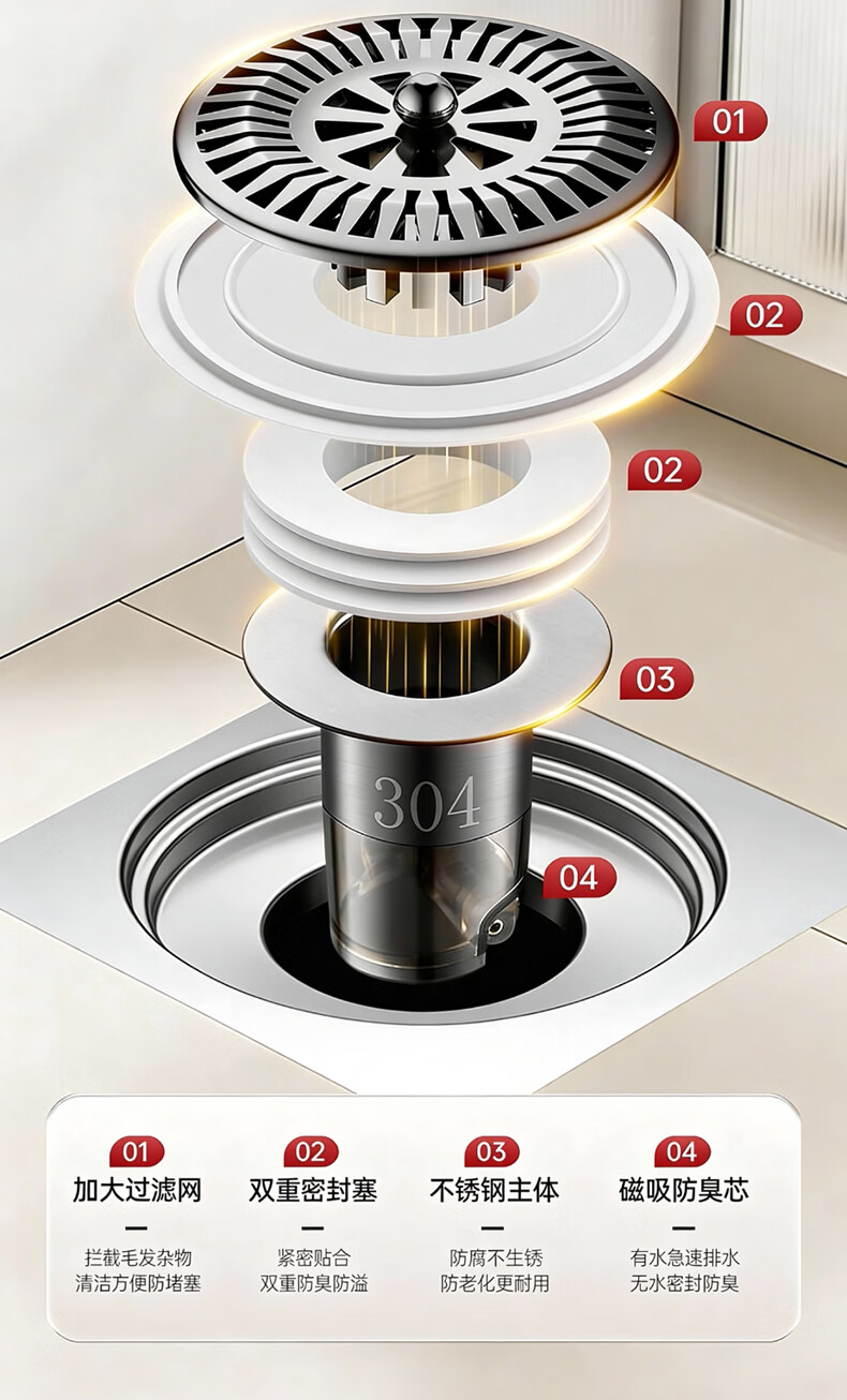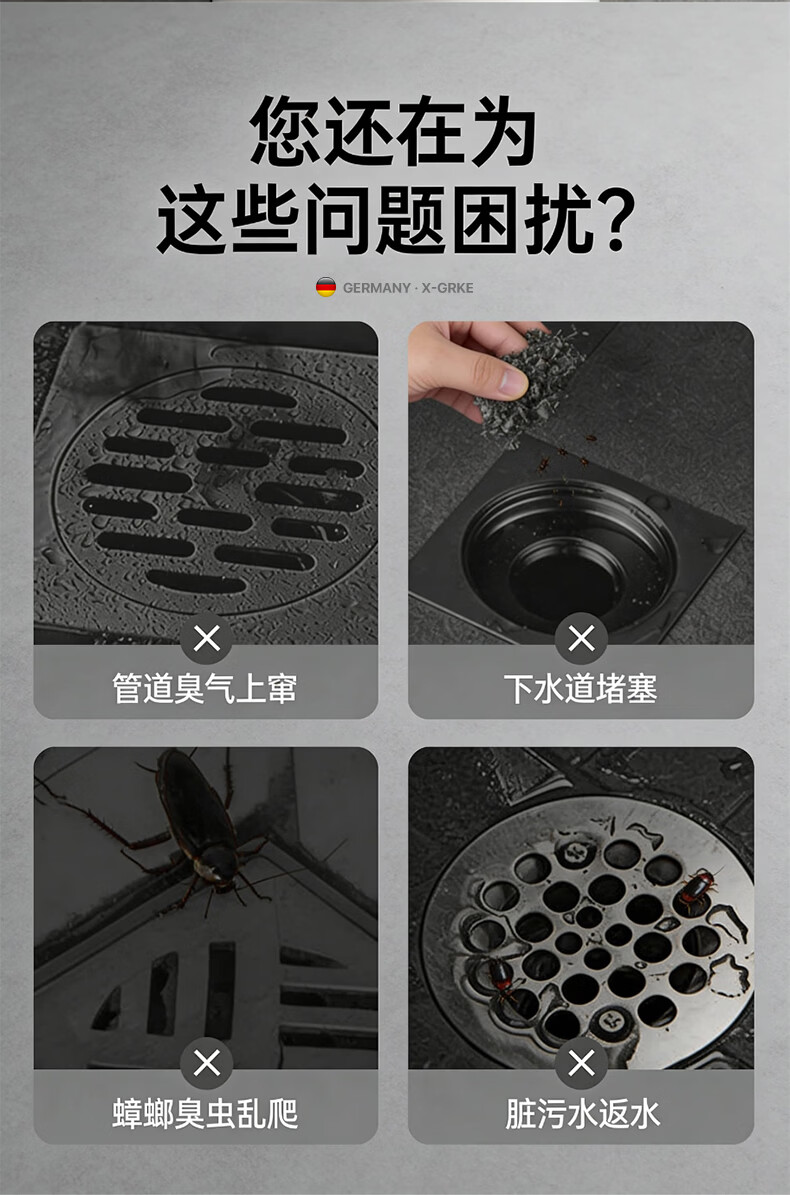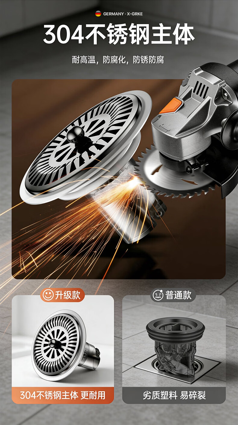X-GRKE【德国】防臭地漏芯卫生间防虫反味神器304不锈钢下水道地漏通用 大滤网【防臭防虫防返水】磁吸地漏芯-银色 独立提篮丨极速排水丨厨卫阳台通用