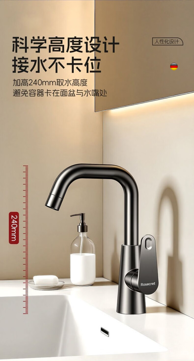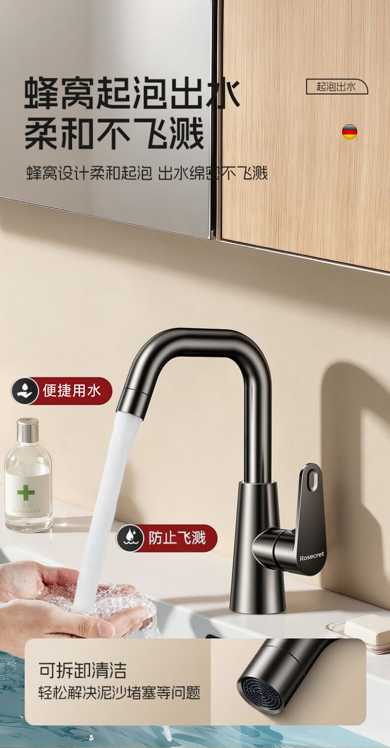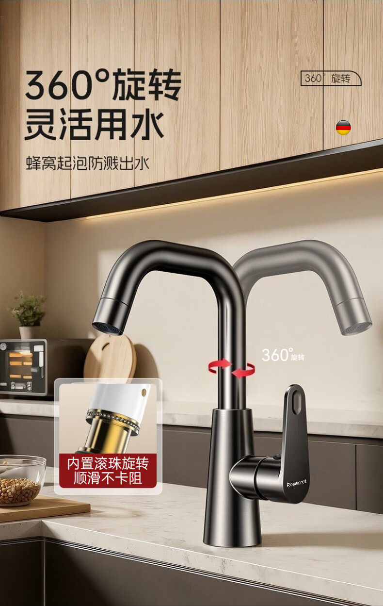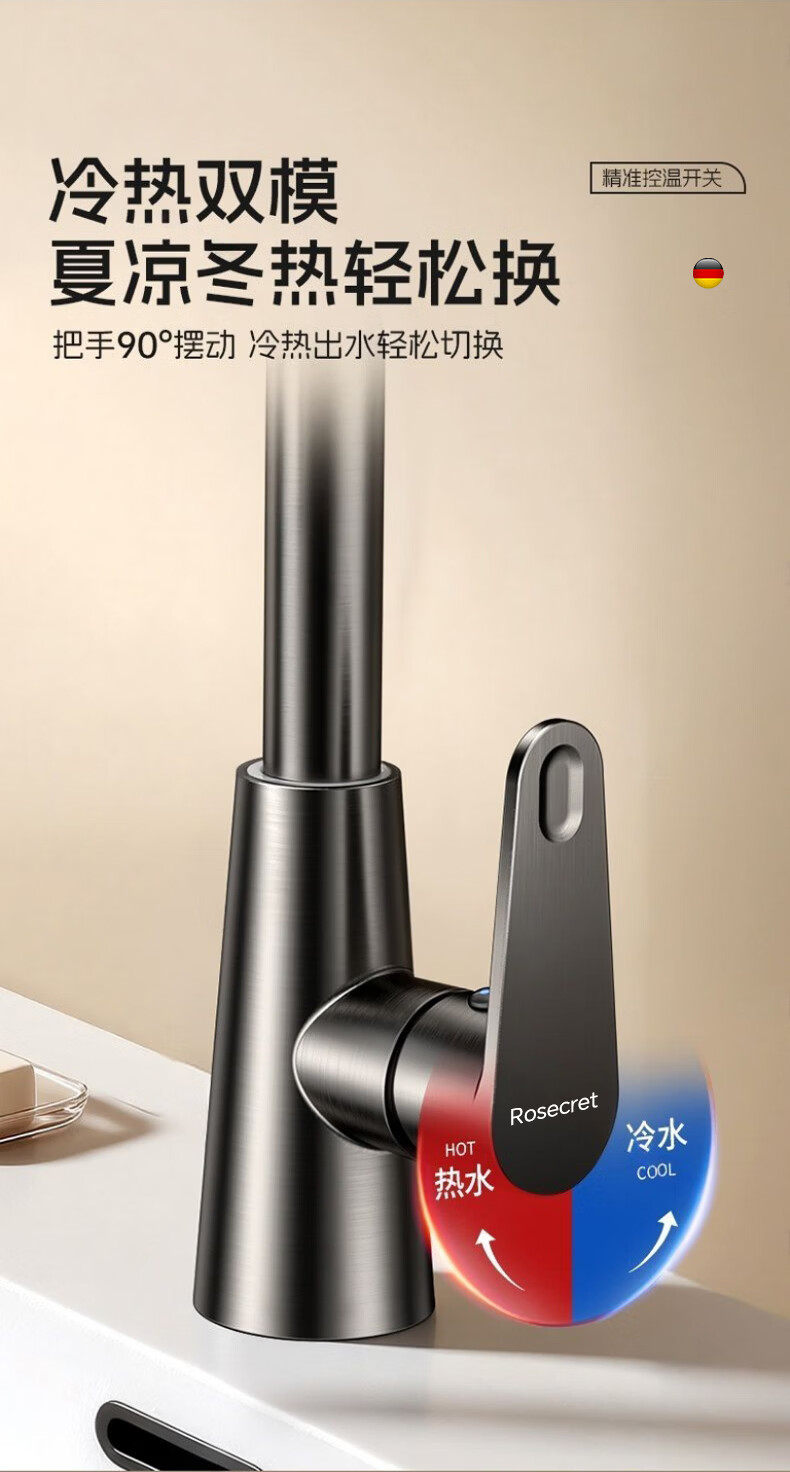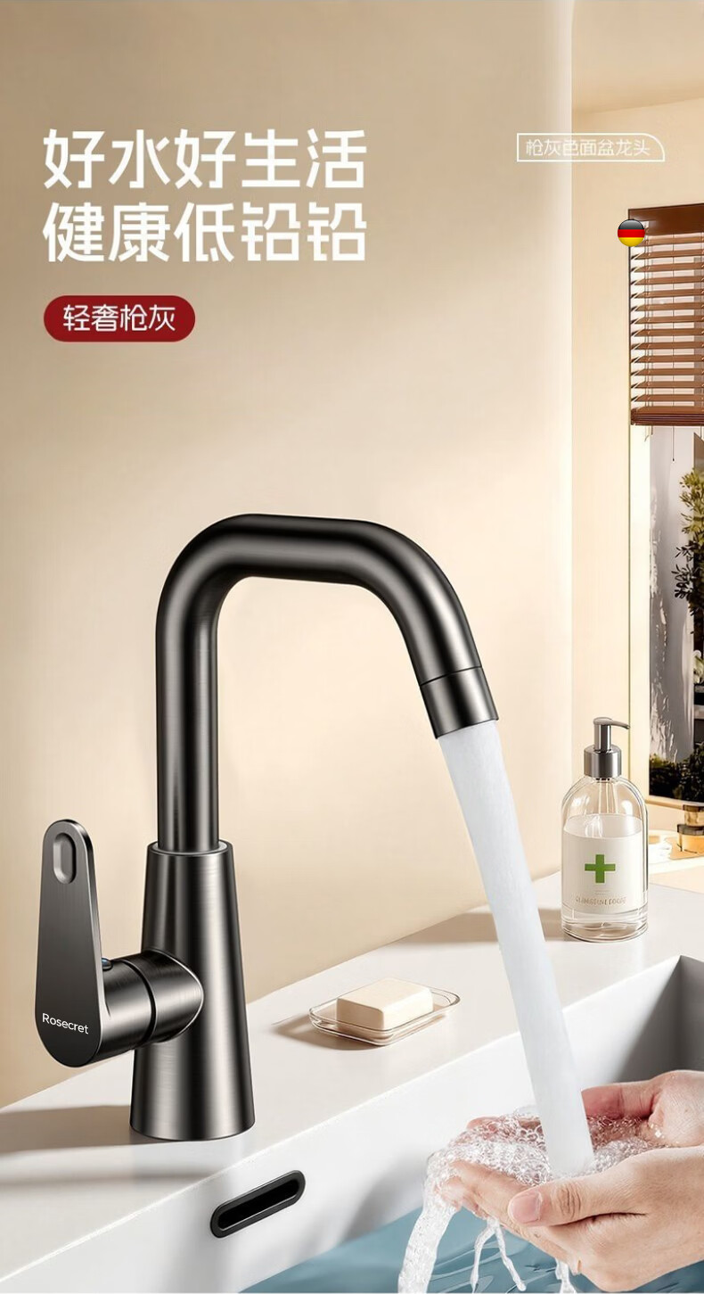 Rosecret【德国】全铜主体洗脸盆水龙头冷热水二合一厕所面盆万向旋转龙头 加厚台上盆双温龙头【枪灰色】 增压防溅丨配80cm冷热进水管*2