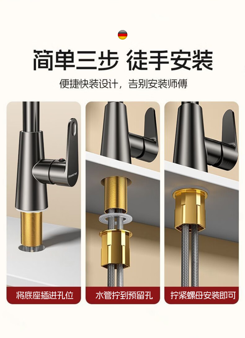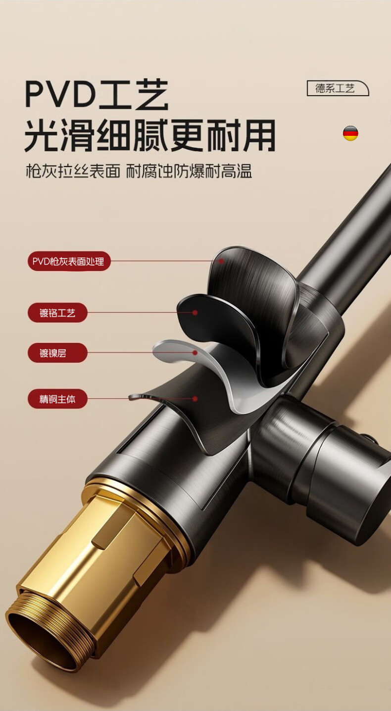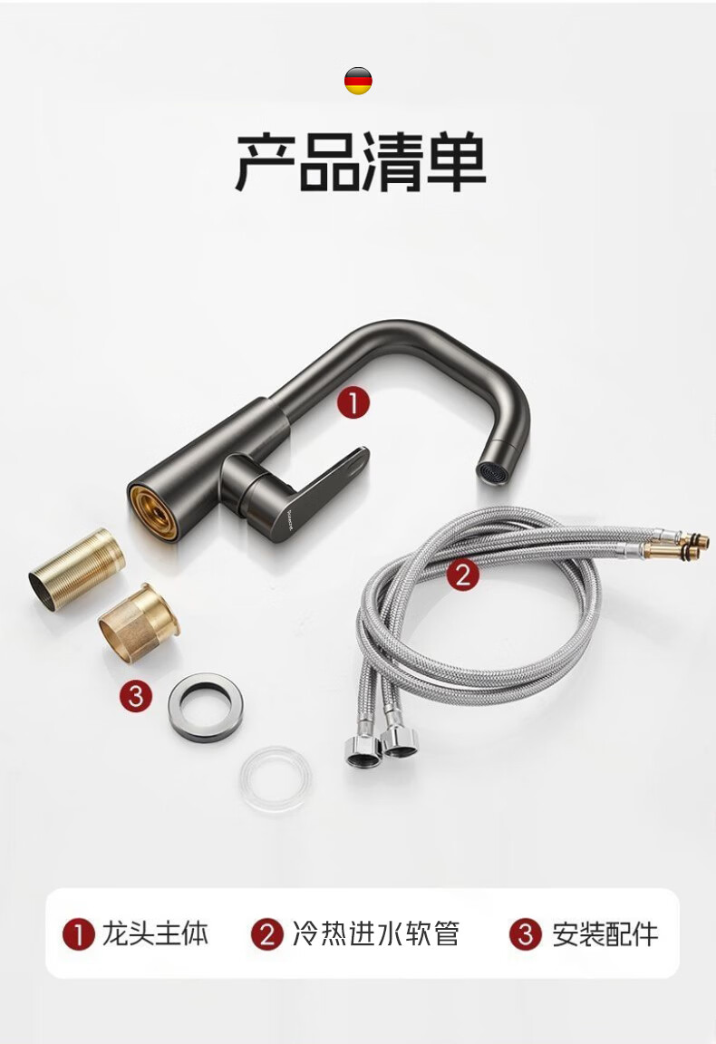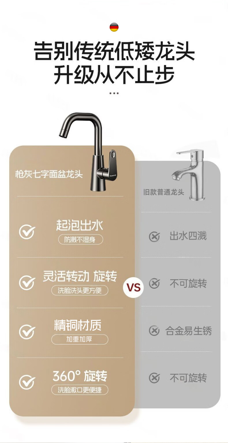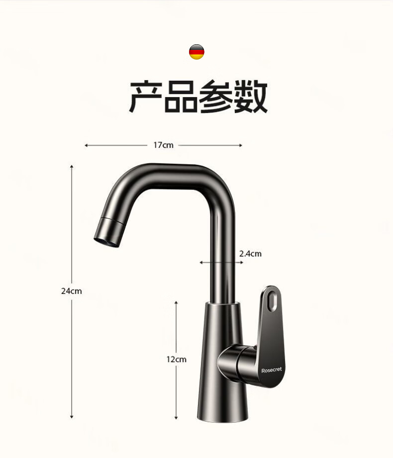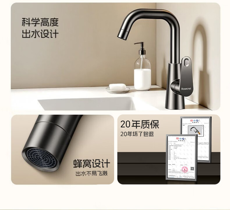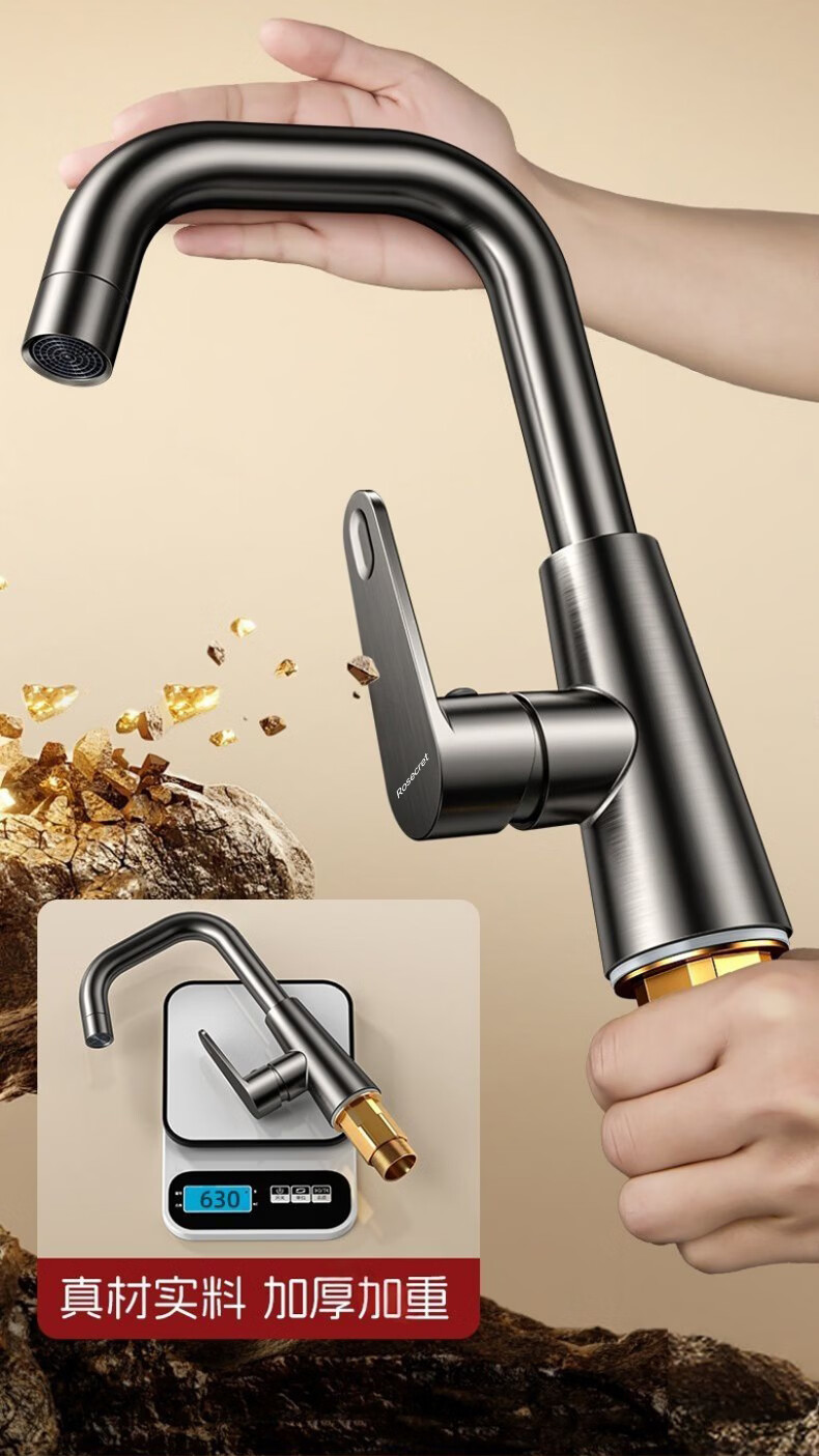 Rosecret【德国】全铜主体洗脸盆水龙头冷热水二合一厕所面盆万向旋转龙头 加厚台上盆双温龙头【枪灰色】 增压防溅丨配80cm冷热进水管*2