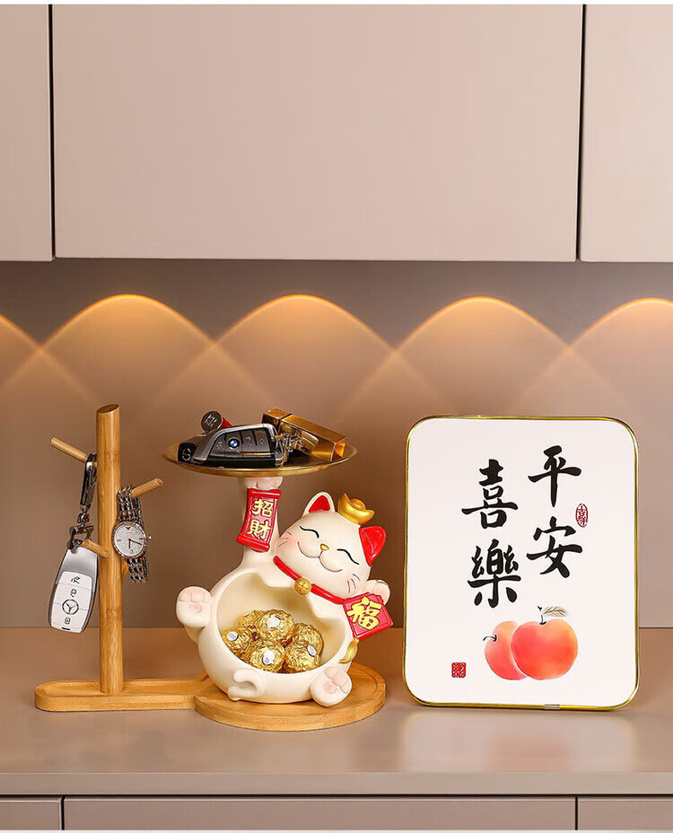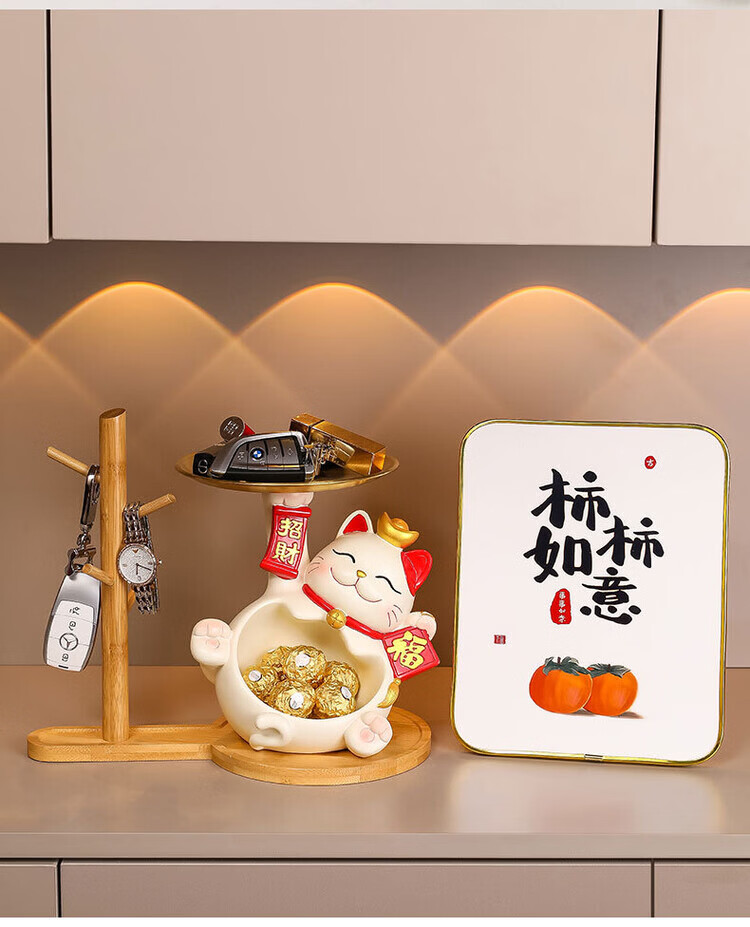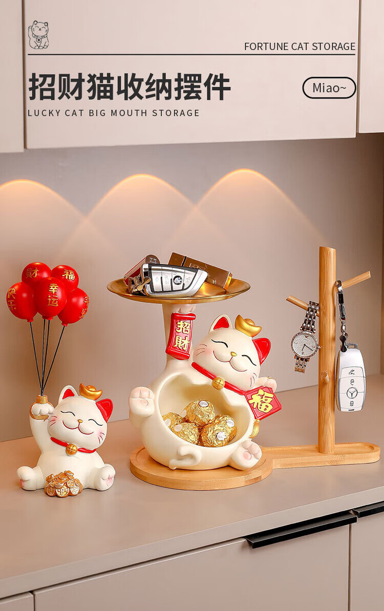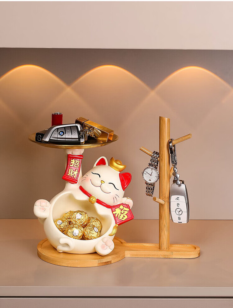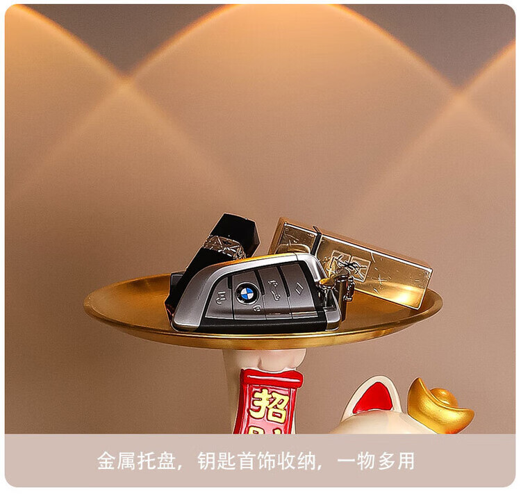 OYKTN招财猫入户摆件装饰创意乔迁新居礼物钥匙收纳托盘新款装饰礼品女 【两件套】托盘大肚收纳招财猫+葫芦木色架