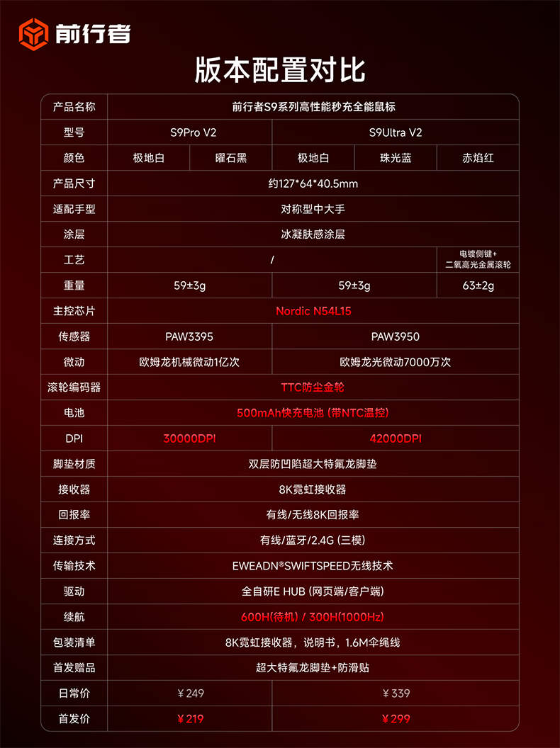前行者S9Pro/Ultra有线无线鼠标蓝牙三模轻量化游戏PAW3950/3395电竞8K回报率笔记本台式电脑中大手专用 S9Pro夜黑-3395+凯华白刃+支持无线8K