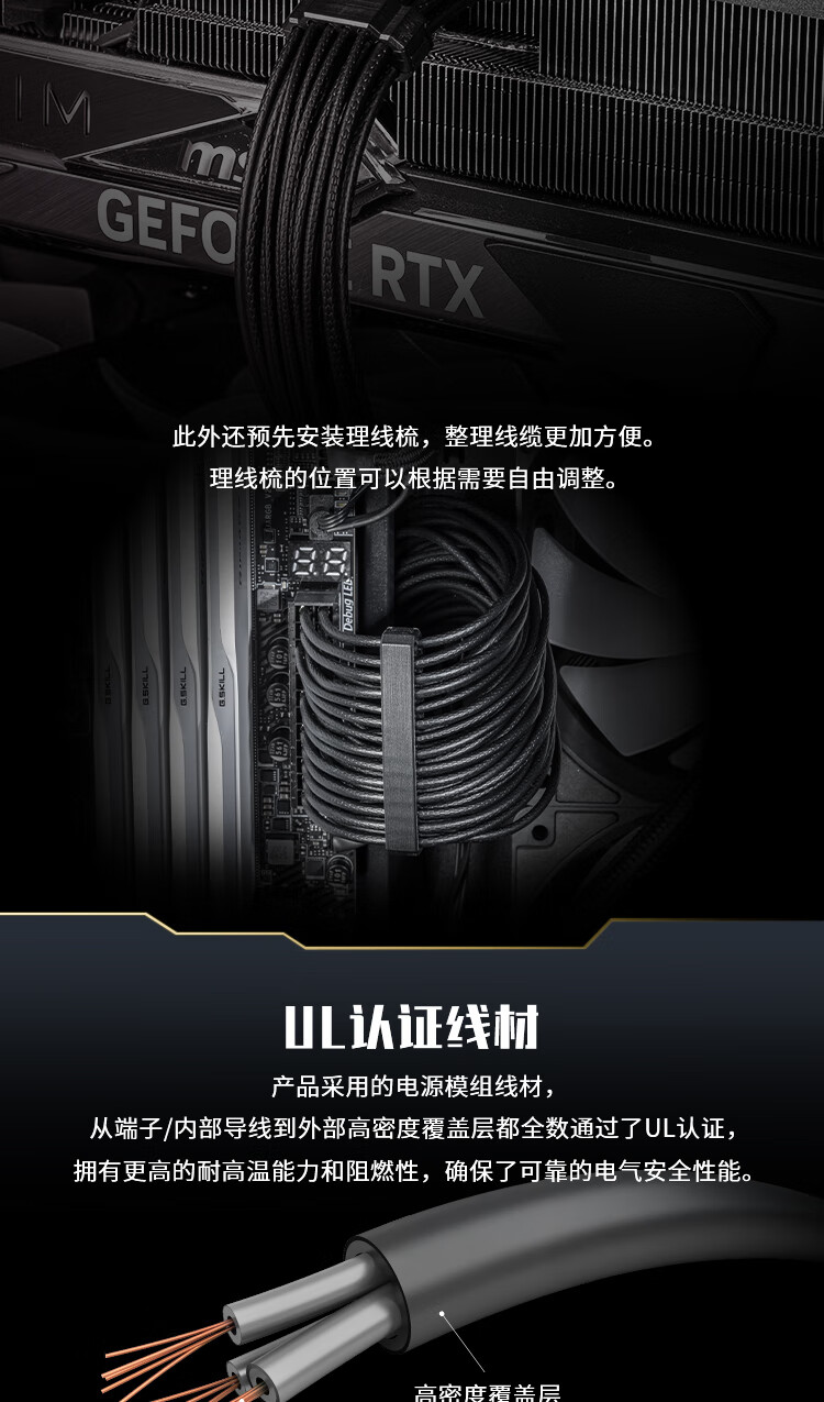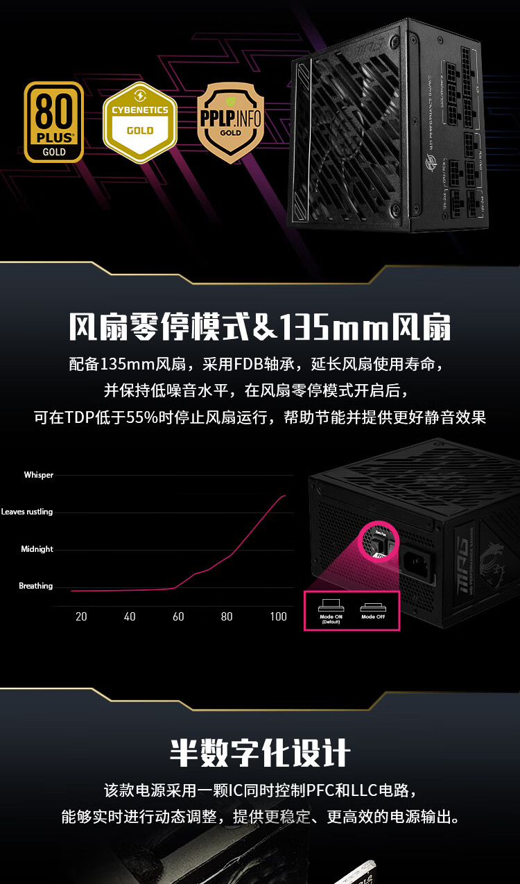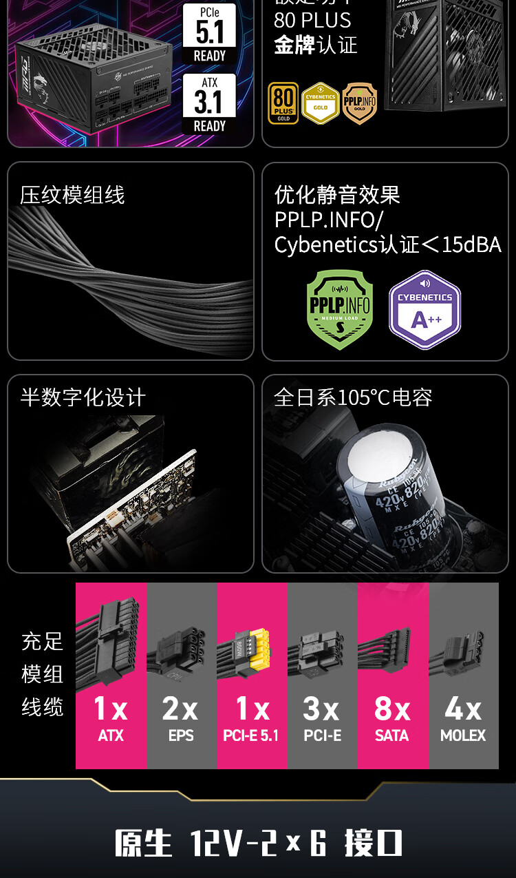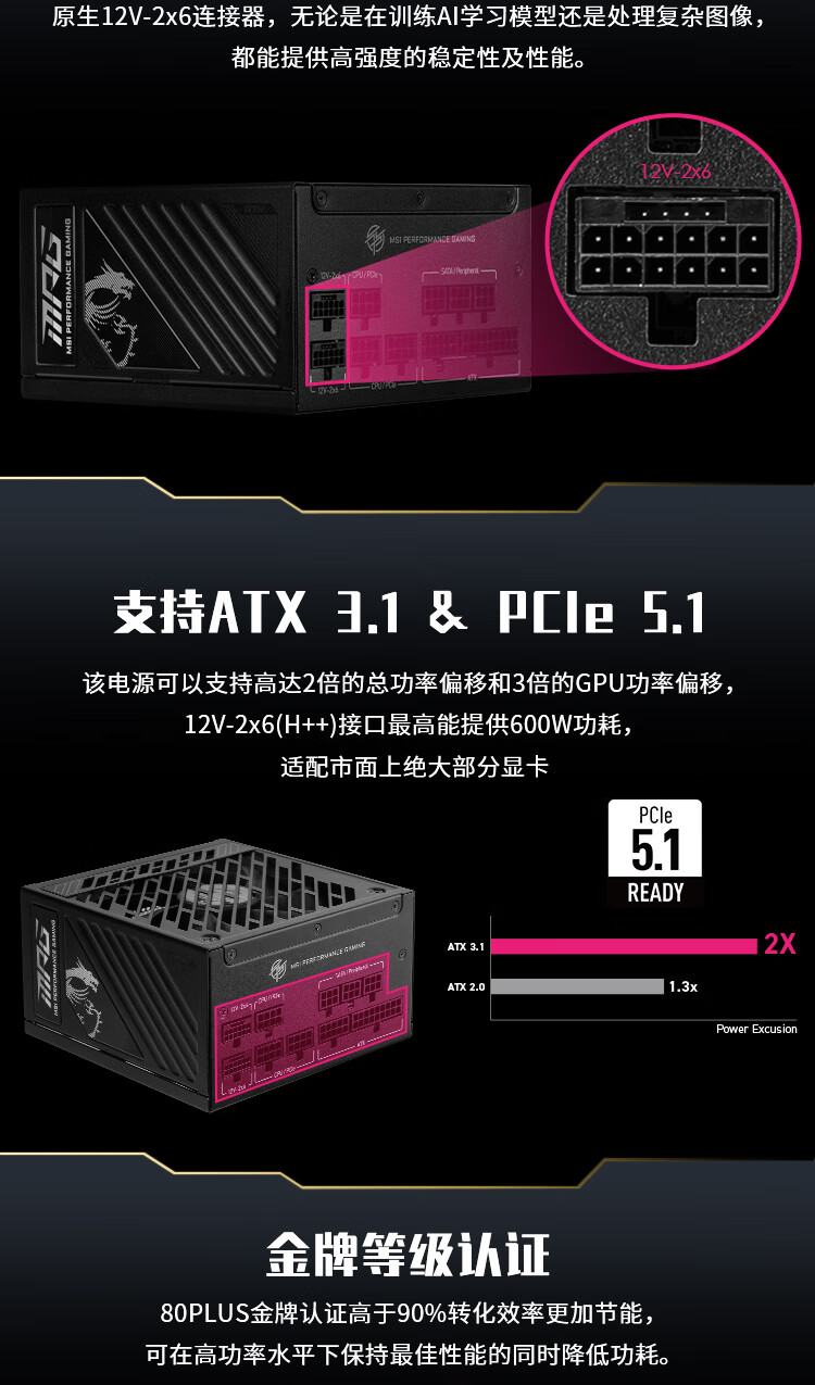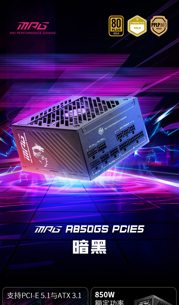 微星微星 额定850W金牌全模组电脑电源ATX3.1/原生16PIN/十年保障/全日系电容/适配5080显卡MPG A850GS
