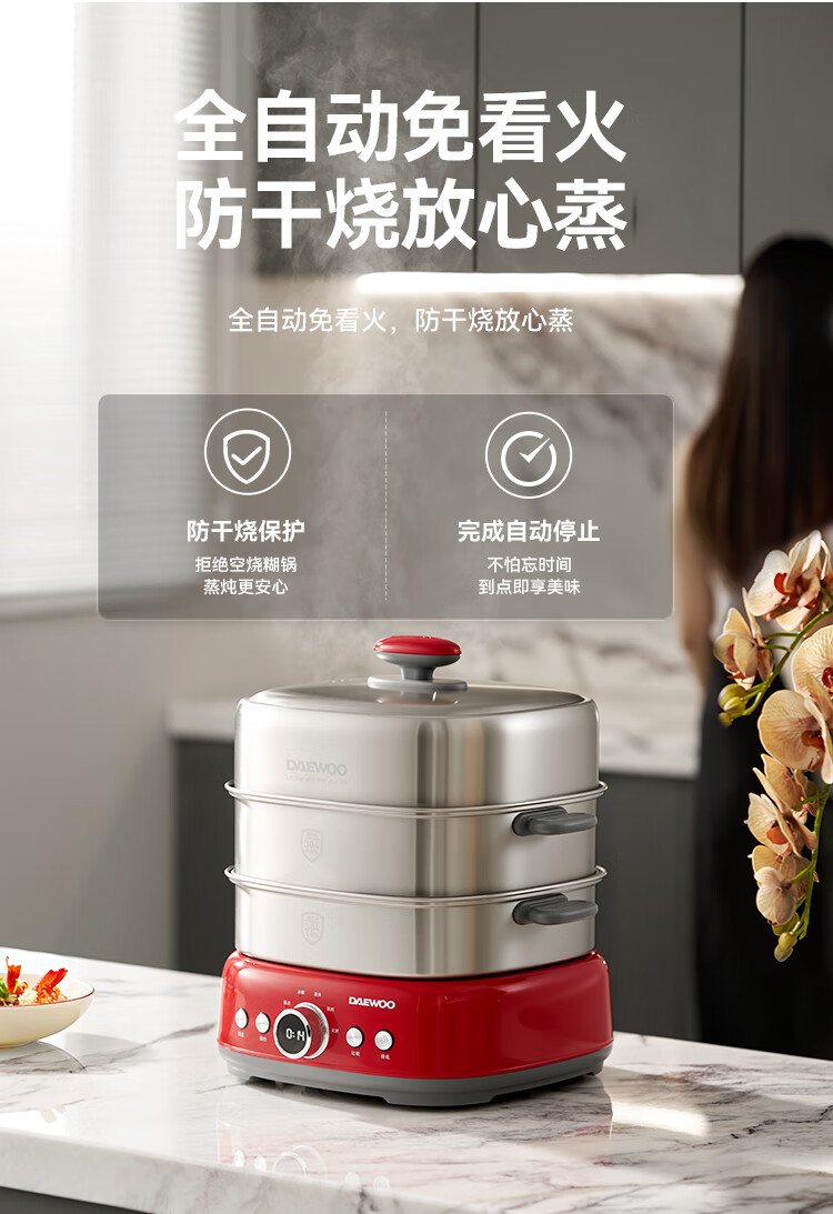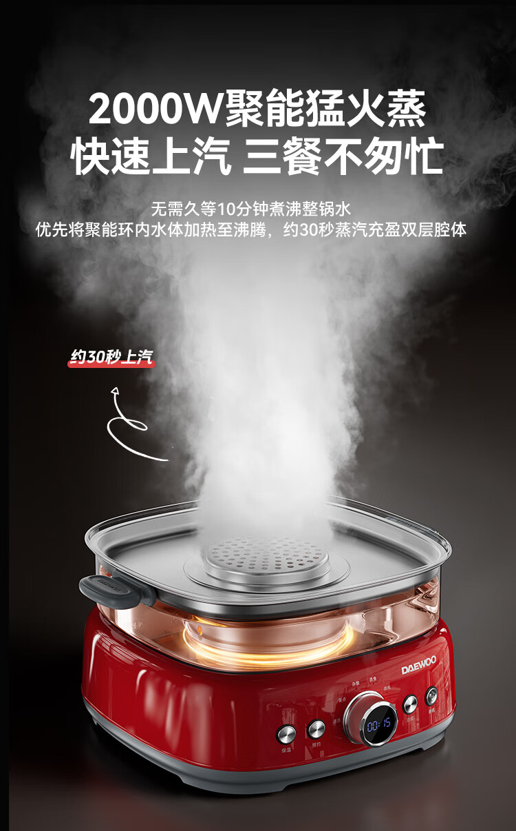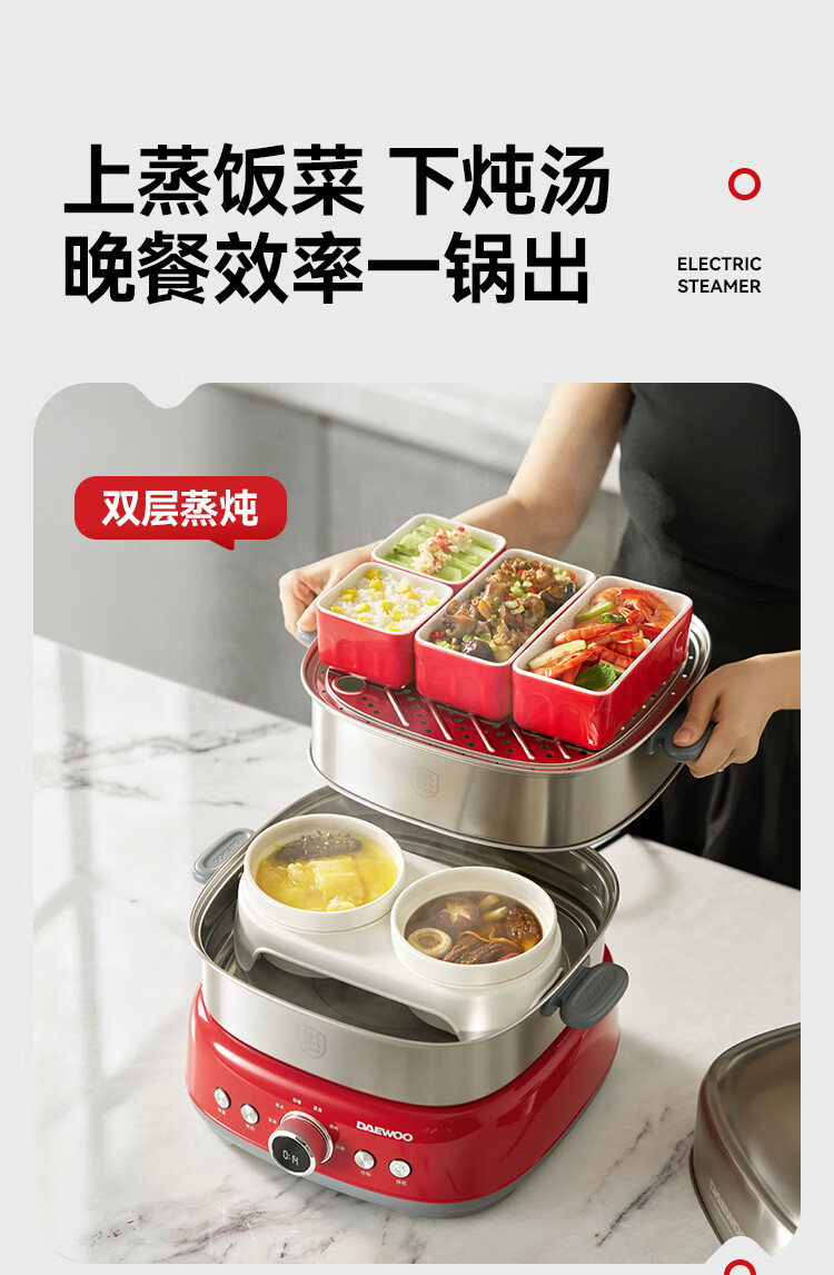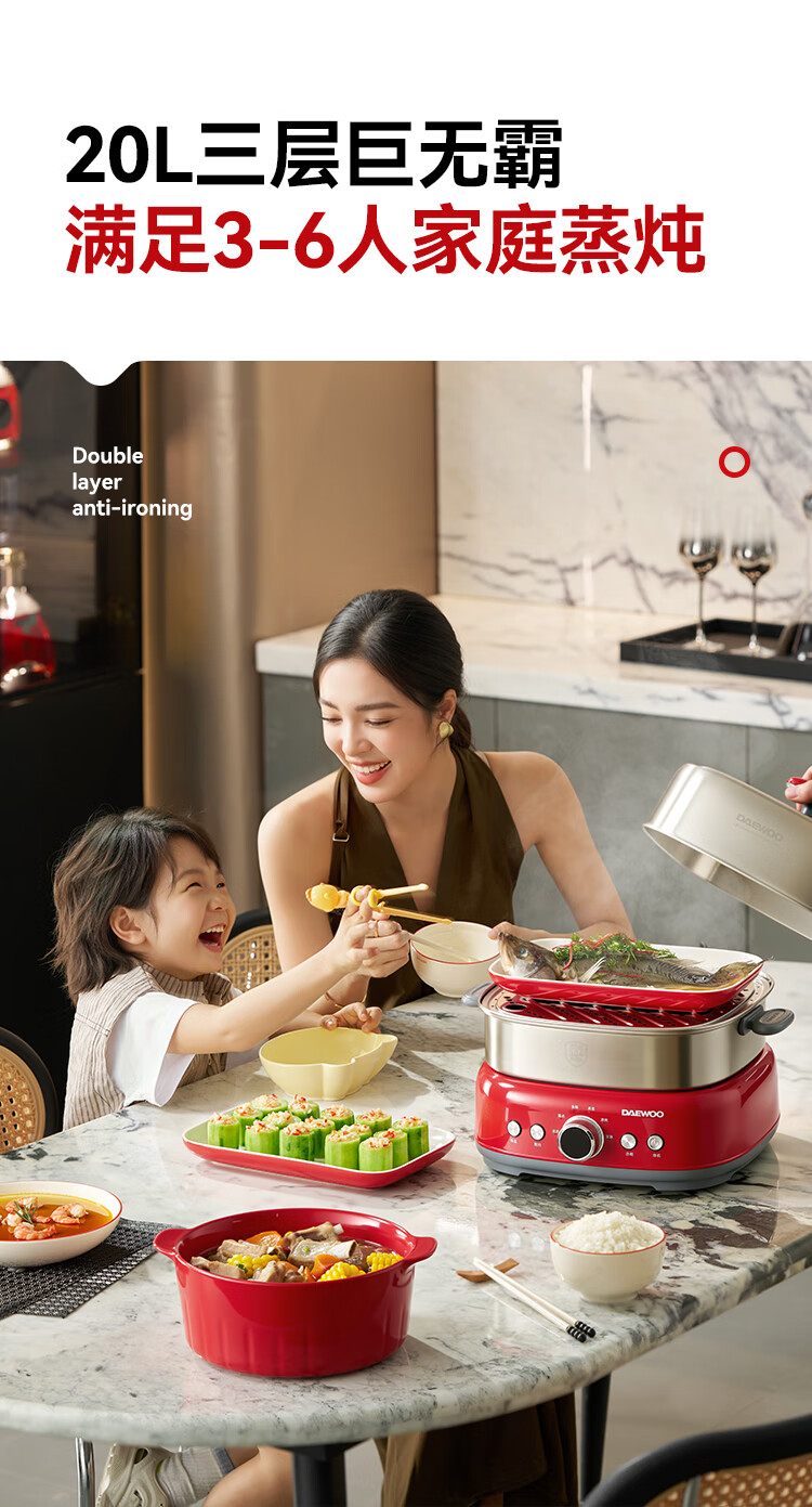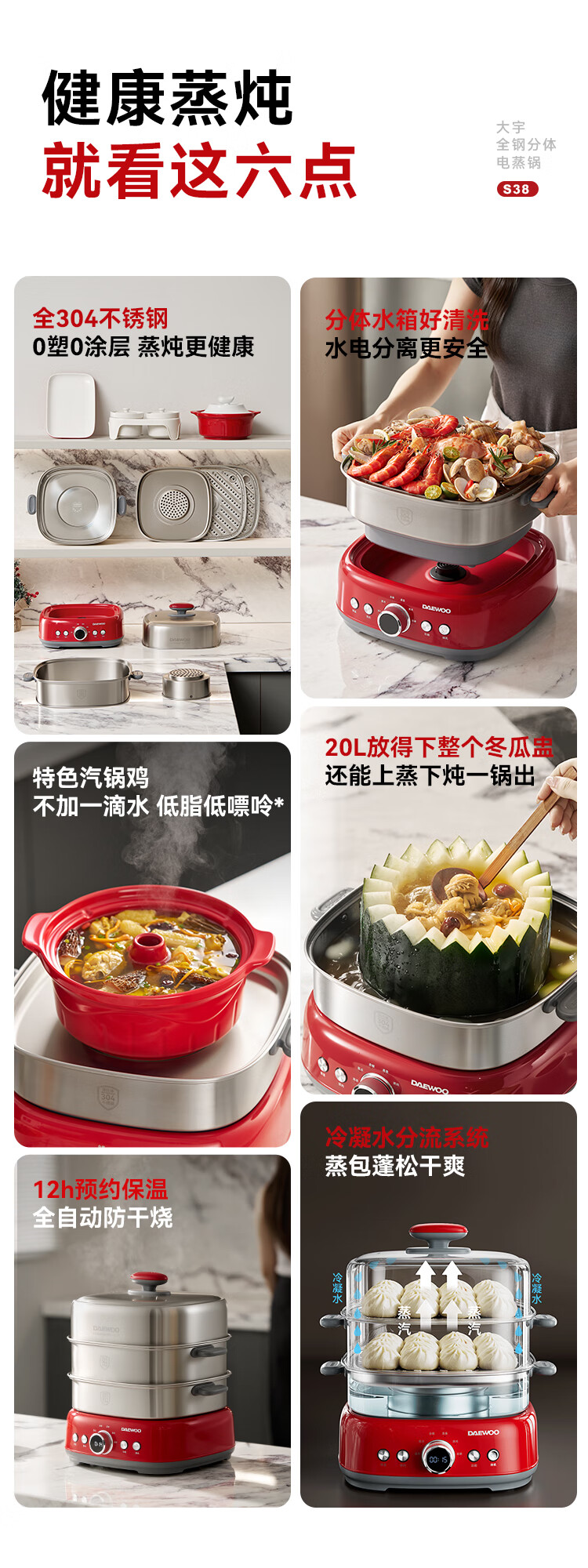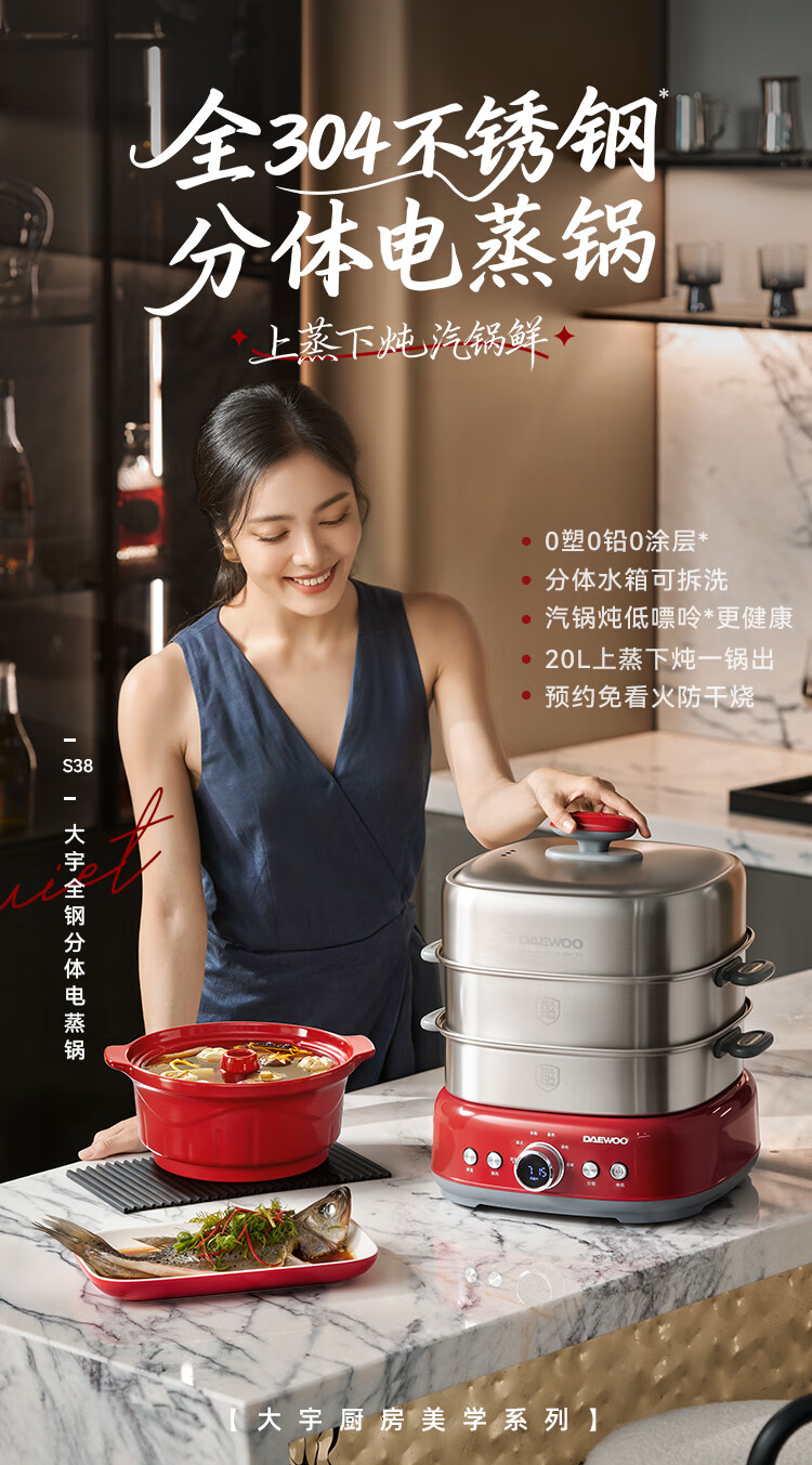 大宇(DAEWOO)电蒸锅火锅蒸炖煮一体多功能汽锅 全304不锈钢0涂层 20升3层大容量家用可拆卸 预约定时 防干烧S38