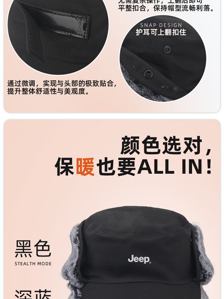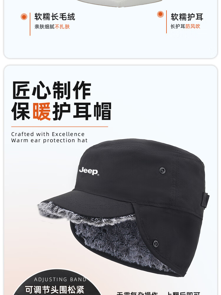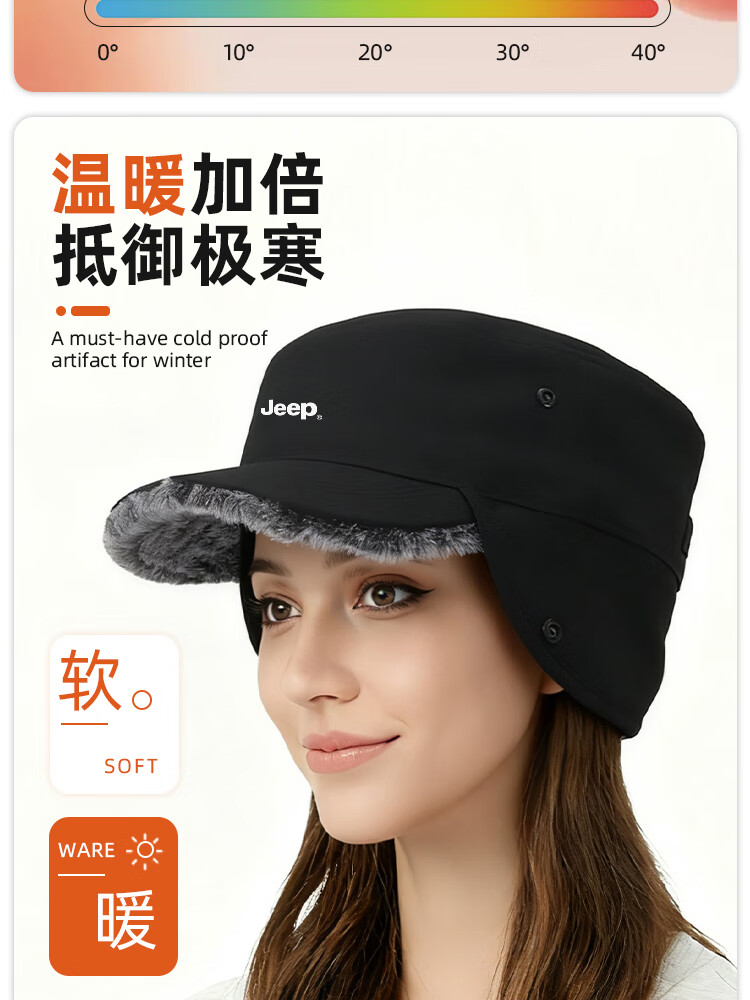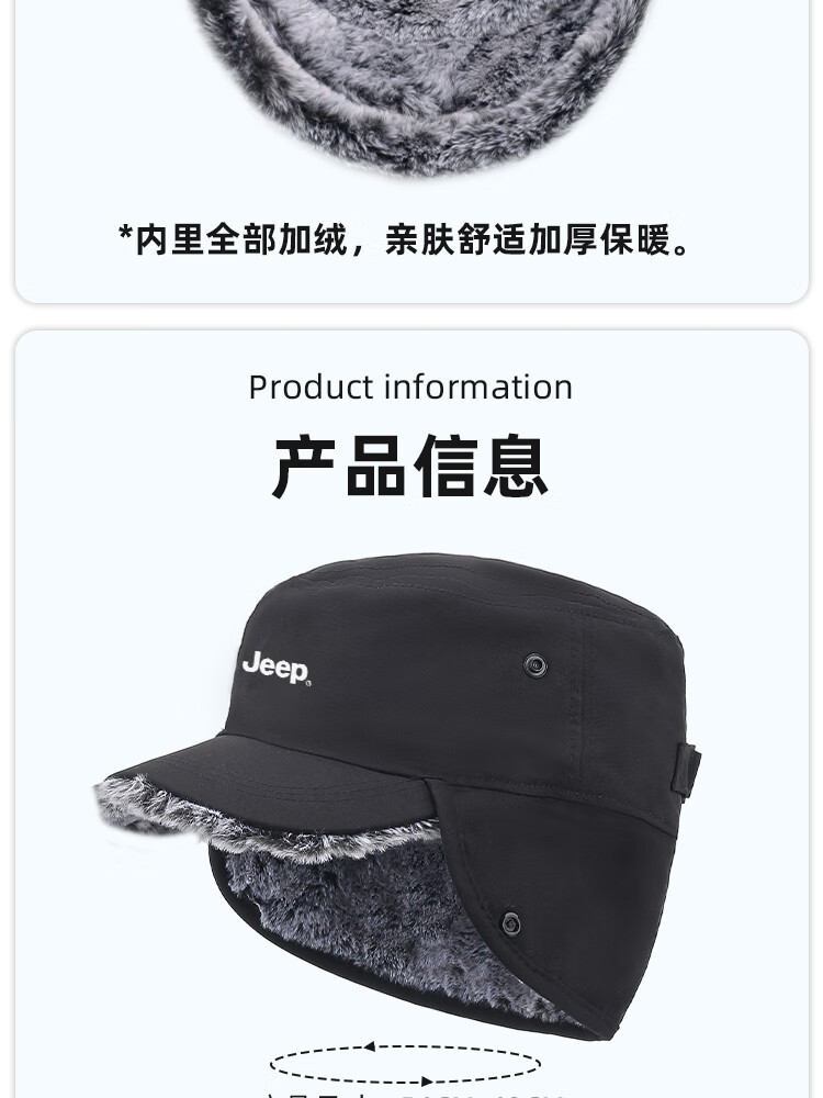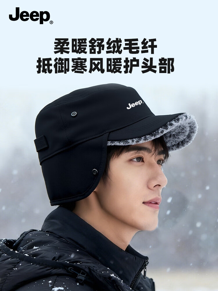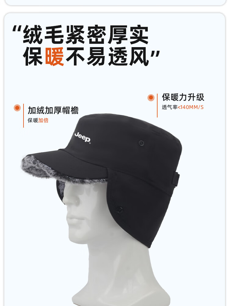 JEEP帽子男士冬季防寒护耳帽女防风防雨加厚中老年人高档保暖棉平顶帽 黑色【加绒加厚 送爸爸 温暖加倍】 JEEP正品丨均码有弹性