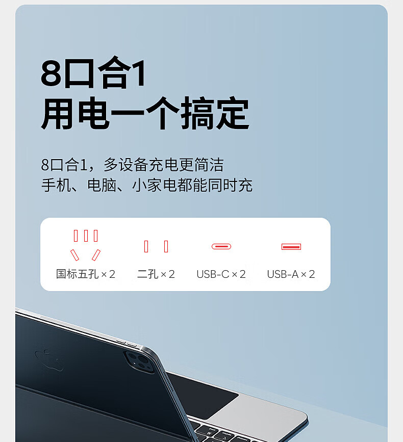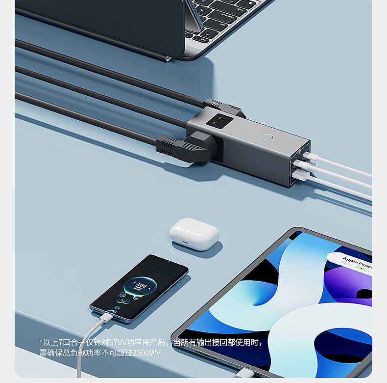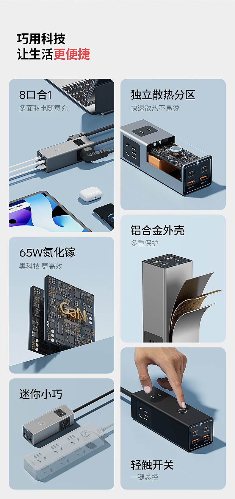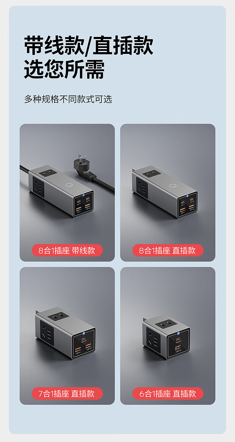 国际电工(FDD)旅行便携能量舱氮化镓65W快充插座多功能USB迷你桌面插排带线插头 直插款-14孔插座 灰色
