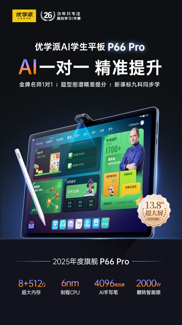 优学派学习机P66 Pro 16G+512G 13.8英寸圆偏振光护眼屏学生平板学习机一年级到高中同步辅导AI学练机 优学派P66 8G+8G+512G