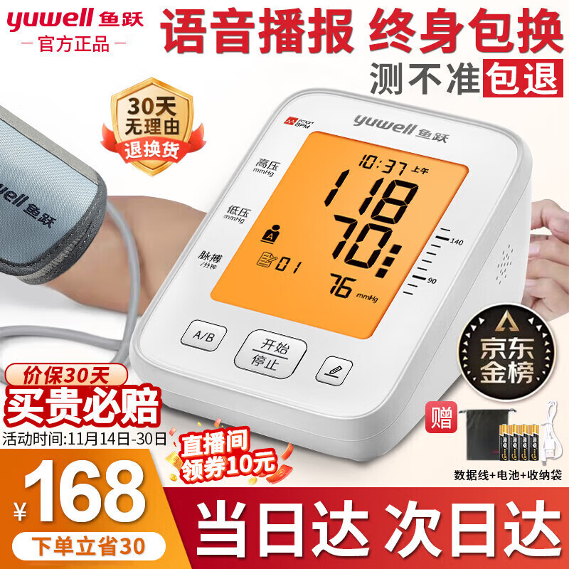 鱼跃(yuwell)医用级高精准电子血压计血压仪家用臂式量高血压测量仪器老人 语 语音双供电+血压脉率双测+误动作提醒+认证