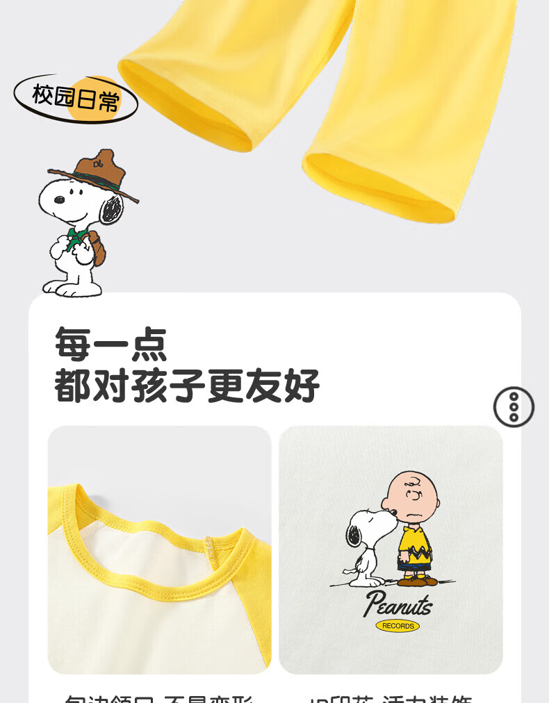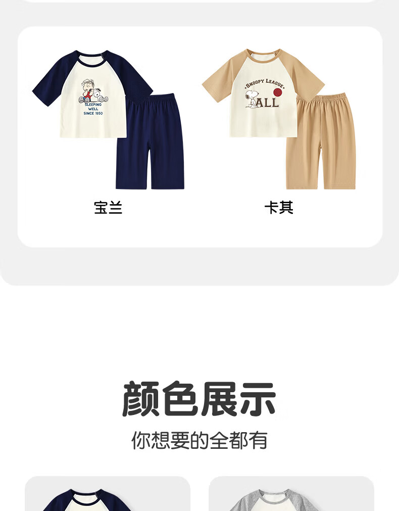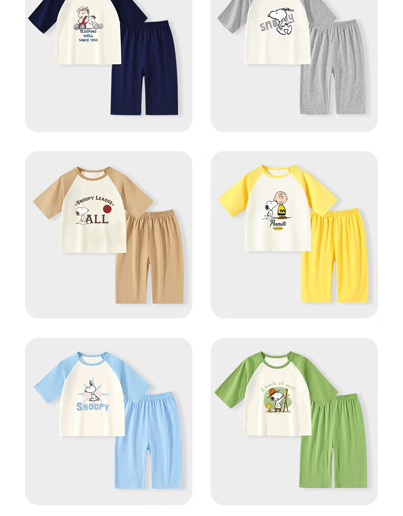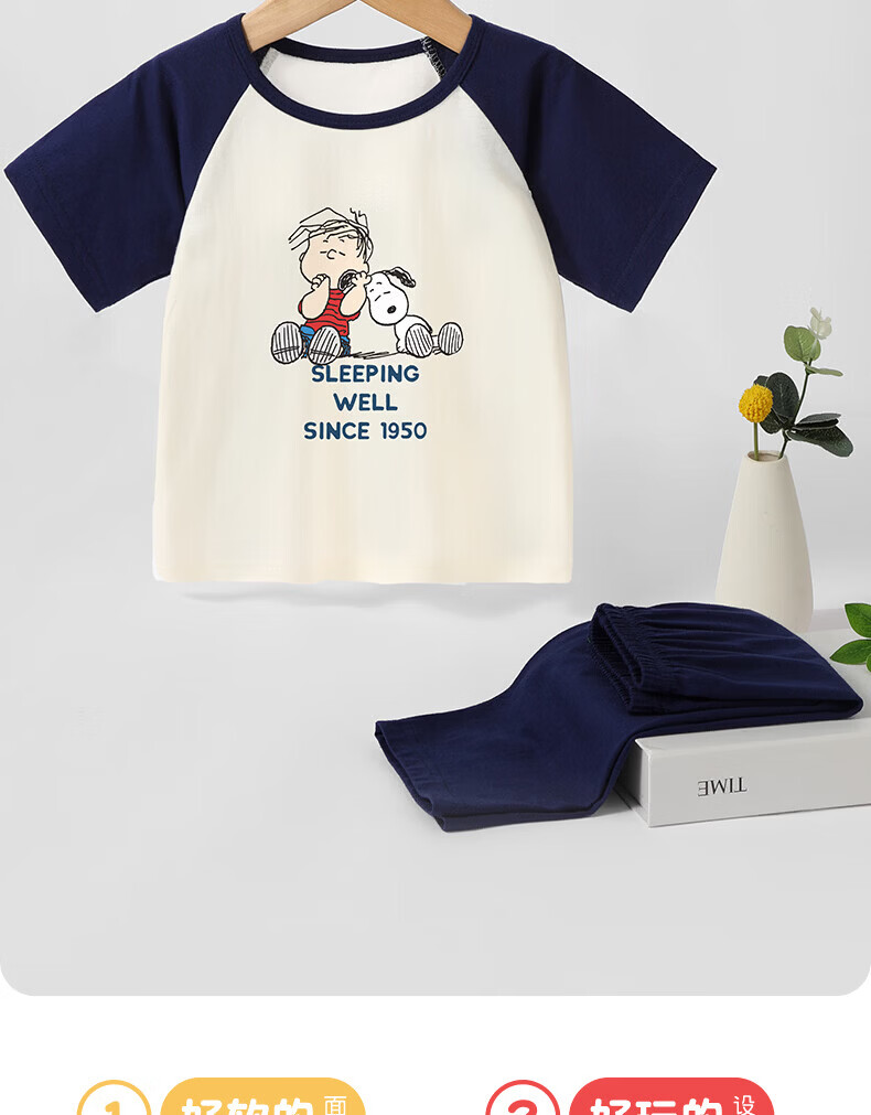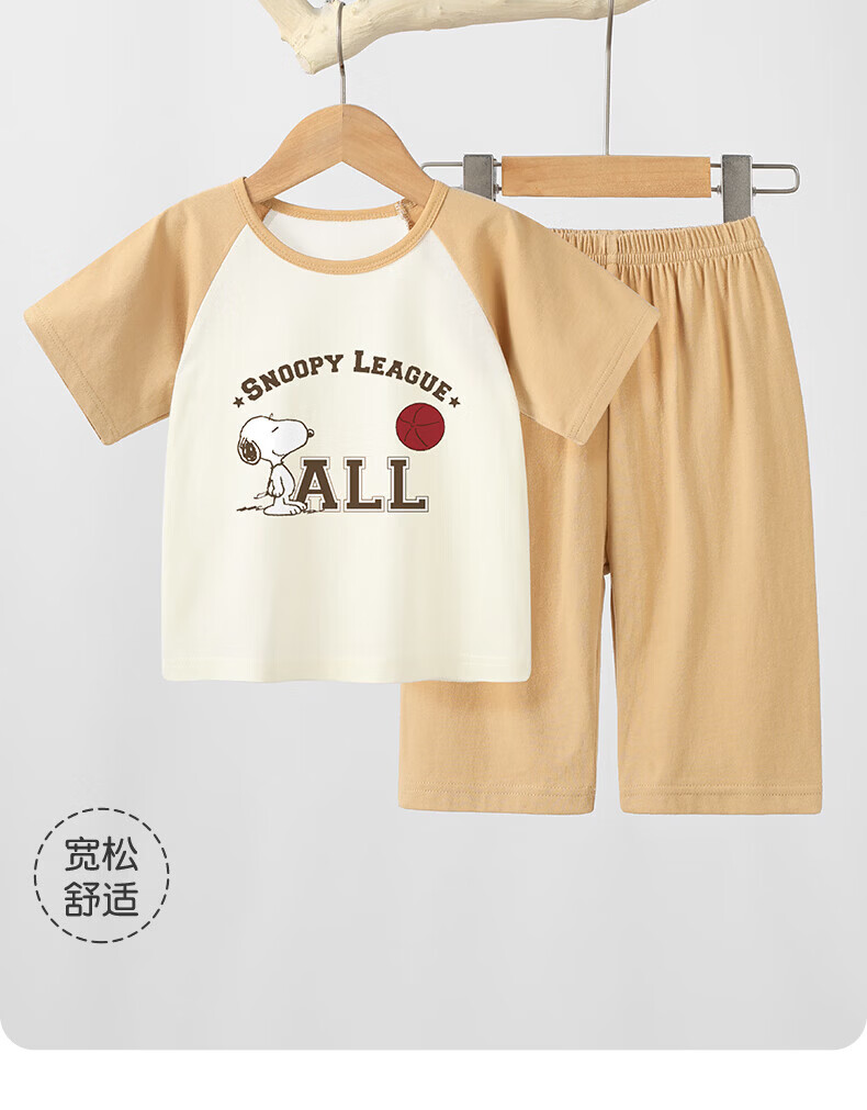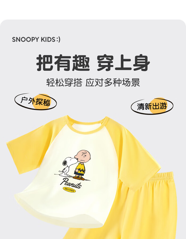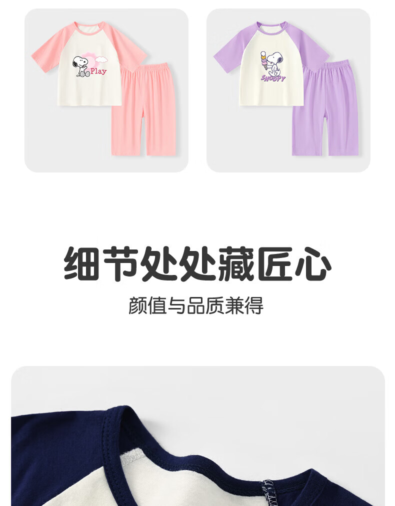 史努比(SNOOPY)儿童纯棉家居服睡衣透气男女童夏季空调服中袖套装 宝蓝小朋友和努比 140