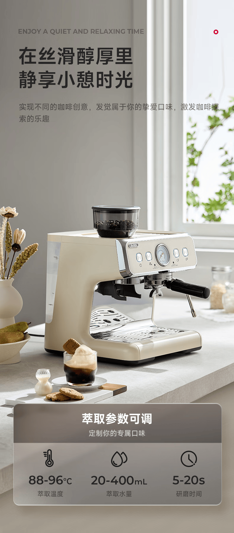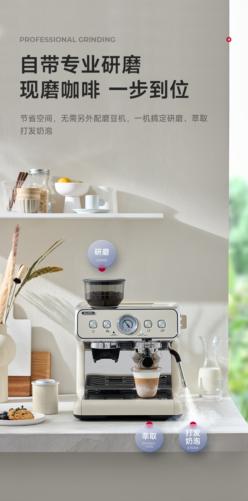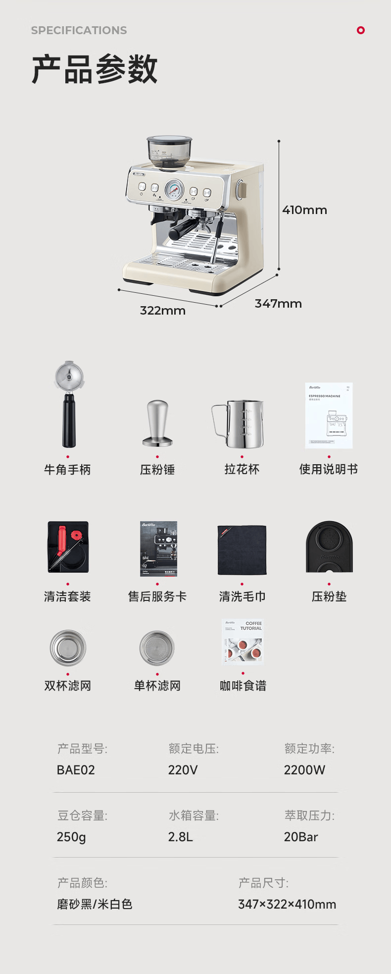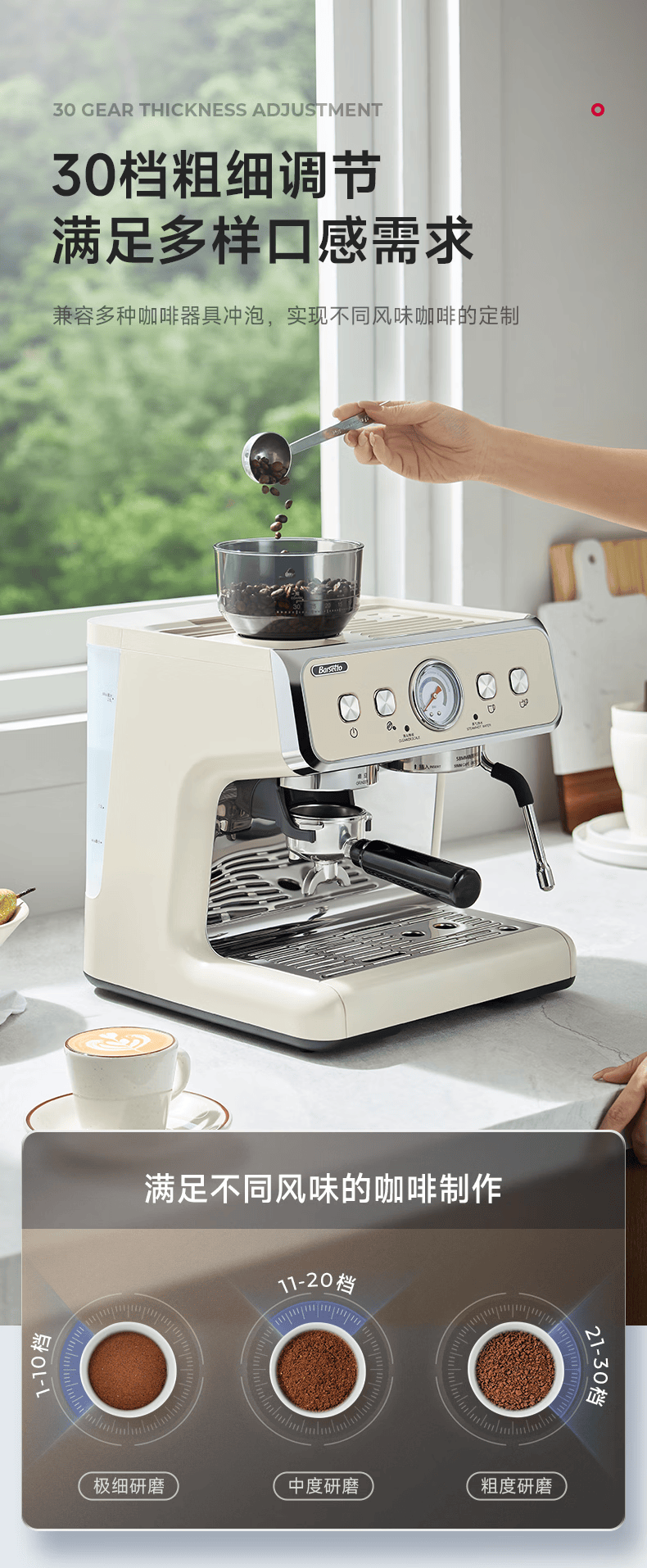Barsetto意大利百胜图BAE02二代研磨咖啡机双锅炉双泵意式咖啡机半自动咖啡机带现研磨豆一体奶茶店小商用 BAE02(白色) 经济型震动泵