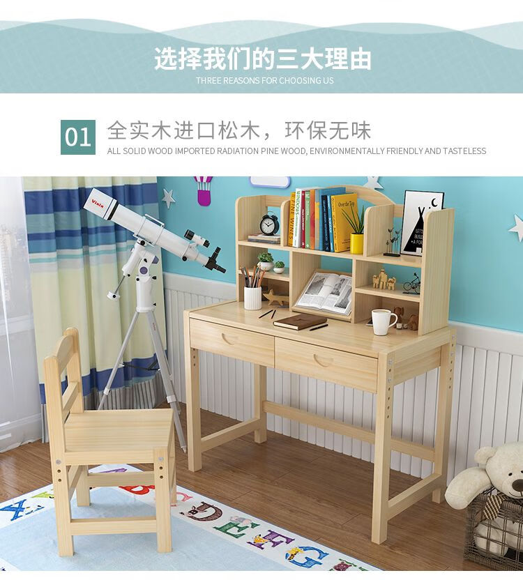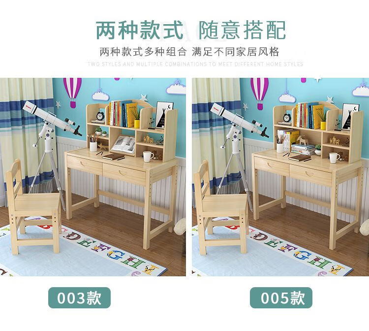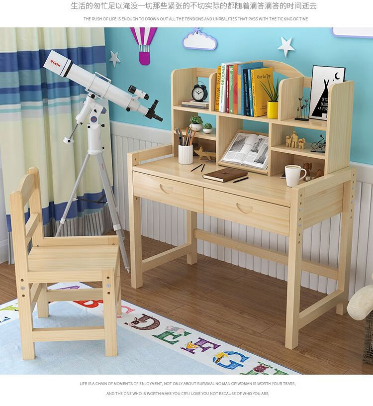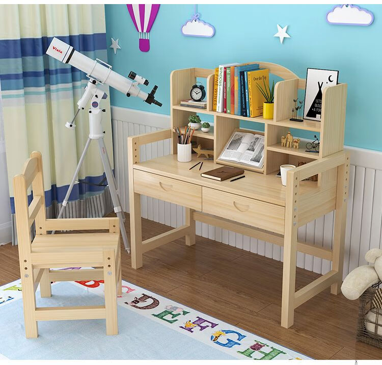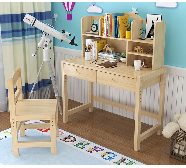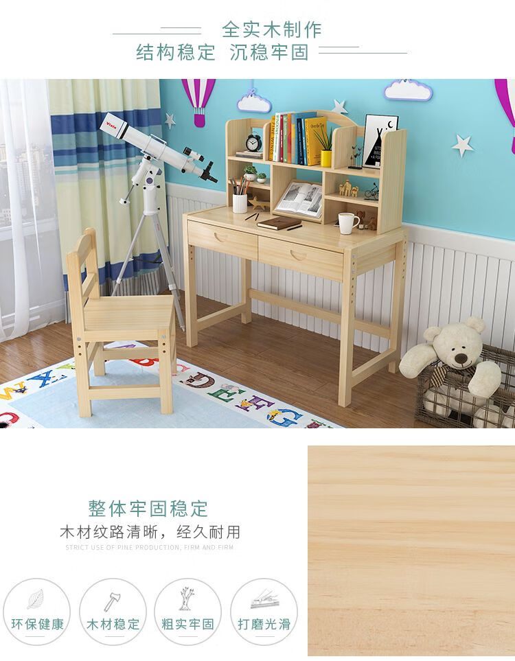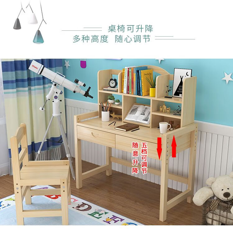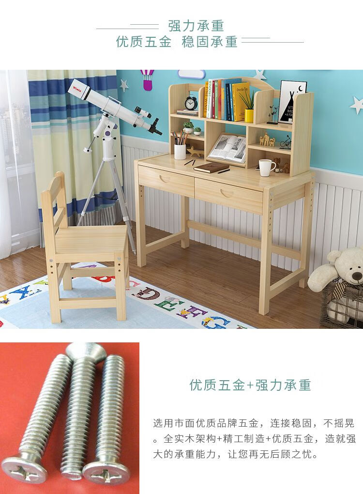 弘星隆实木儿童学习桌可升降儿童书桌小学生写字桌椅套装松木全实木书桌 05款天然原木无漆 80*50*75桌椅一套可升降
