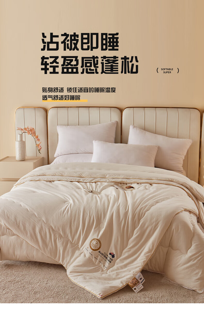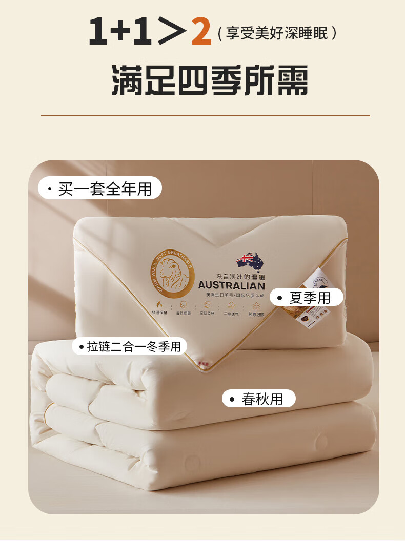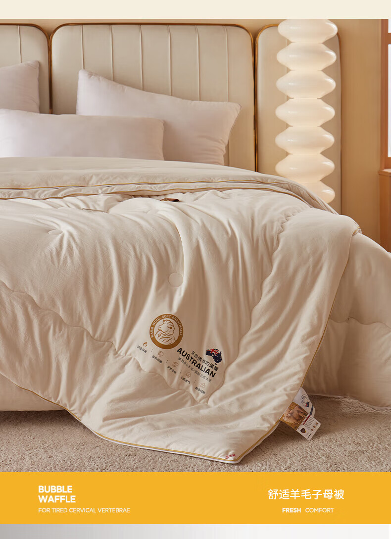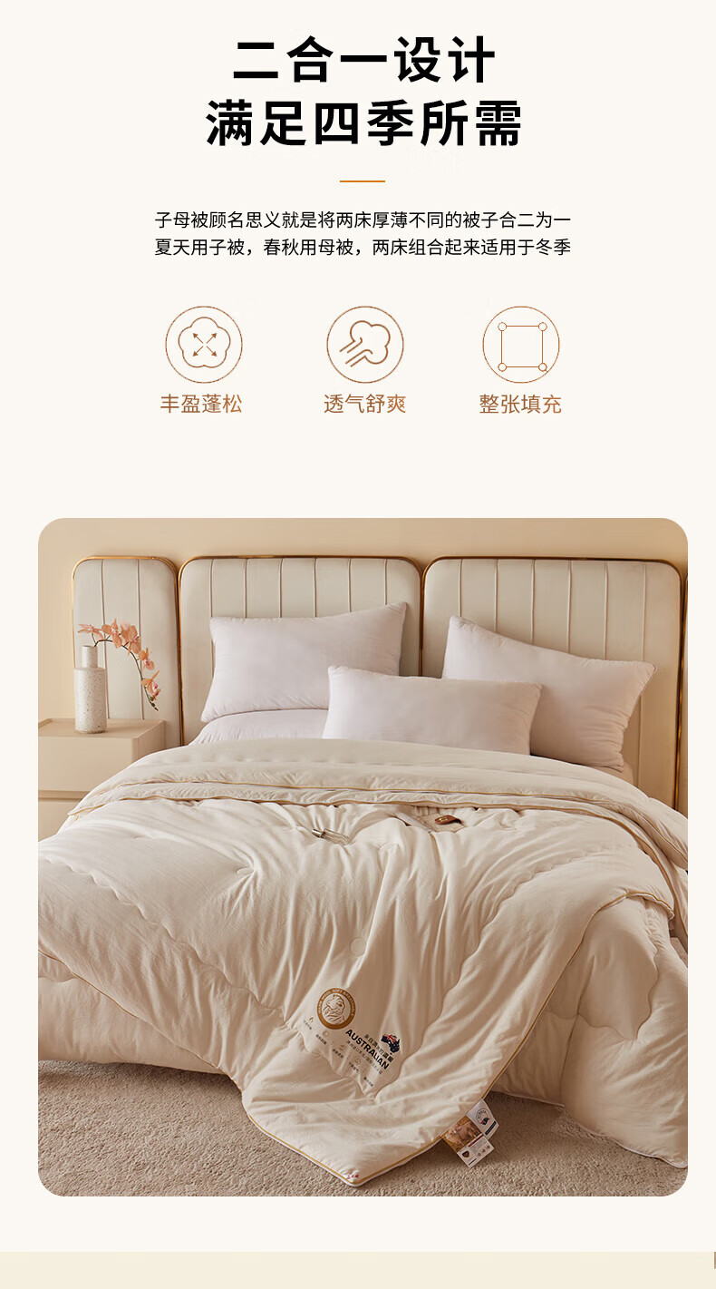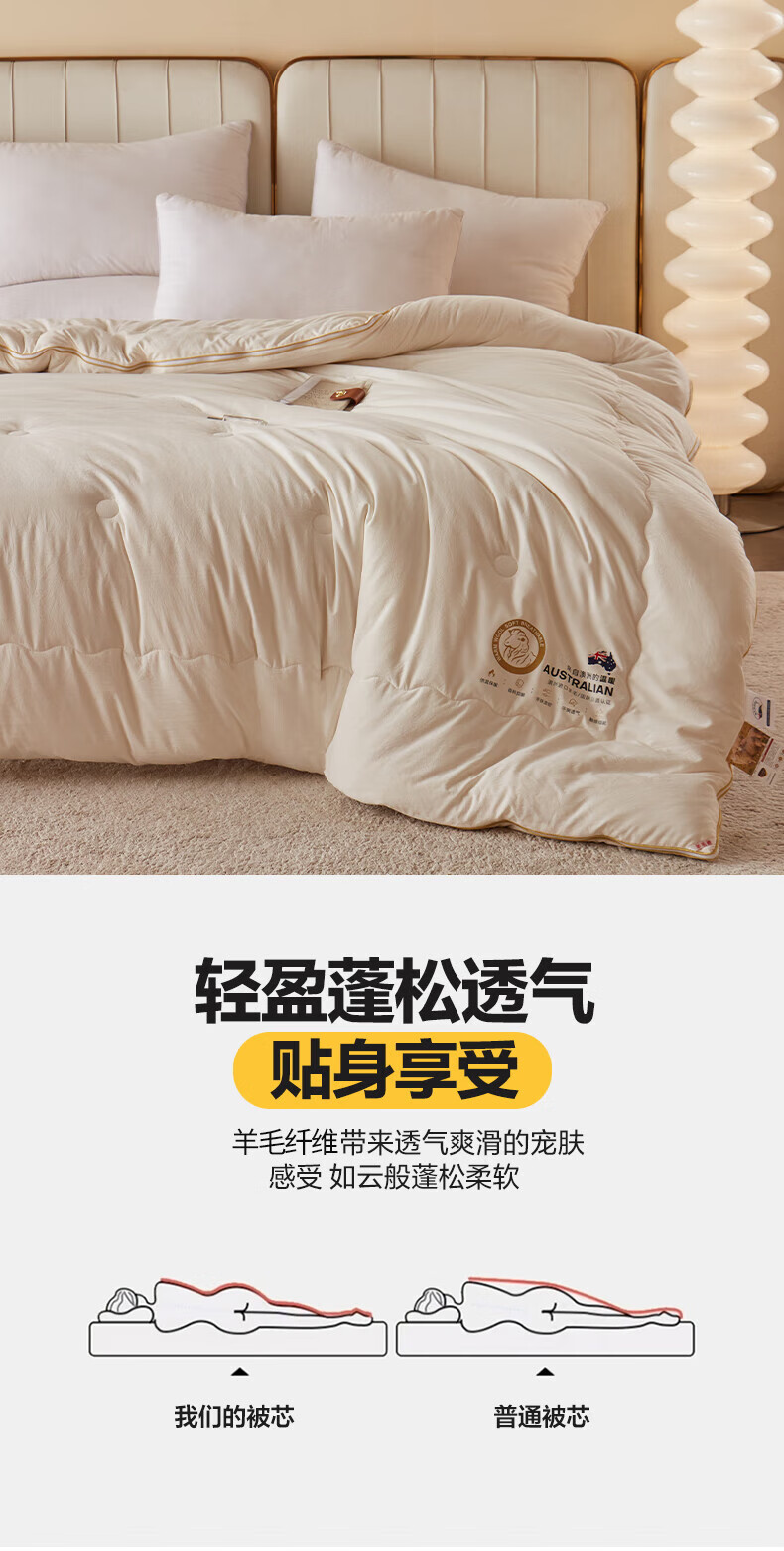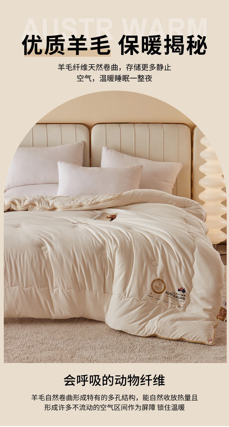 恒源祥澳洲进口羊毛被冬季被子冬被加厚保暖全棉春秋被芯双人8-10斤棉被 白色 150*200-【3斤空调被】+【6斤春秋被】