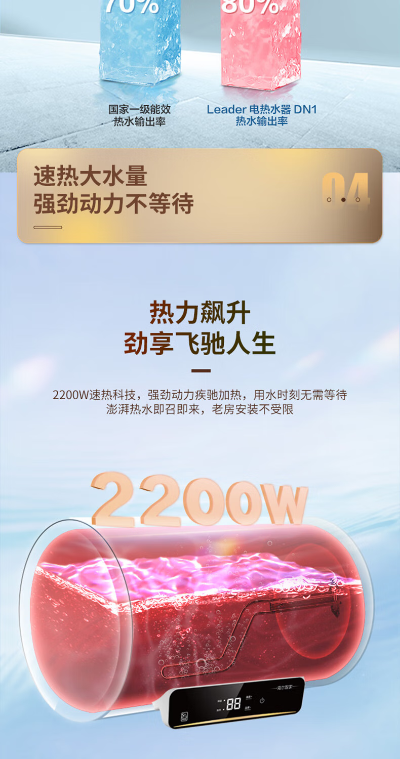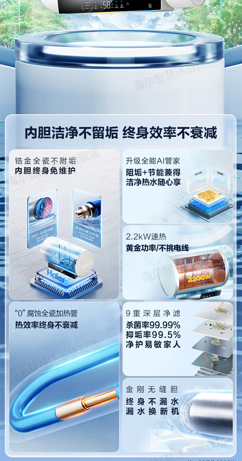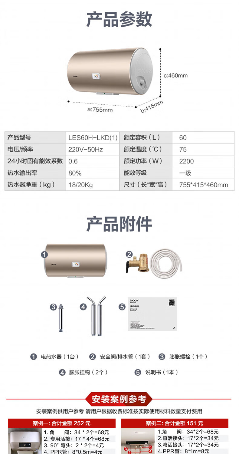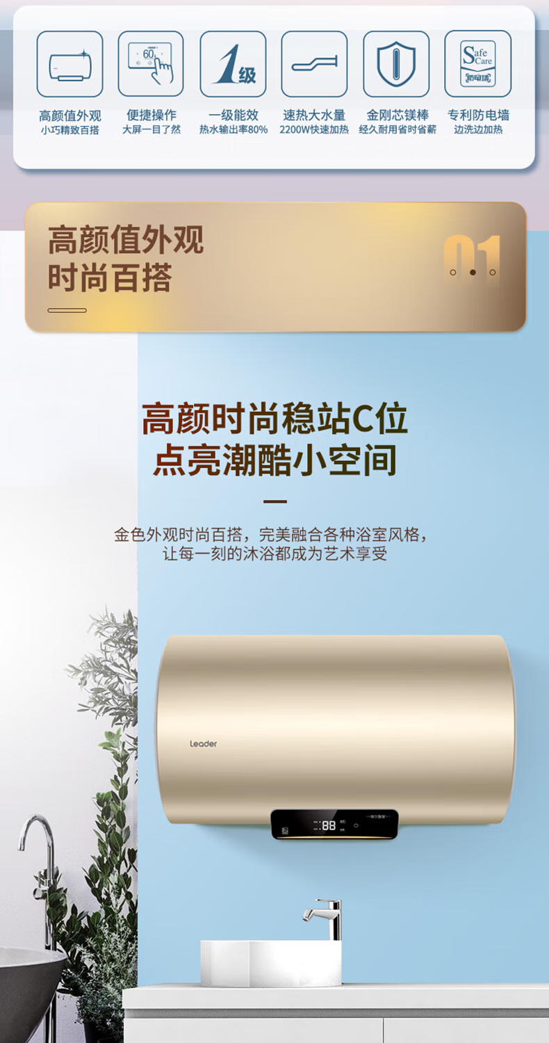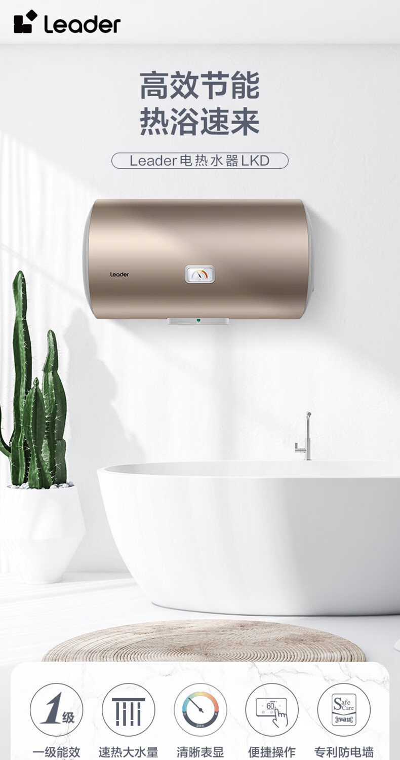 海尔(Haier)储水式电热水器电家用速热一级能效节能家用安全加长防电墙智能家电6重防护上门安装Leader系列 60L 2200W 锆金全瓷/内胆免洗/镁棒免更换