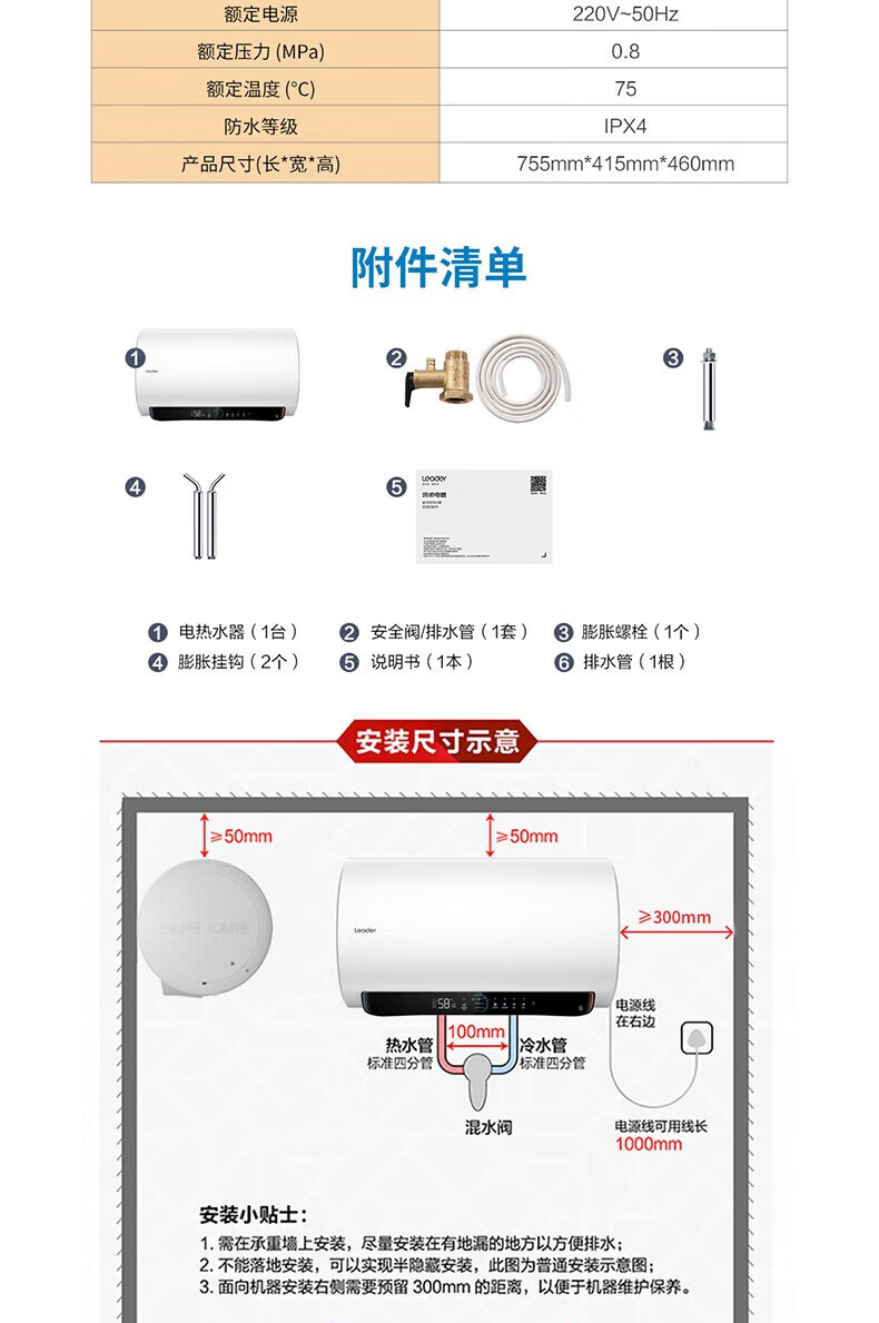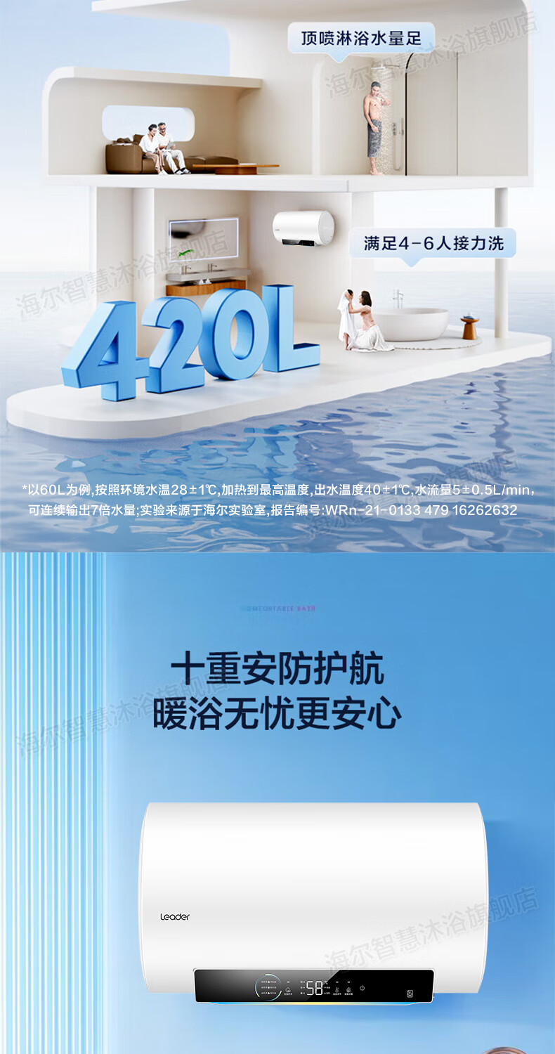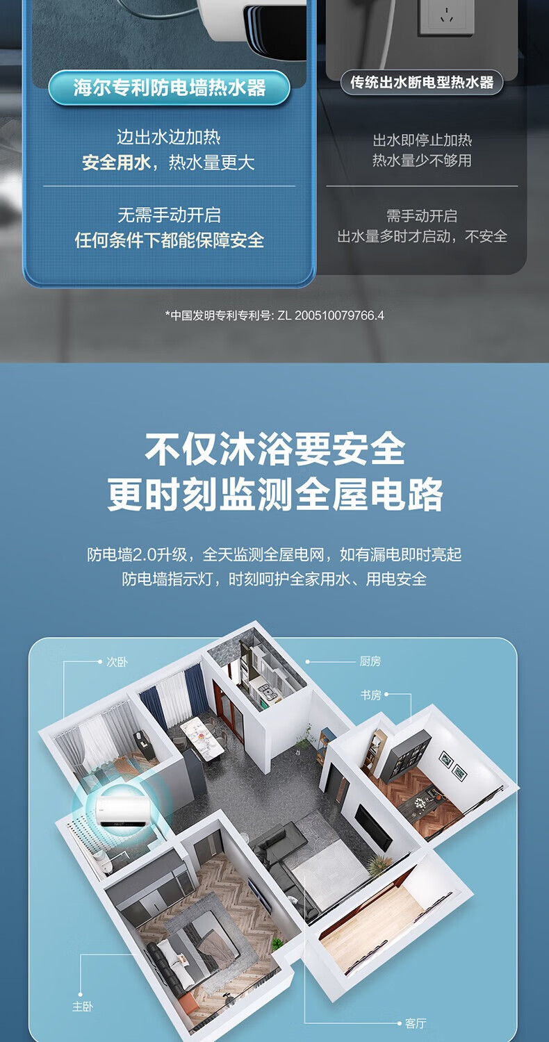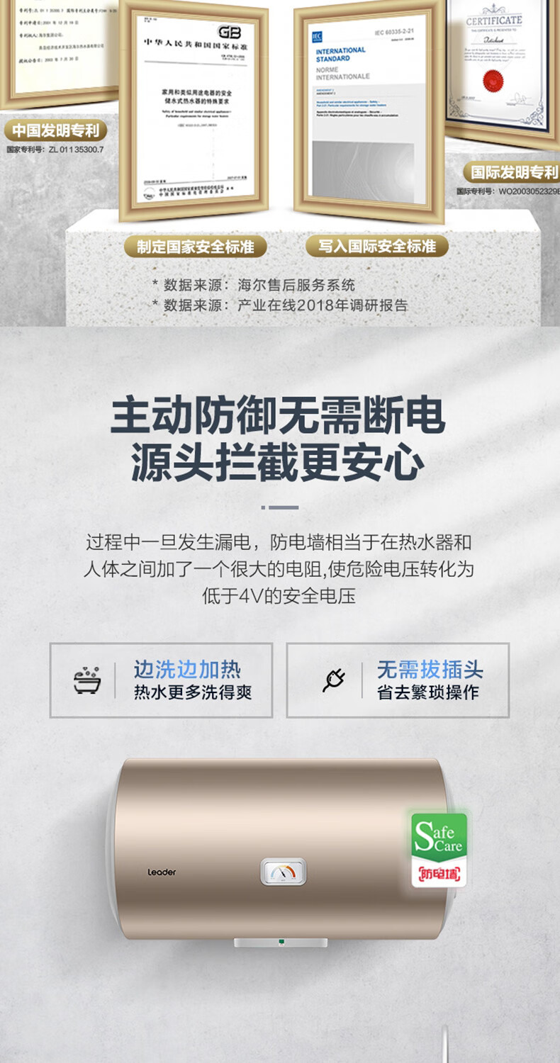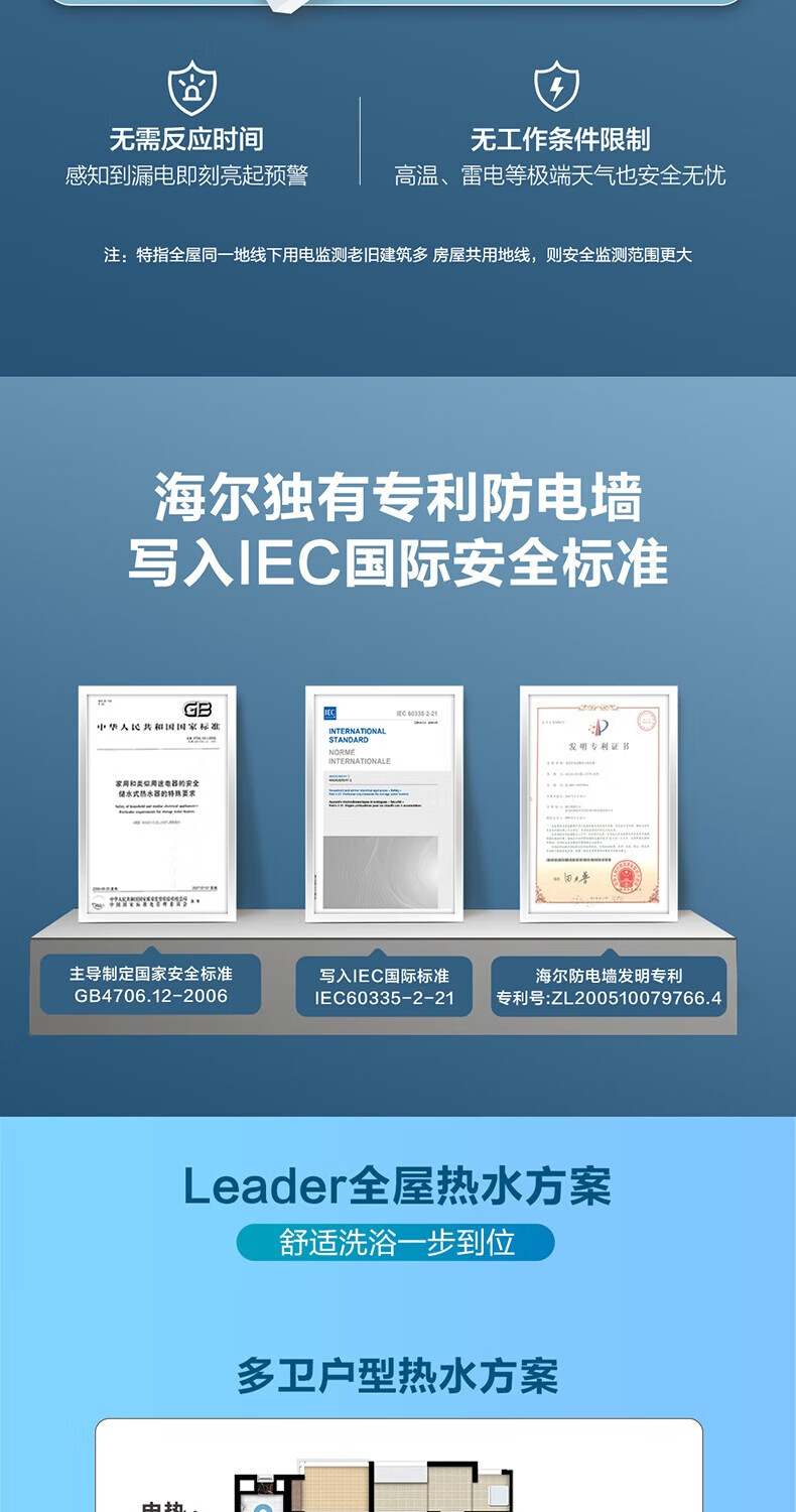 海尔(Haier)储水式电热水器电家用速热一级能效节能家用安全加长防电墙智能家电6重防护上门安装Leader系列 60L 2200W 锆金全瓷/内胆免洗/镁棒免更换