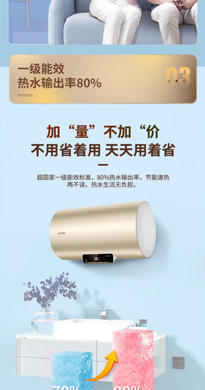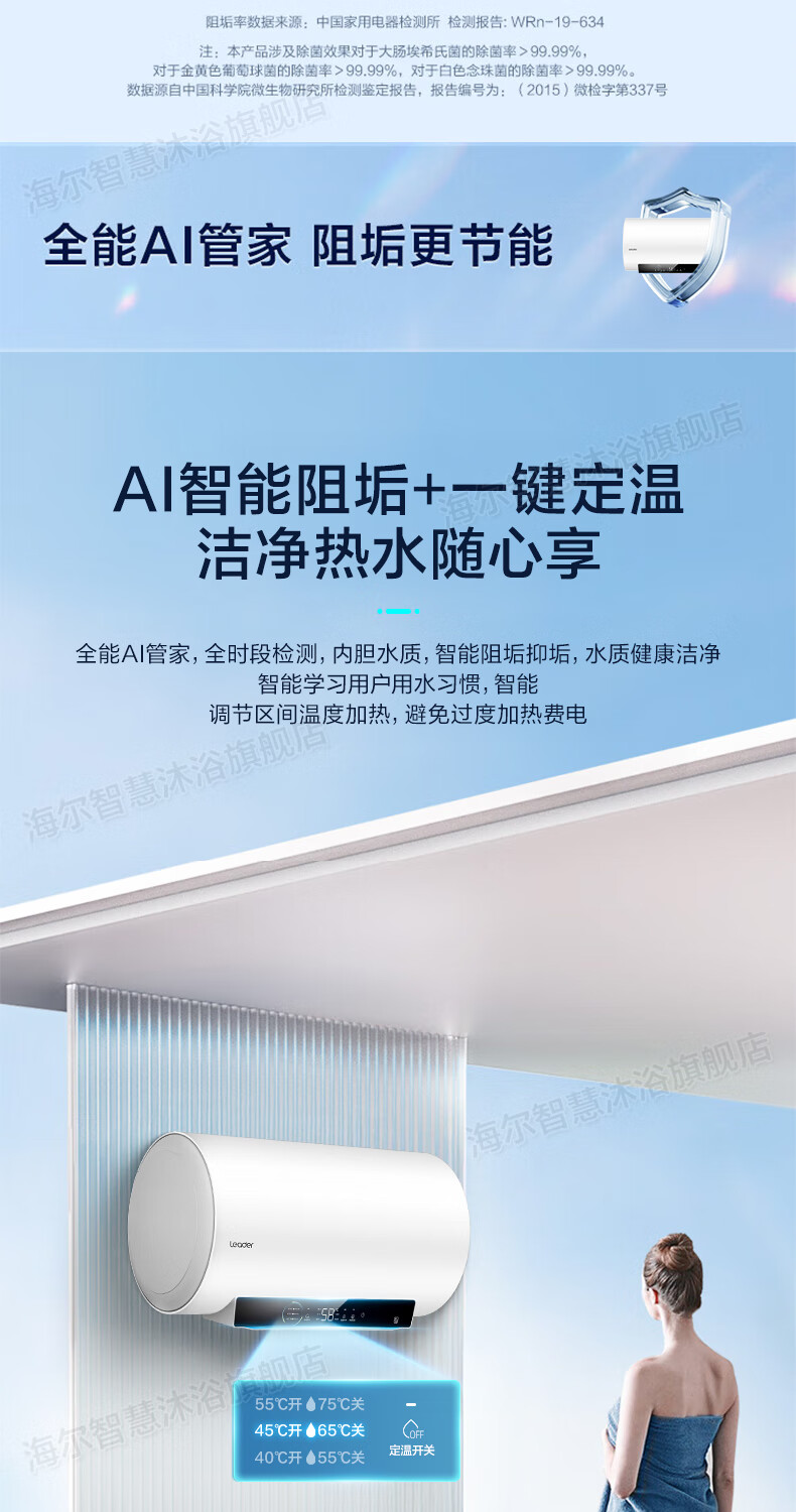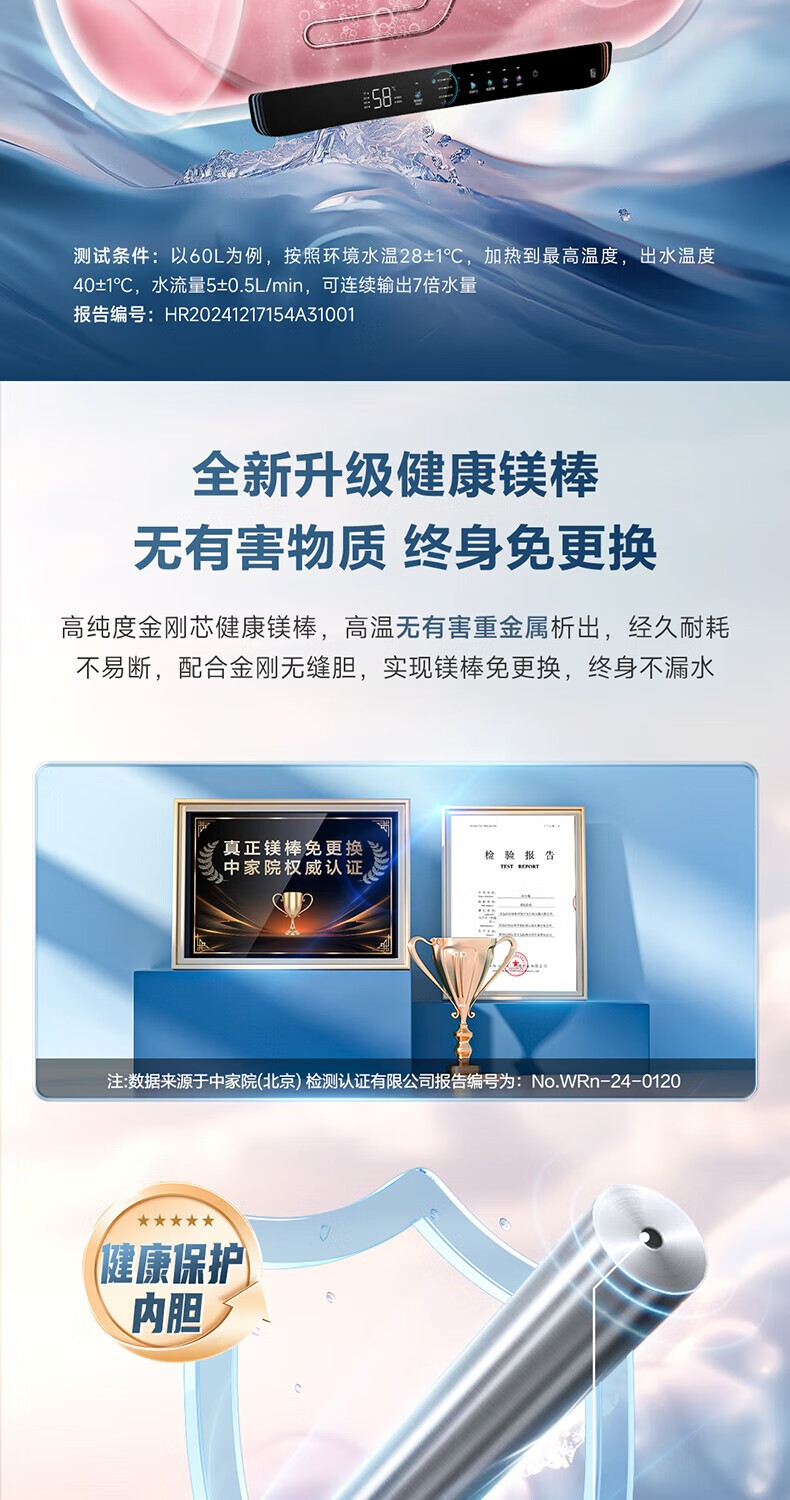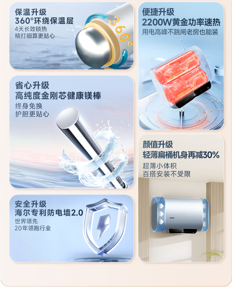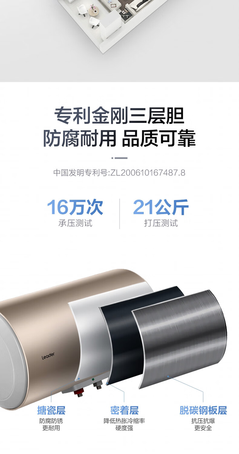 海尔(Haier)储水式电热水器电家用速热一级能效节能家用安全加长防电墙智能家电6重防护上门安装Leader系列 60L 2200W 锆金全瓷/内胆免洗/镁棒免更换