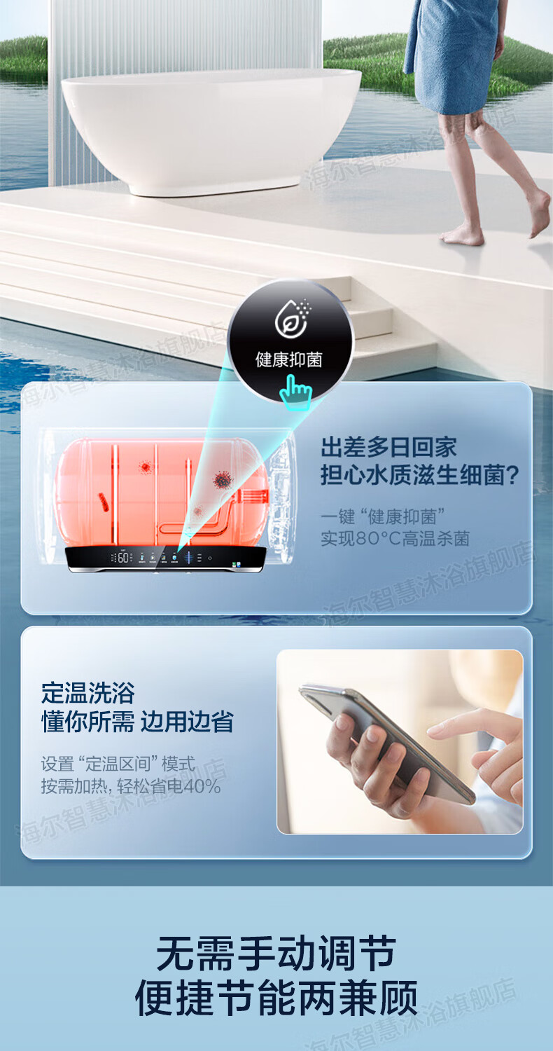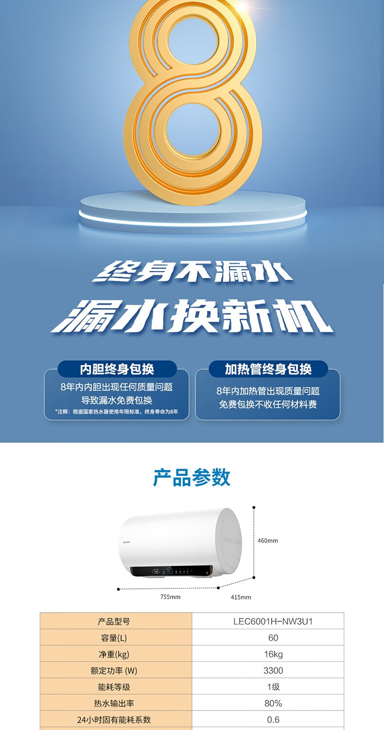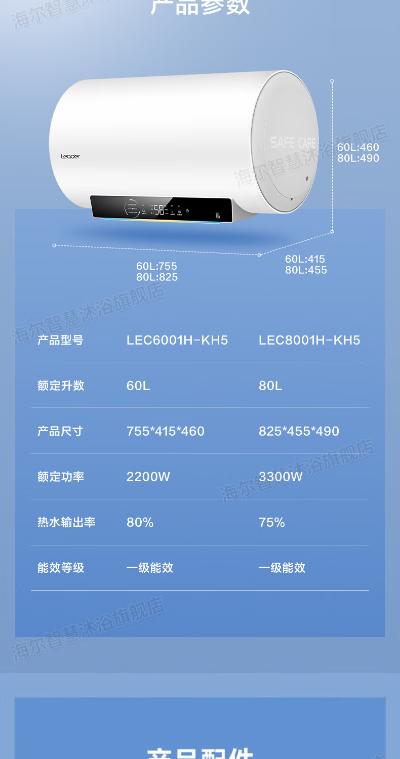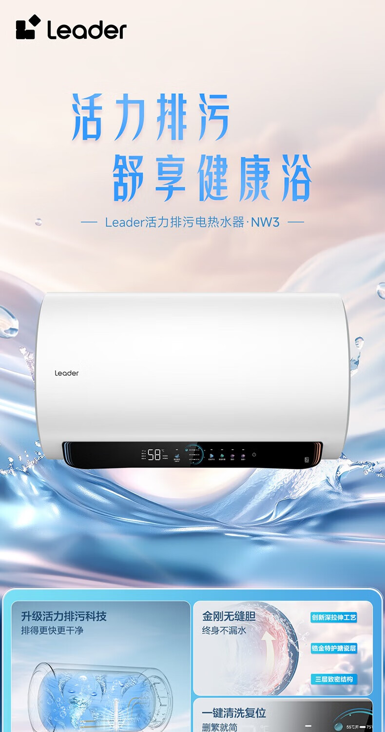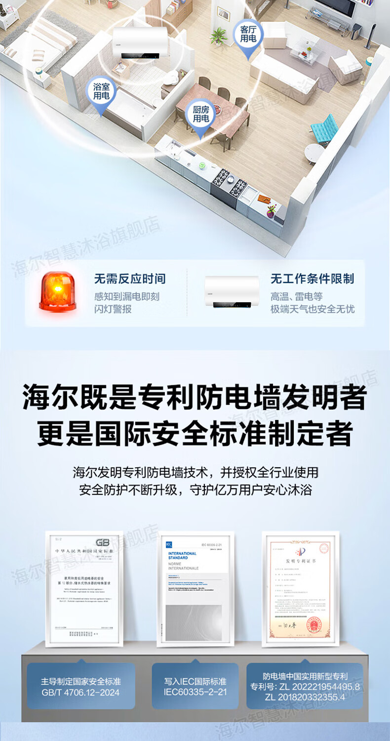 海尔(Haier)储水式电热水器电家用速热一级能效节能家用安全加长防电墙智能家电6重防护上门安装Leader系列 60L 2200W 锆金全瓷/内胆免洗/镁棒免更换
