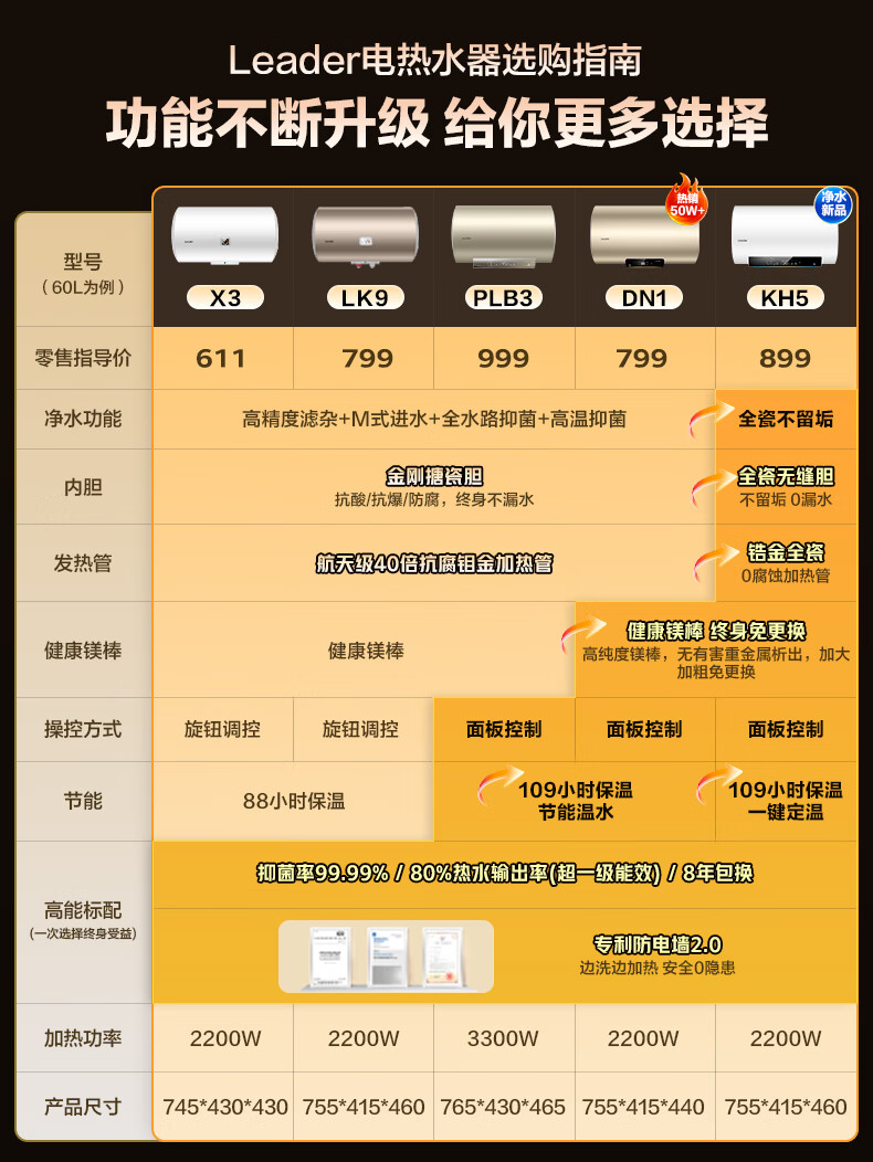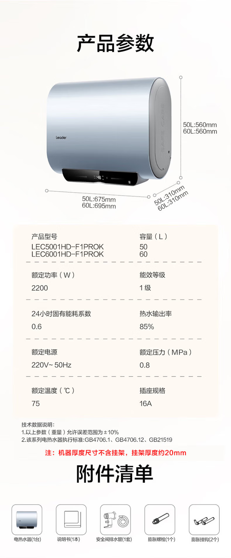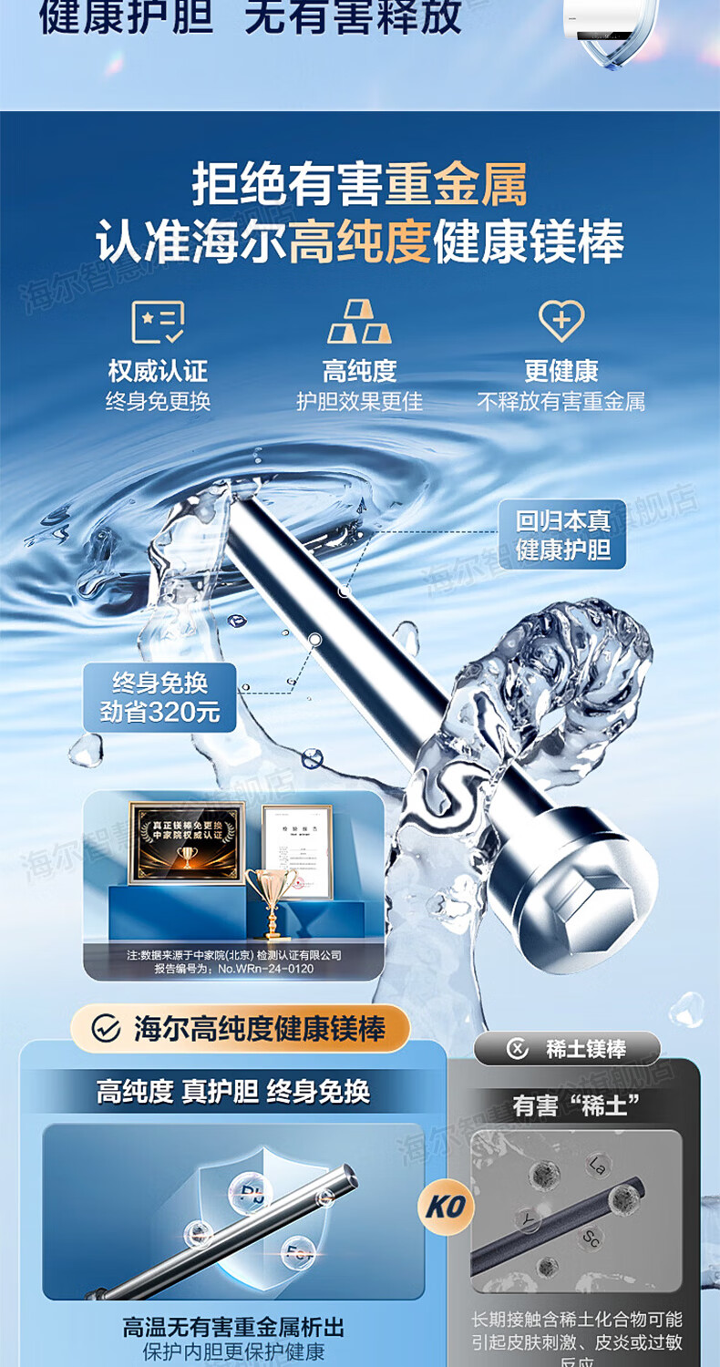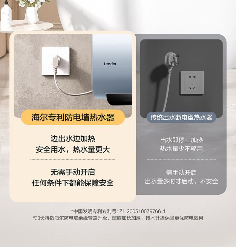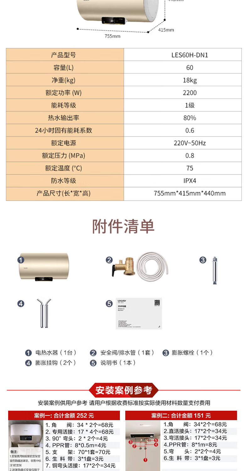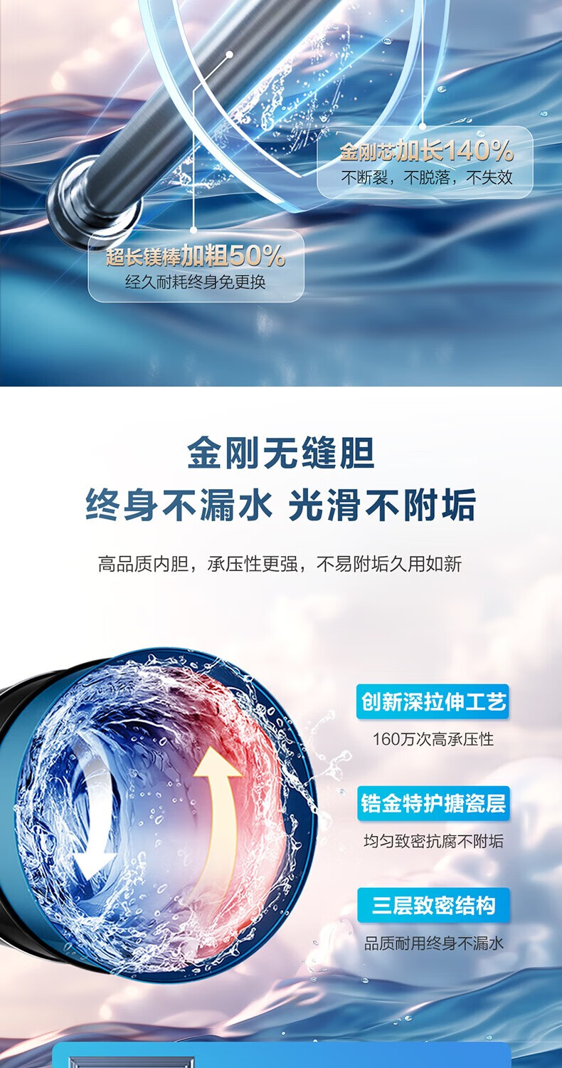 海尔(Haier)储水式电热水器电家用速热一级能效节能家用安全加长防电墙智能家电6重防护上门安装Leader系列 60L 2200W 锆金全瓷/内胆免洗/镁棒免更换