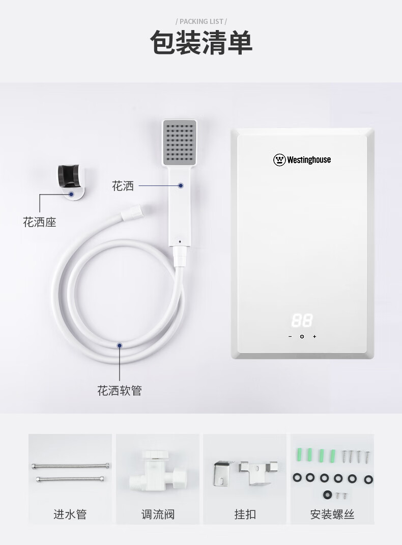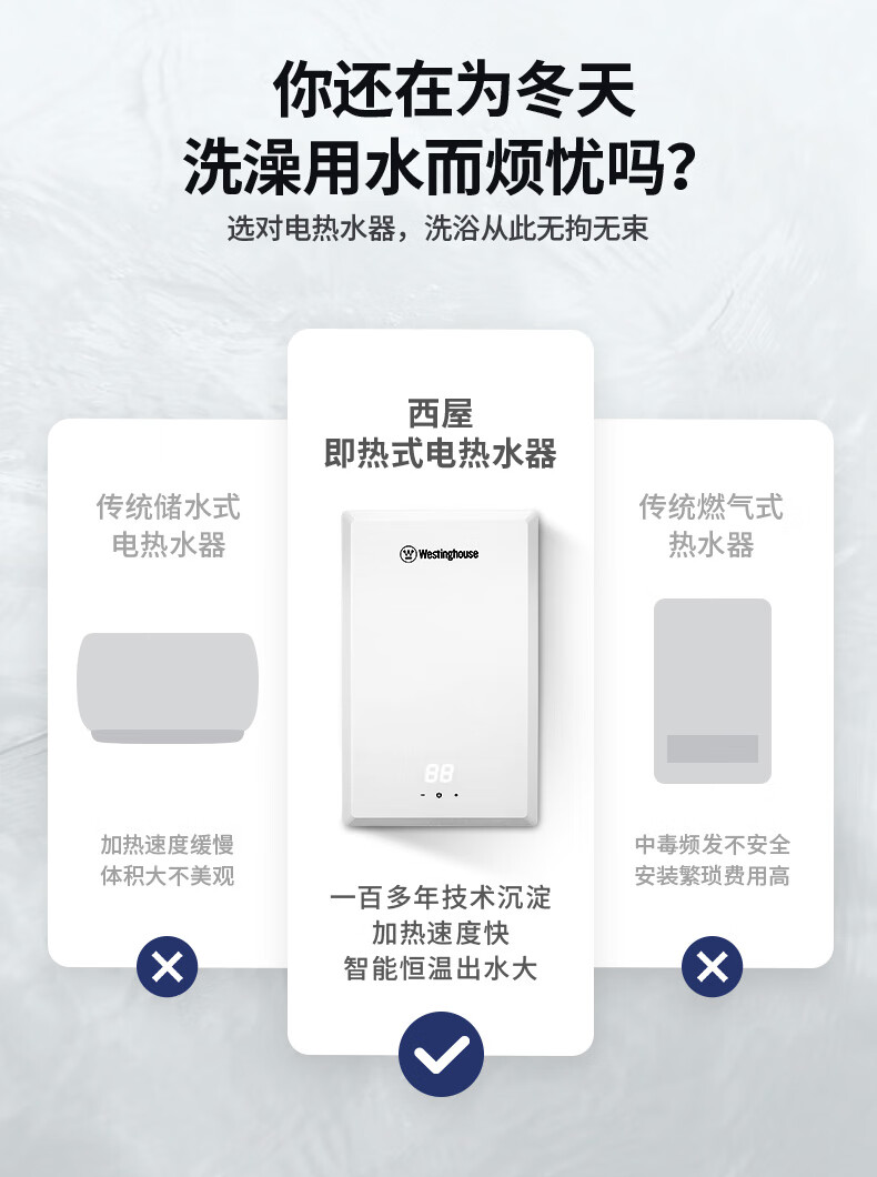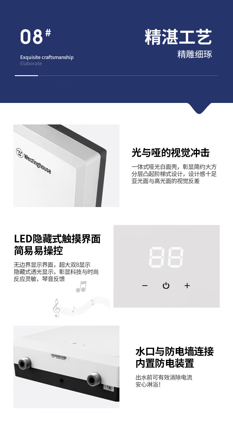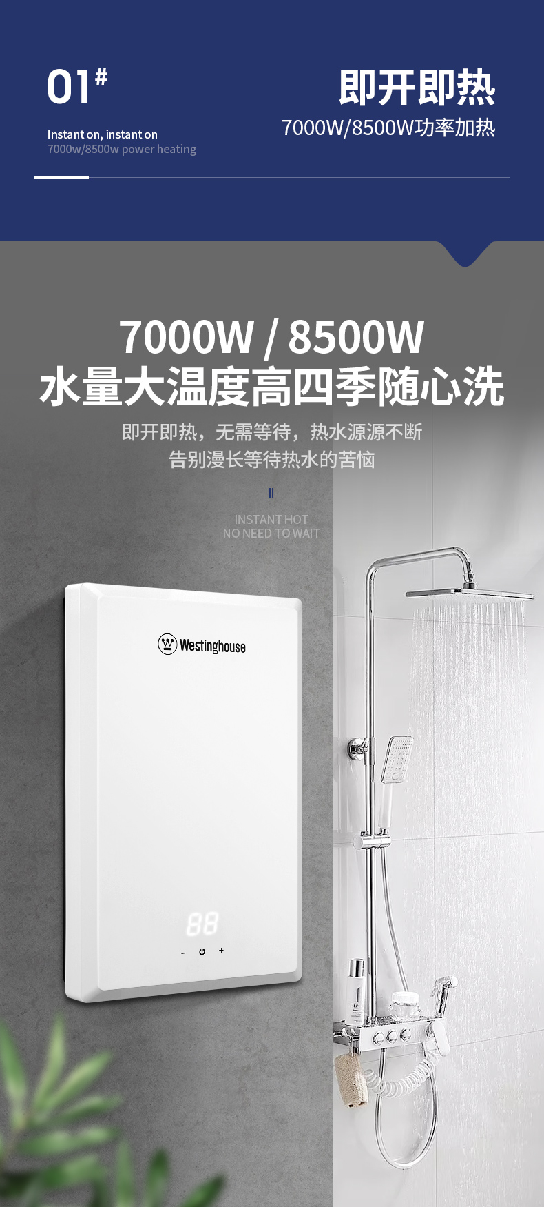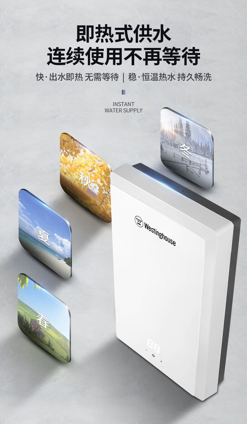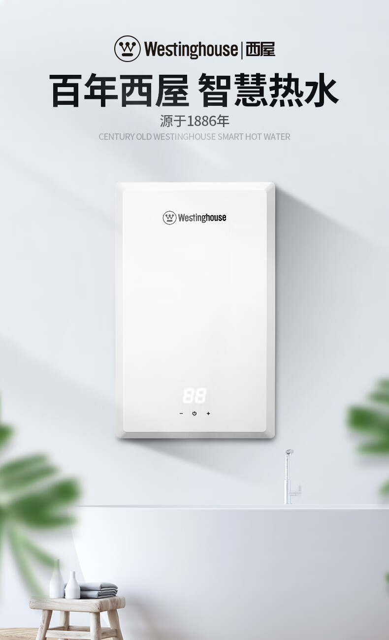 西屋(Westinghouse)即热式电热水器 过水热智能恒温速热扁桶无内胆免储水淋浴洗澡机白 8500W 【免储水】白色超薄