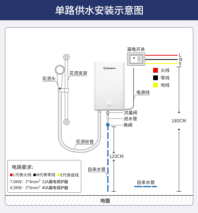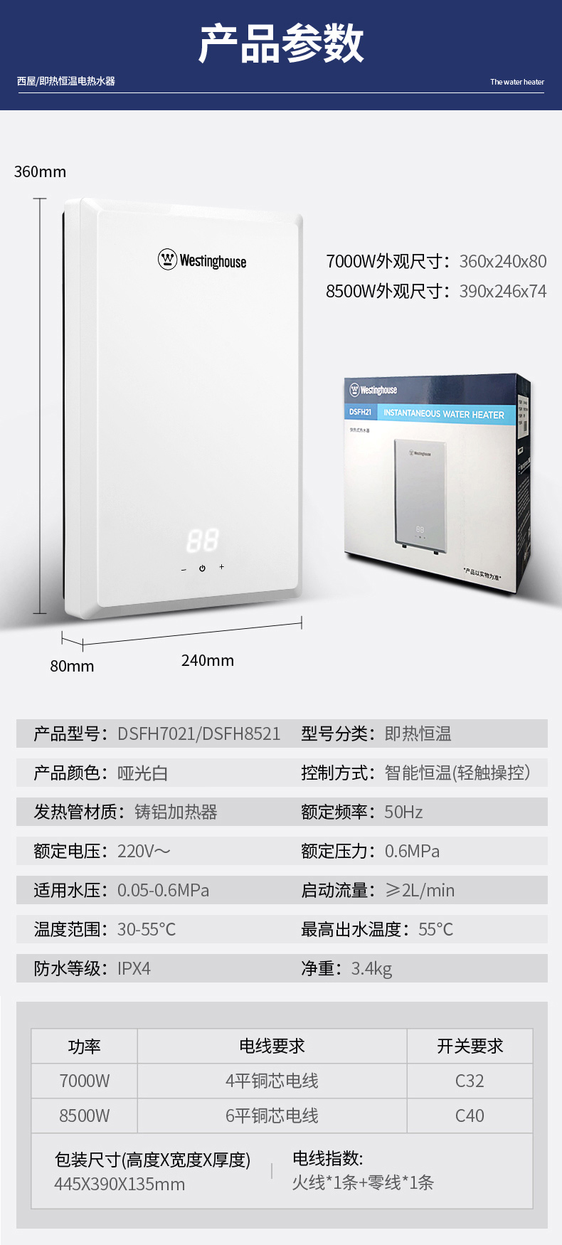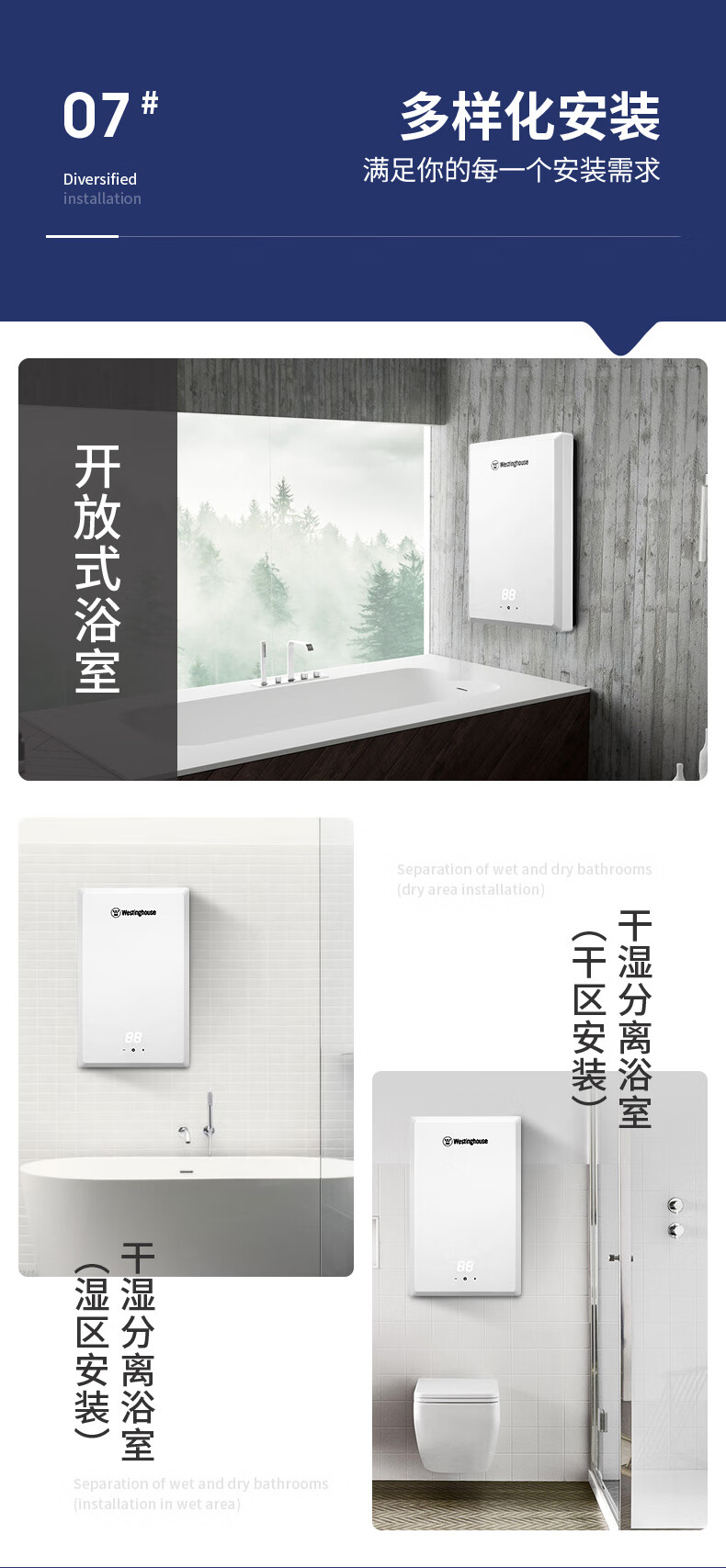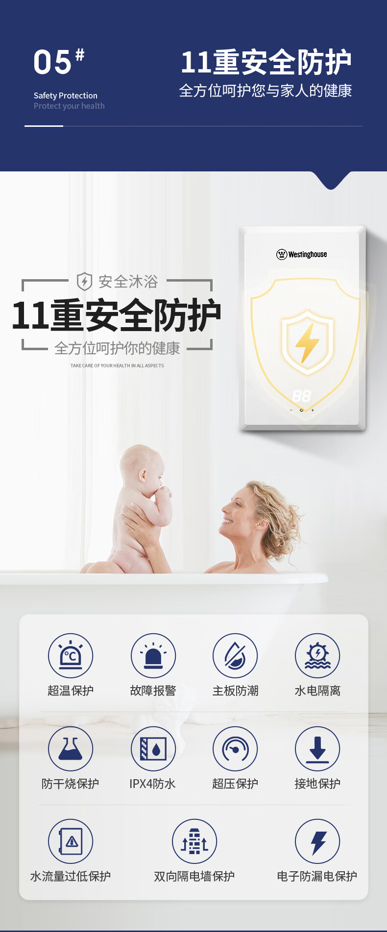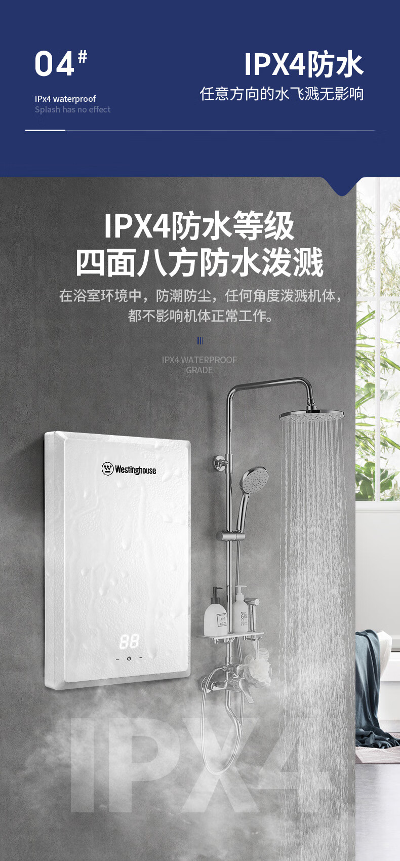西屋(Westinghouse)即热式电热水器 过水热智能恒温速热扁桶无内胆免储水淋浴洗澡机白 8500W 【免储水】白色超薄