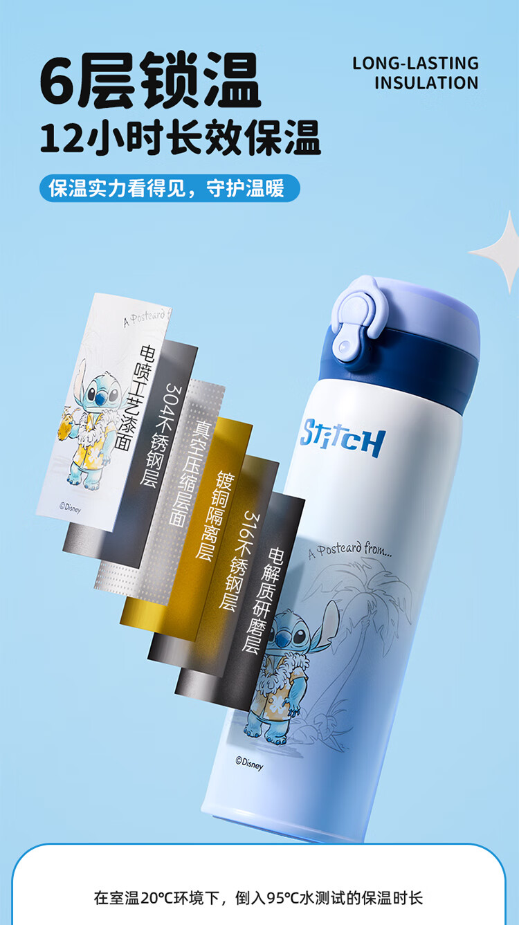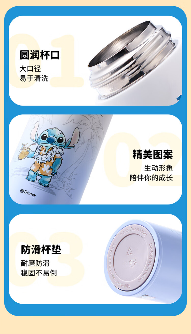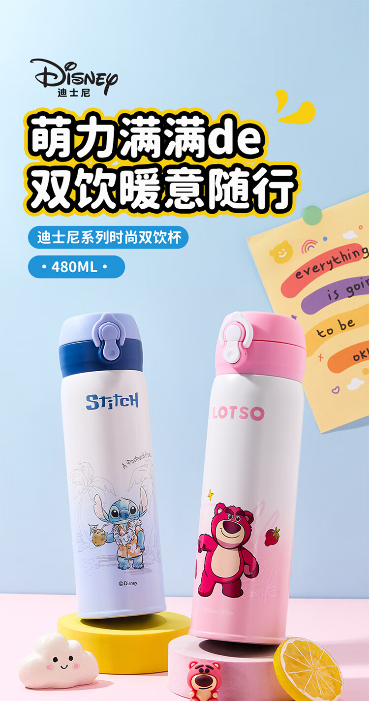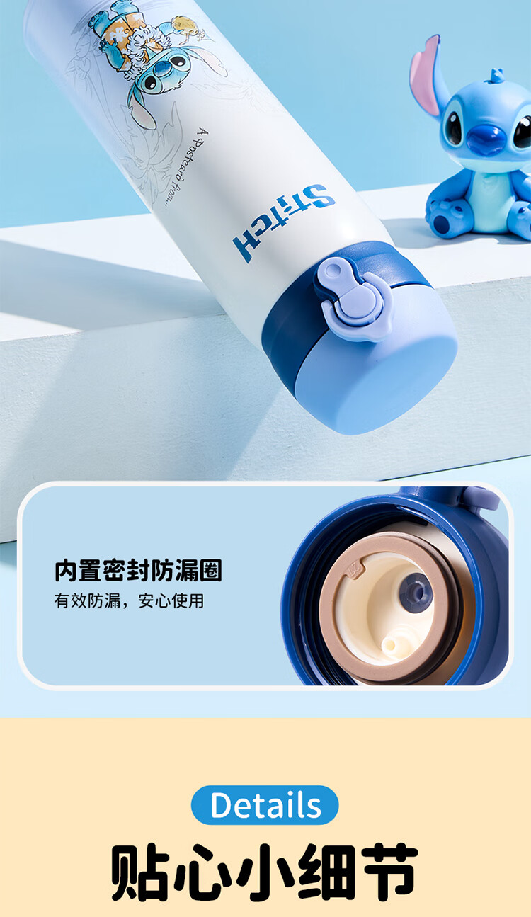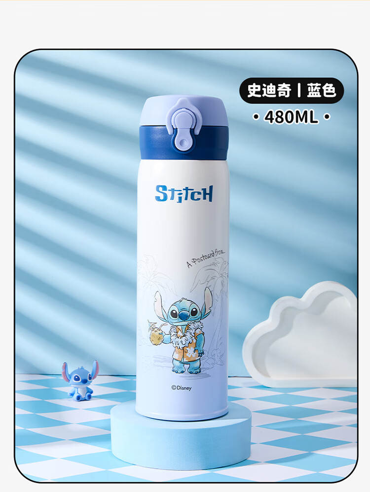 迪士尼(Disney)儿童保温杯可爱高颜值不锈钢双饮杯直饮杯男女小学生上学用水杯 史迪奇双饮杯 480ml