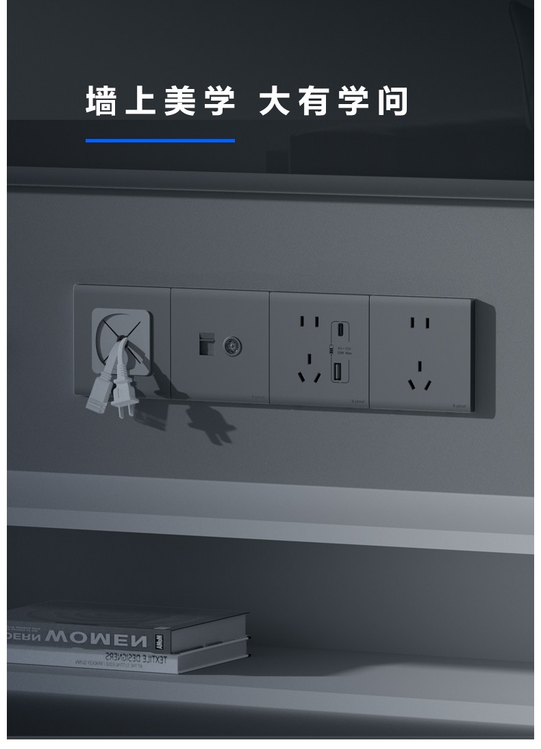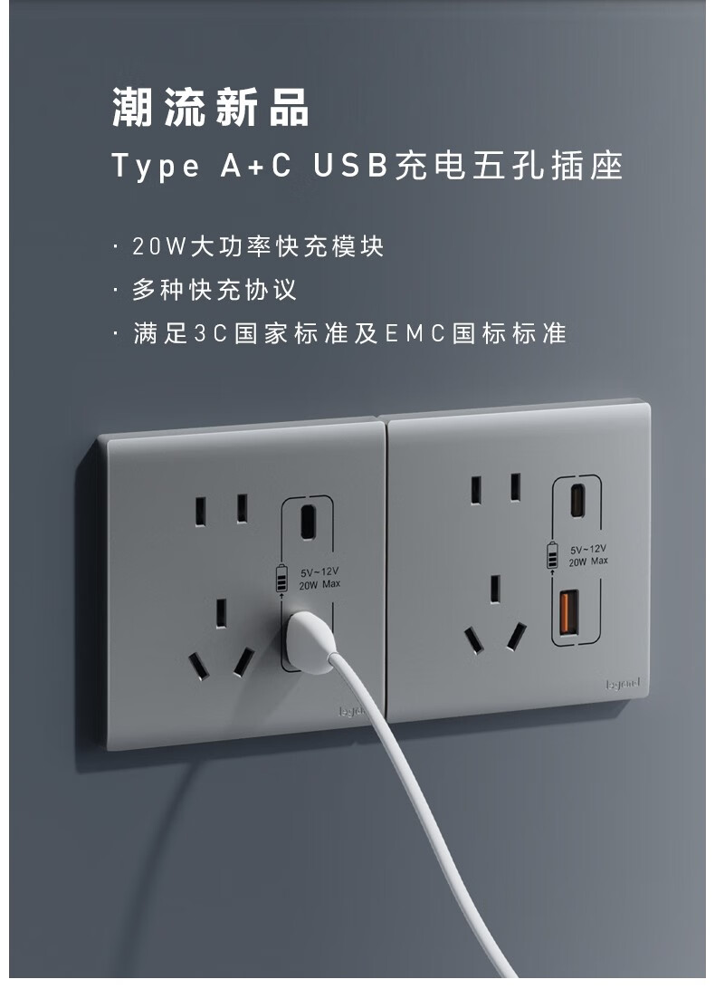 罗格朗 开关插座面板简悦深砂银多孔家用五孔86型暗装5孔墙壁电源电脑插 Type A+C USB充电插座 20W